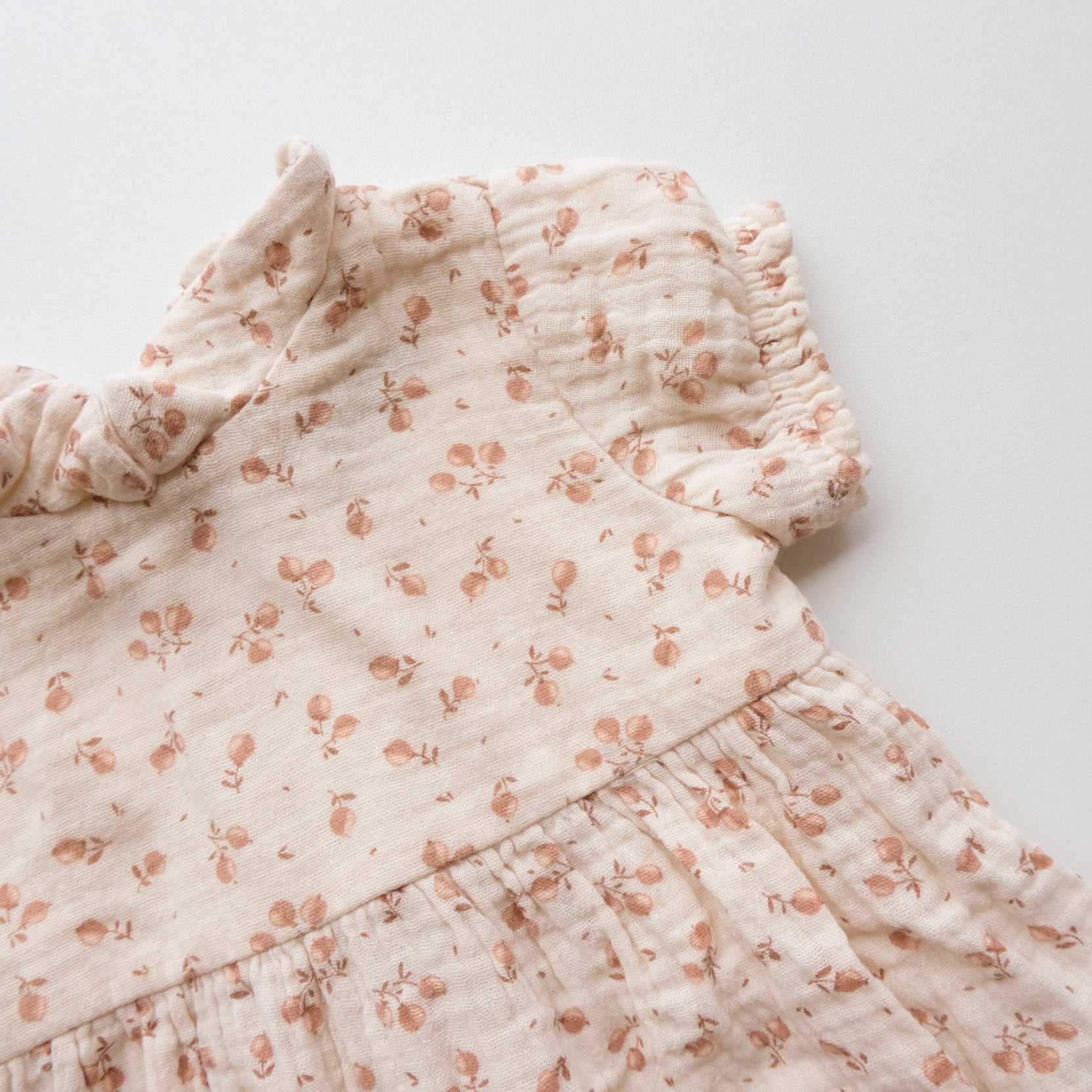 Barboteuse, combicourt en gaze de coton, coloris beige imprimé fleuri all over. Joli petit col. Boutonnière au dos et boutons pressions à l'entrejambe. Très mignonne !