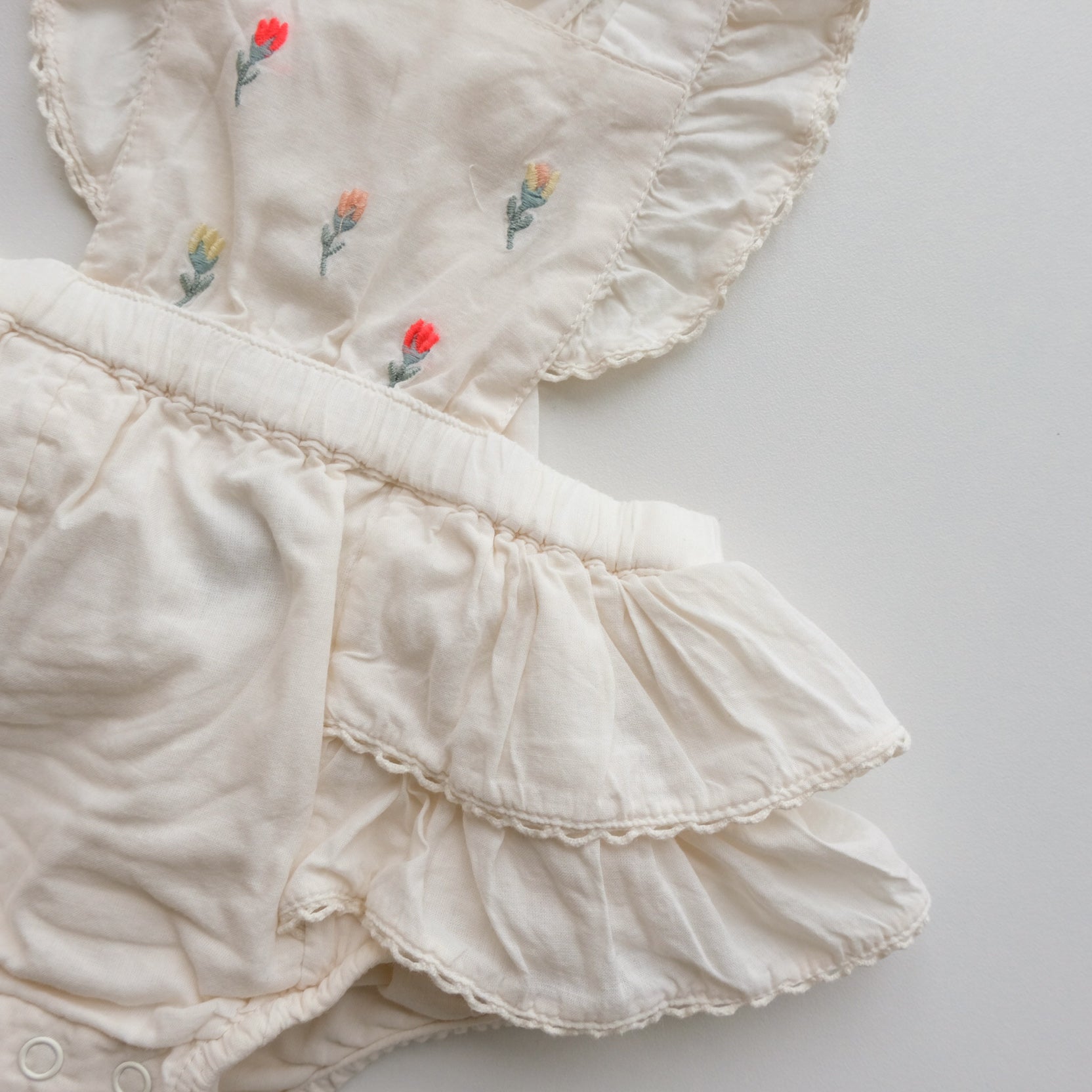 Barboteuse, bloomer à bretelles volantées croisées dans le dos. Coloris écru, broderies fleuries au devant. Très bohème. Magnifique !