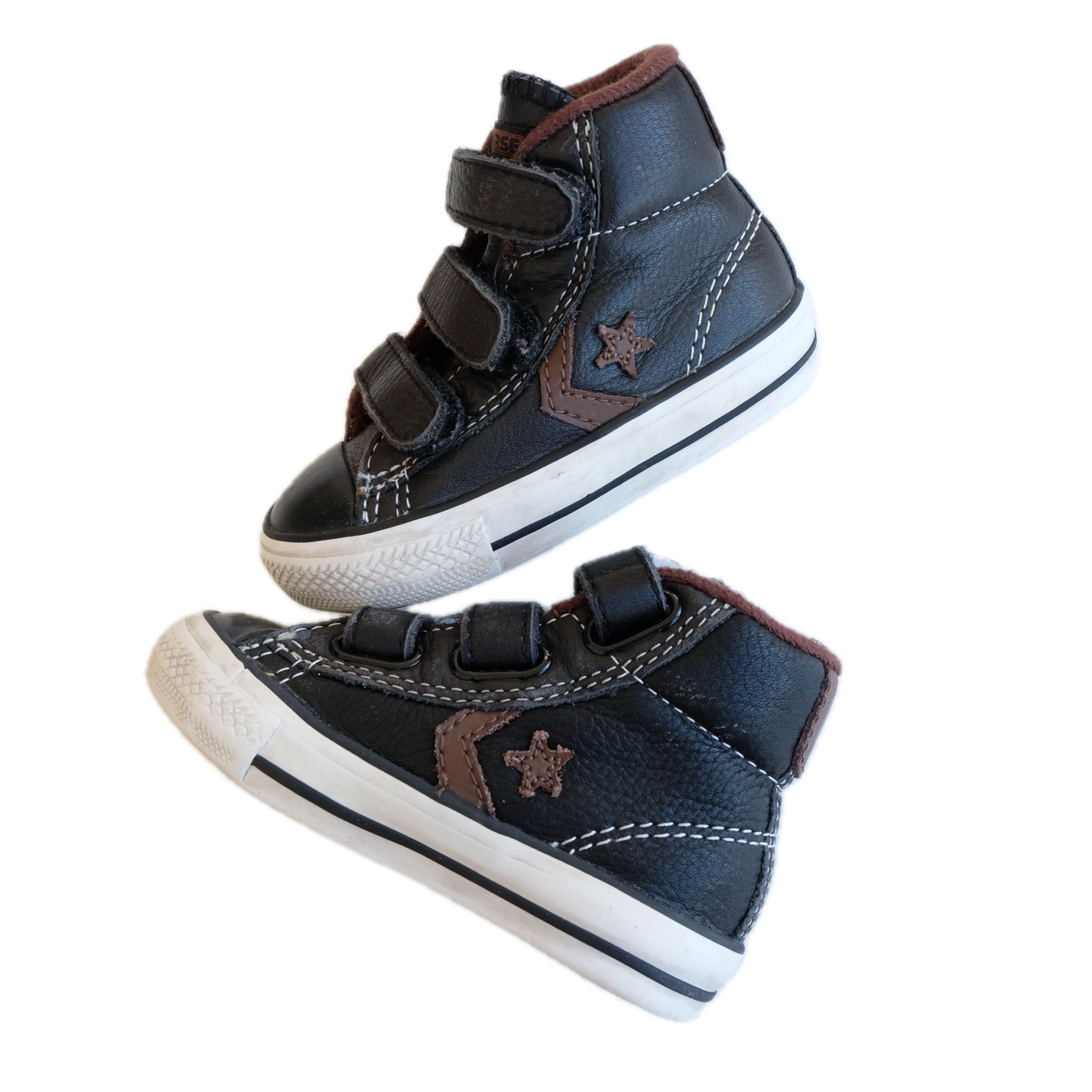 Paire de baskets en cuir, coloris noir et marron foncé. 3 scratch. en très bon état, pas d'usure de la semelle. Elles méritent amplement une seconde vie !
