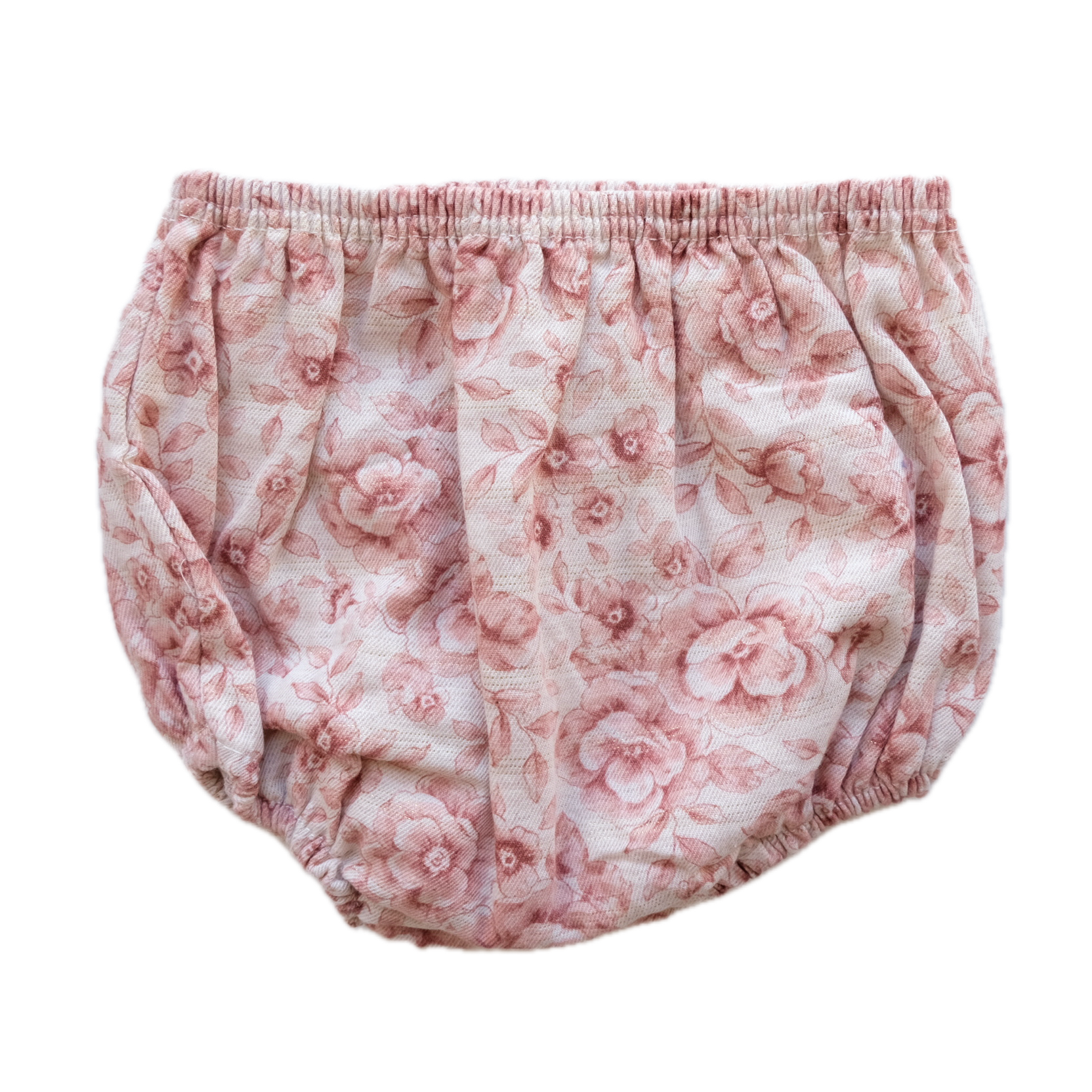 Bloomer en coton, coloris rose pâle, imprimé fleurs romantiques all over. Détails fils fins dorés très discrets.