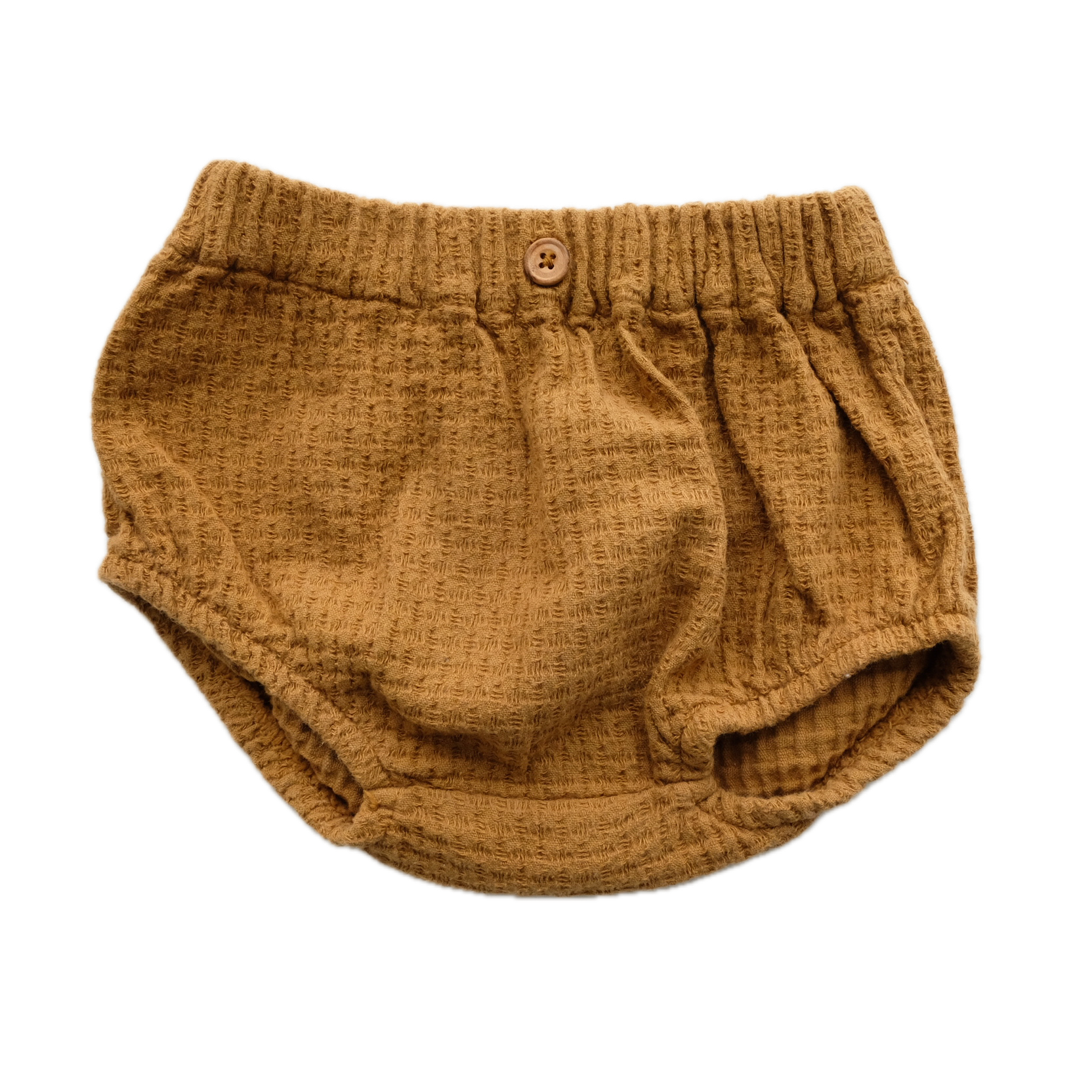 Bloomer en coton gaufré, coloris marron camel uni. Mixte. Petit bouton décoratif à la taille. Trop chou.