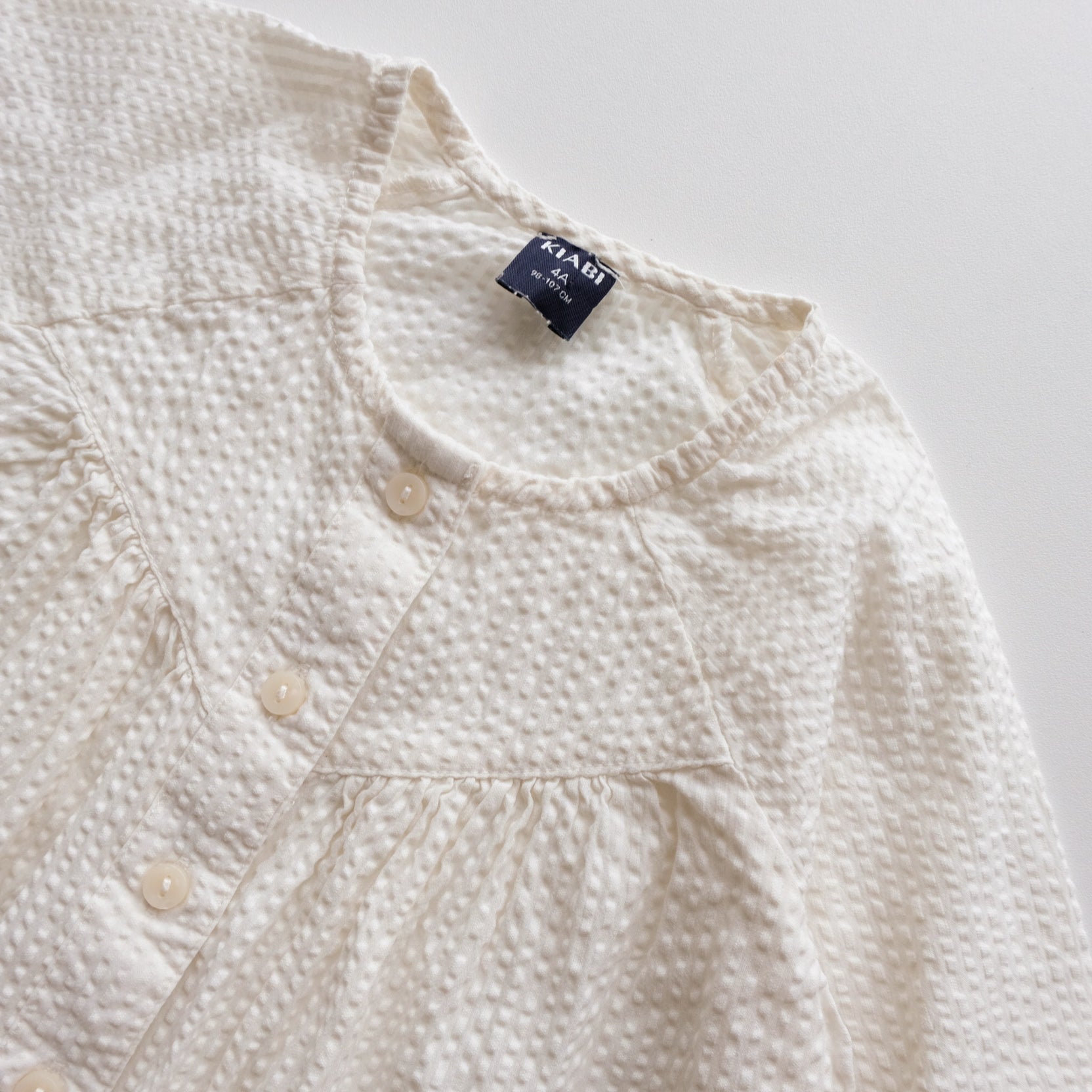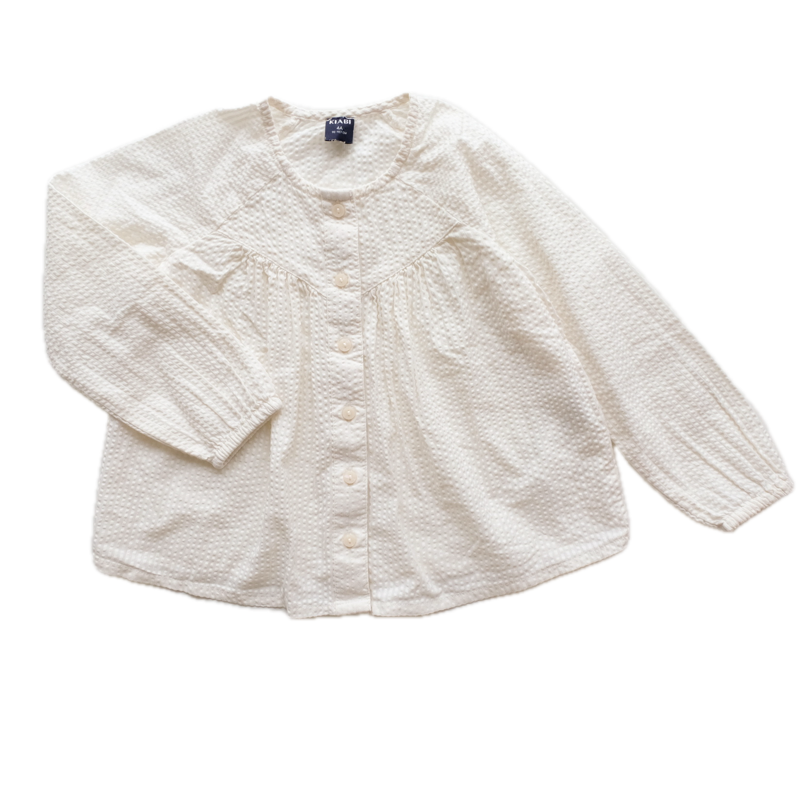 Blouse à manches longues en coton gaufré, coloris blanc cassé. Boutonnière au devant.