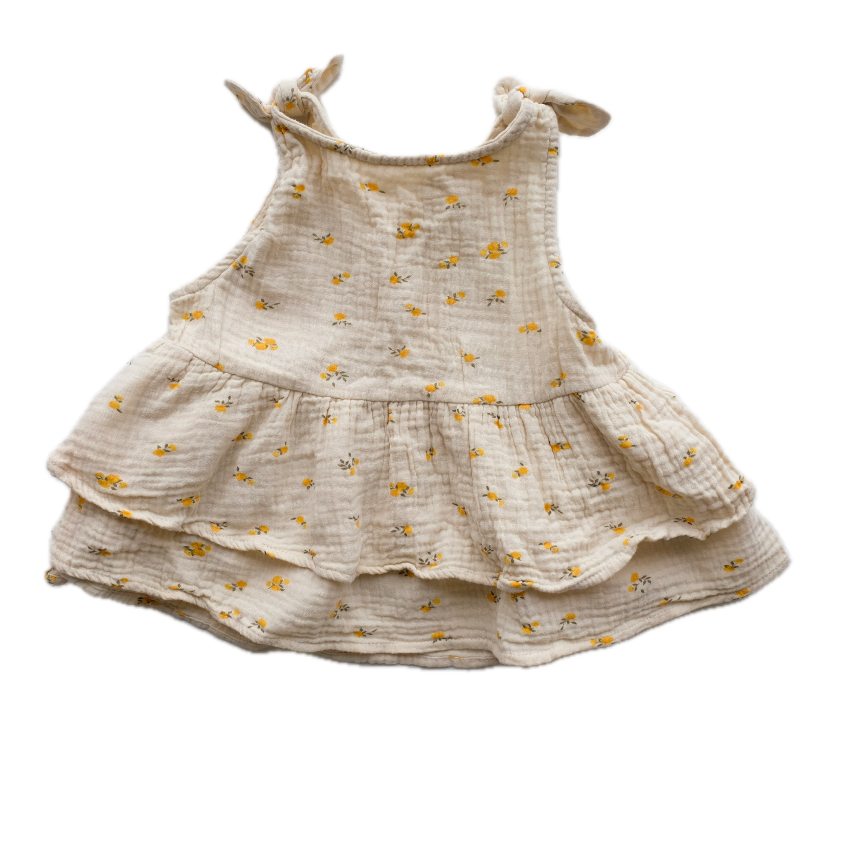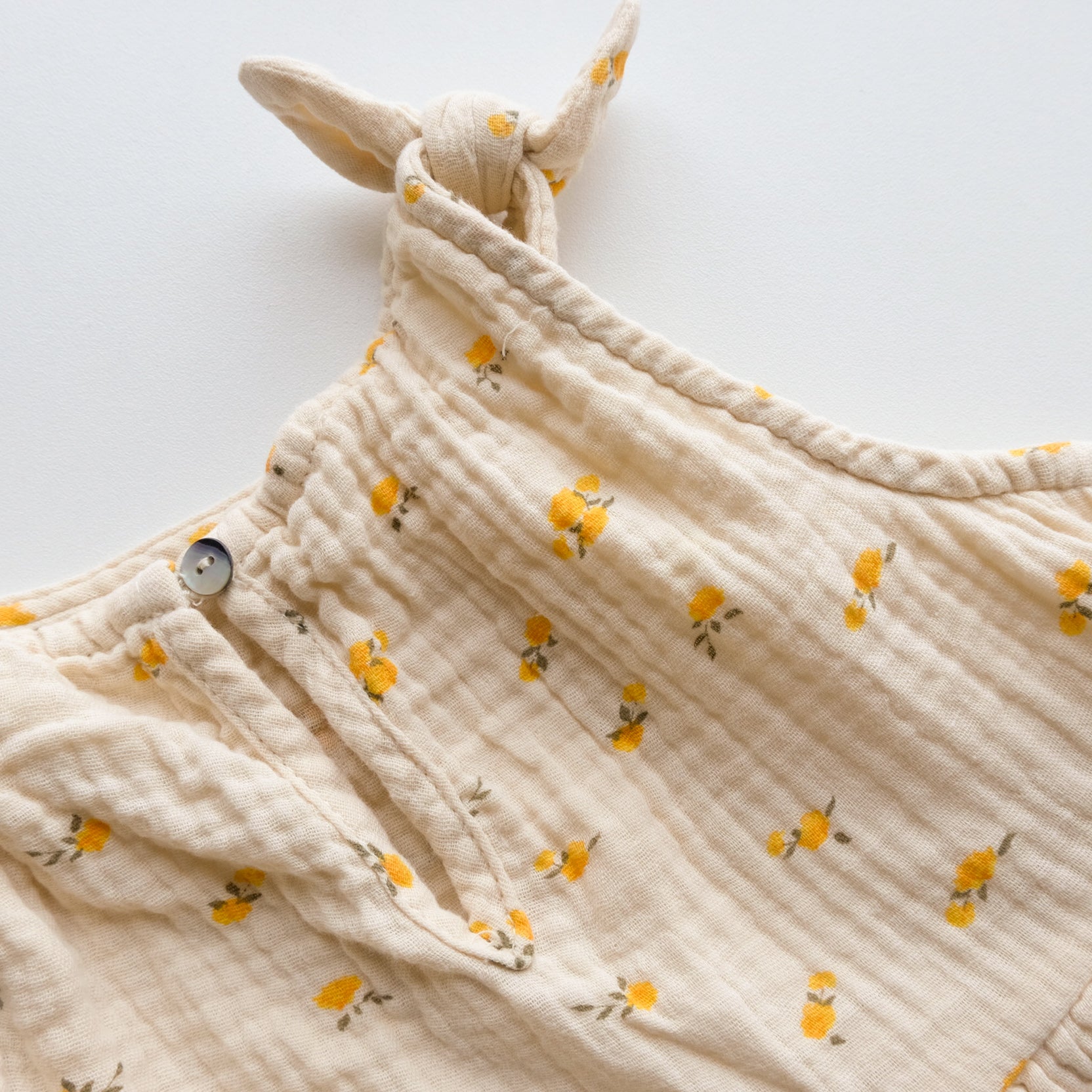 Blouse sans manches à bretelles, en mousseline de coton, coloris écru, imprimé fleur all over. Noeud fantaisie en haut des bretelles. Boutons oeillet nacré en haut du dos. Très jolie blouse !