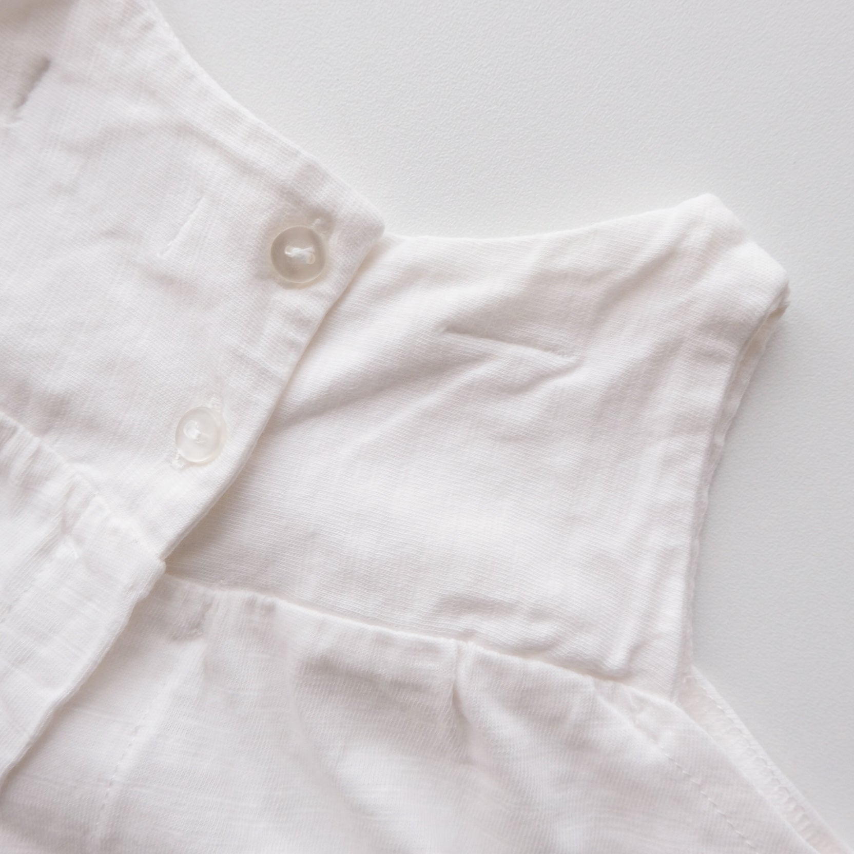 Petit t-shirt, blouse sans manches en coton, coloris blanc uni. Évasée dans le dos, fermeture par deux petits boutons au dos.