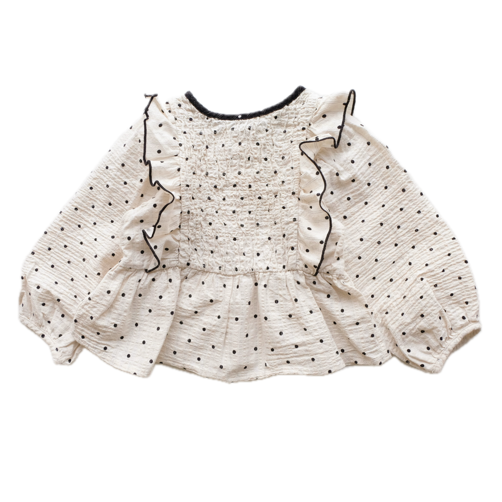 Blouse à manches longues en tissu gaufré, coloris écru et noir, imprimé pois noirs all over. Volants et smock au devant. Boutonnière au dos. Très mignonne !