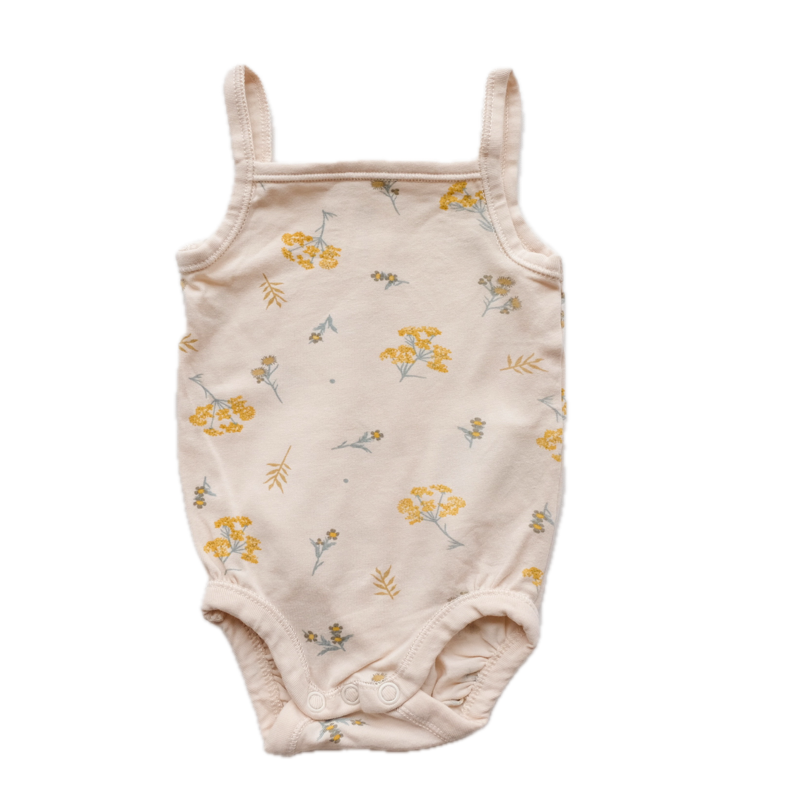 Body, débardeur à fines bretelles en coton biologique, coloris vanille, imprimé fleuri jaune all over. Trop mignon. Parfait pour les naissance en été.