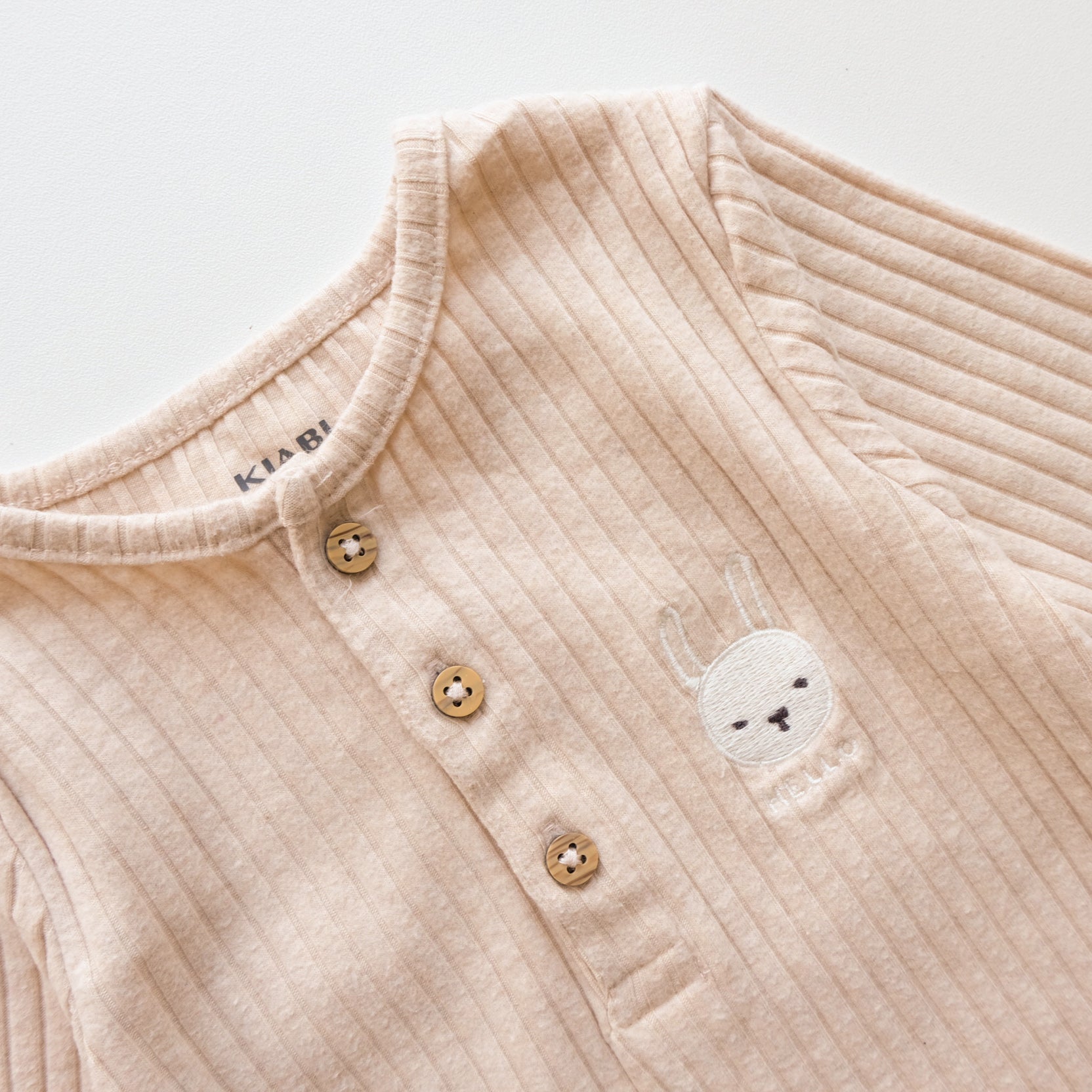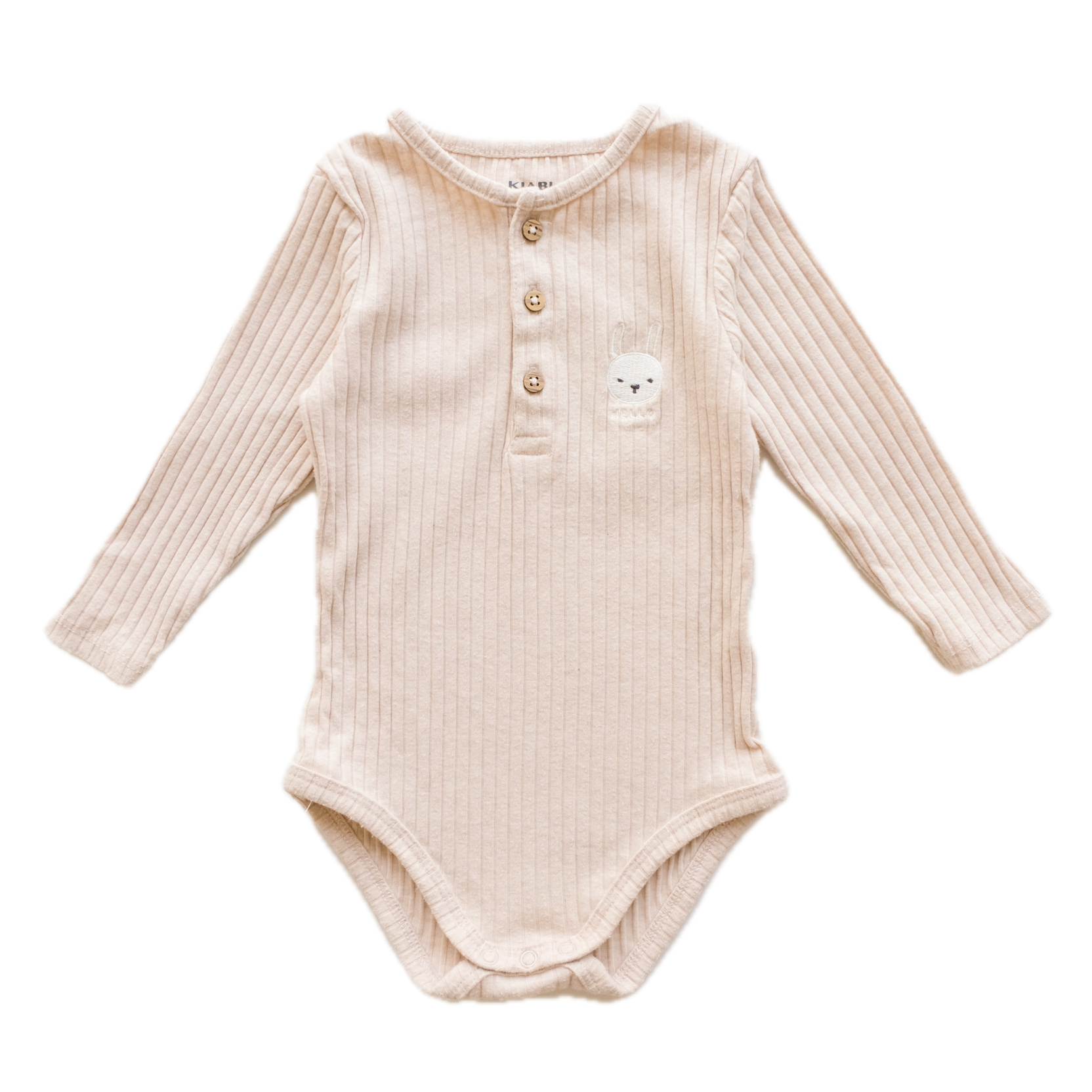 Body à manches longues en coton côtelé, coloris beige. Petit lapin blanc brodé au devant. boutonnière au niveau du col. Adorable ! Mixte.