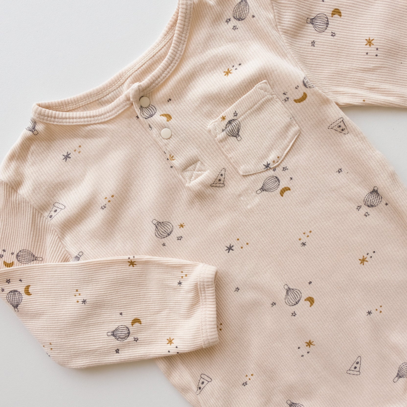 Body à manches longues en coton côtelé, coloris vanille. Imprimé montgolfière all over. Mixte.
