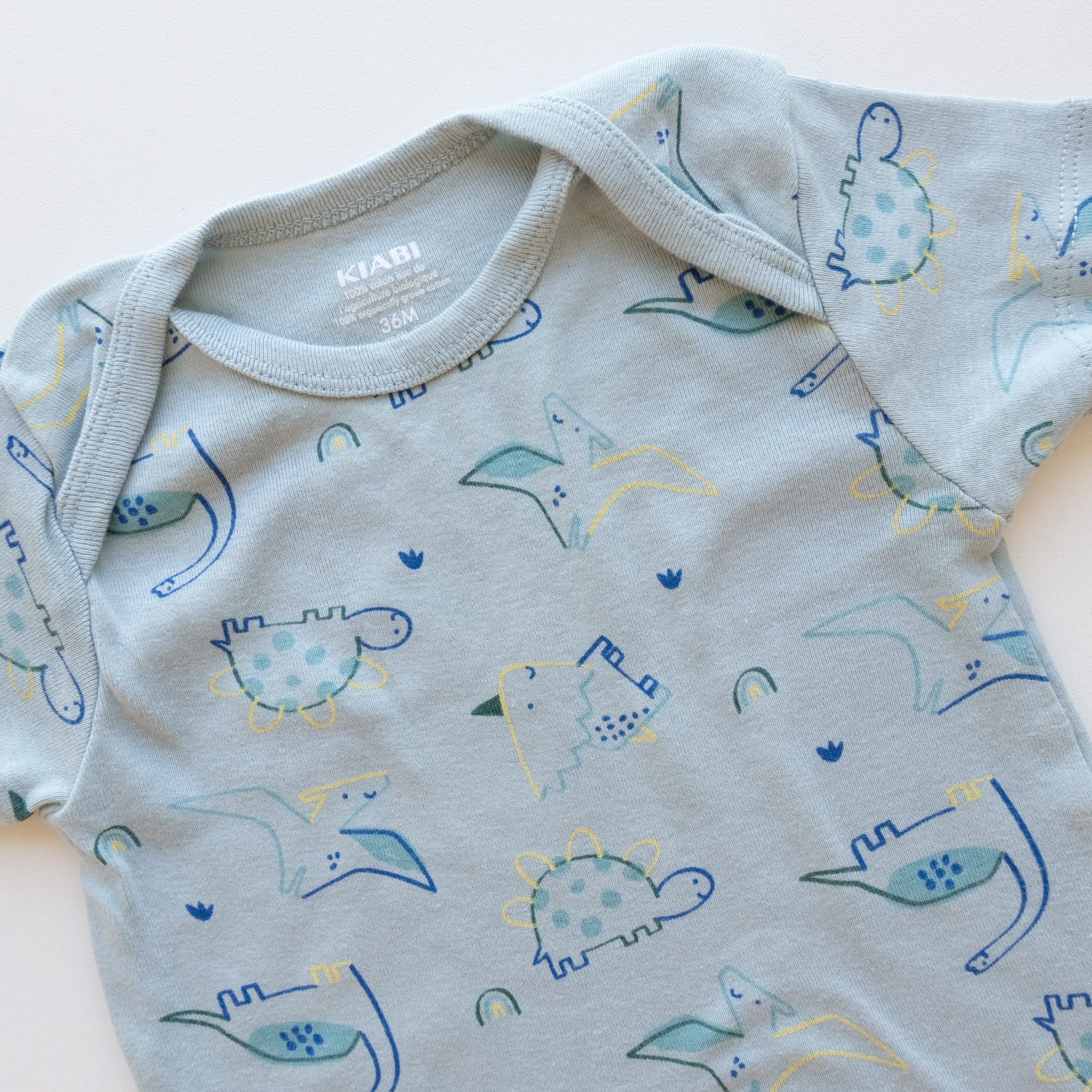 Body à manches courtes en coton biologique, coloris bleu, imprimé dinosaures all over. Encolure américaine.