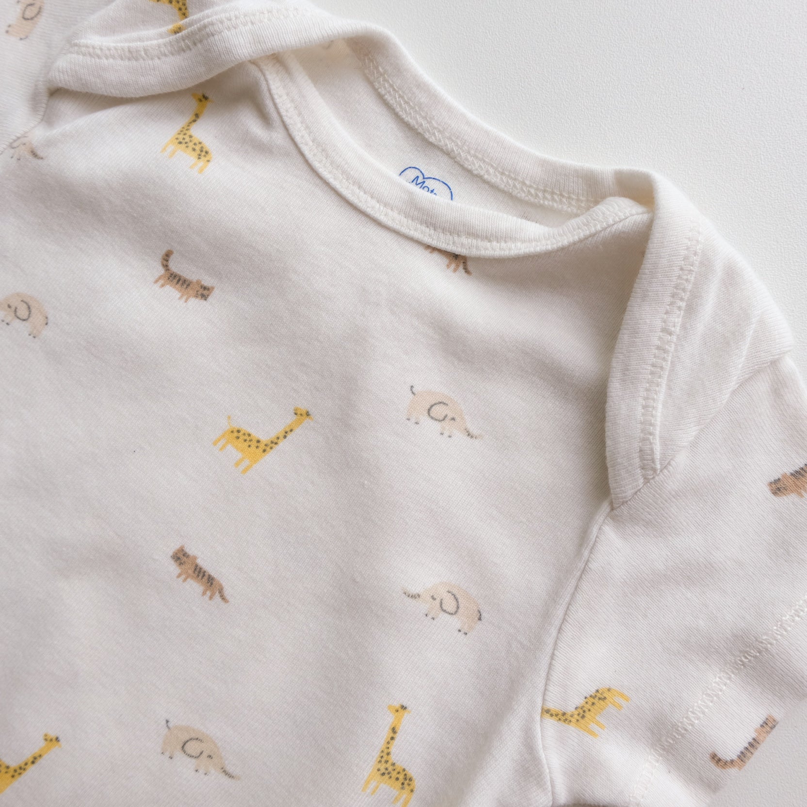 Body à manches courtes en coton, coloris blanc, encolure américaine. Imprimé animaux de la savane all over. Mixte.