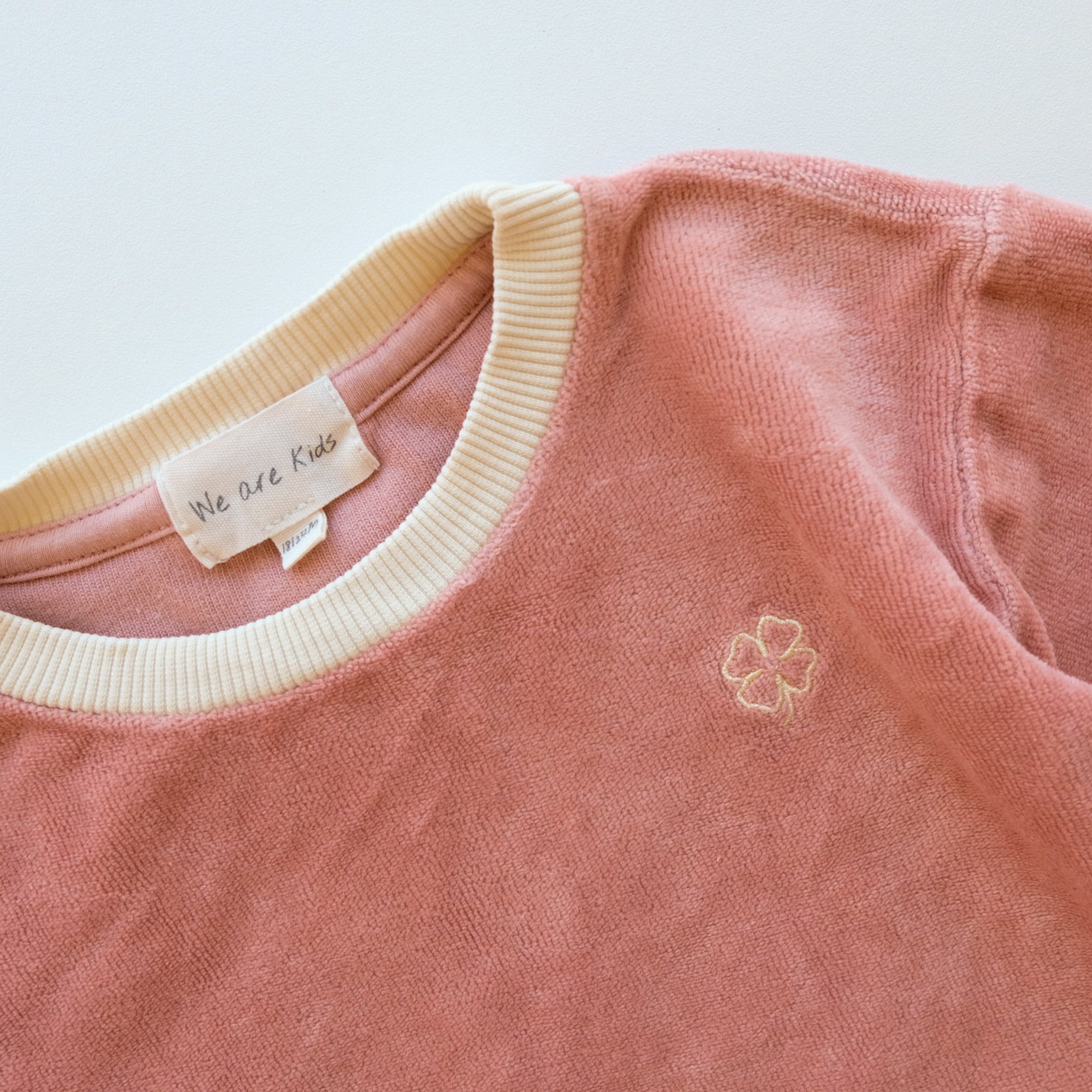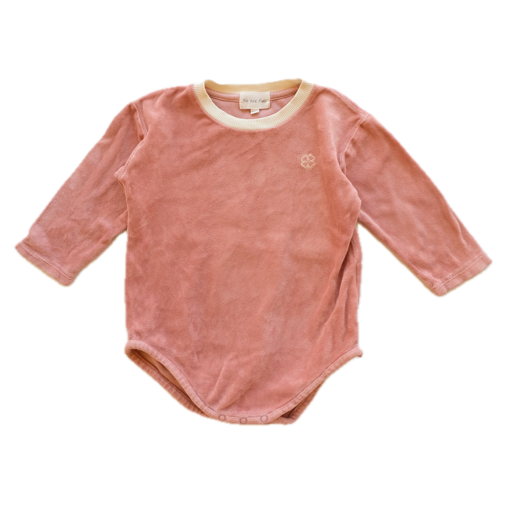 Body à manches longues en velours, coloris rose et vanille. Petit trèfle à 4 feuille brodé au devant. Super chouette !