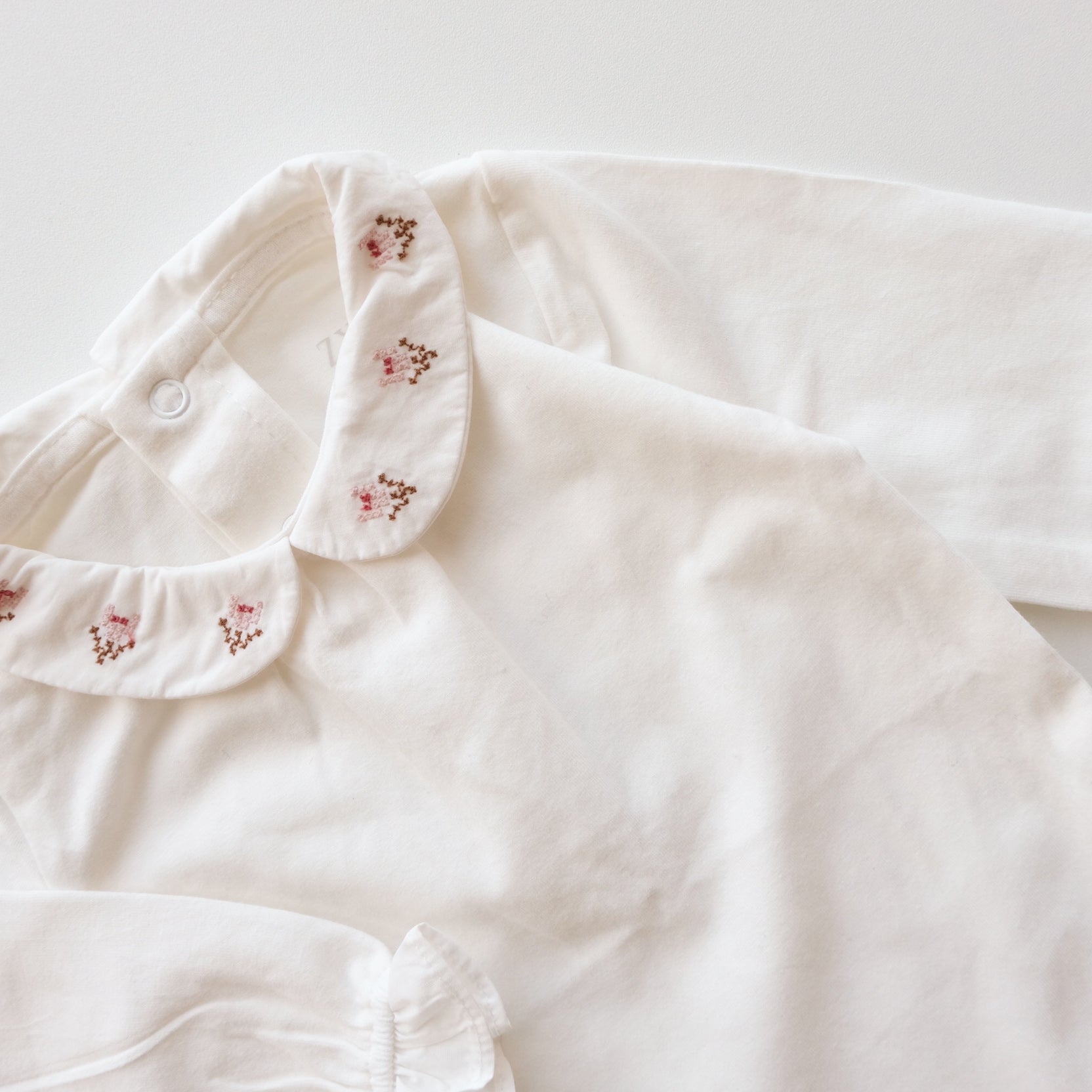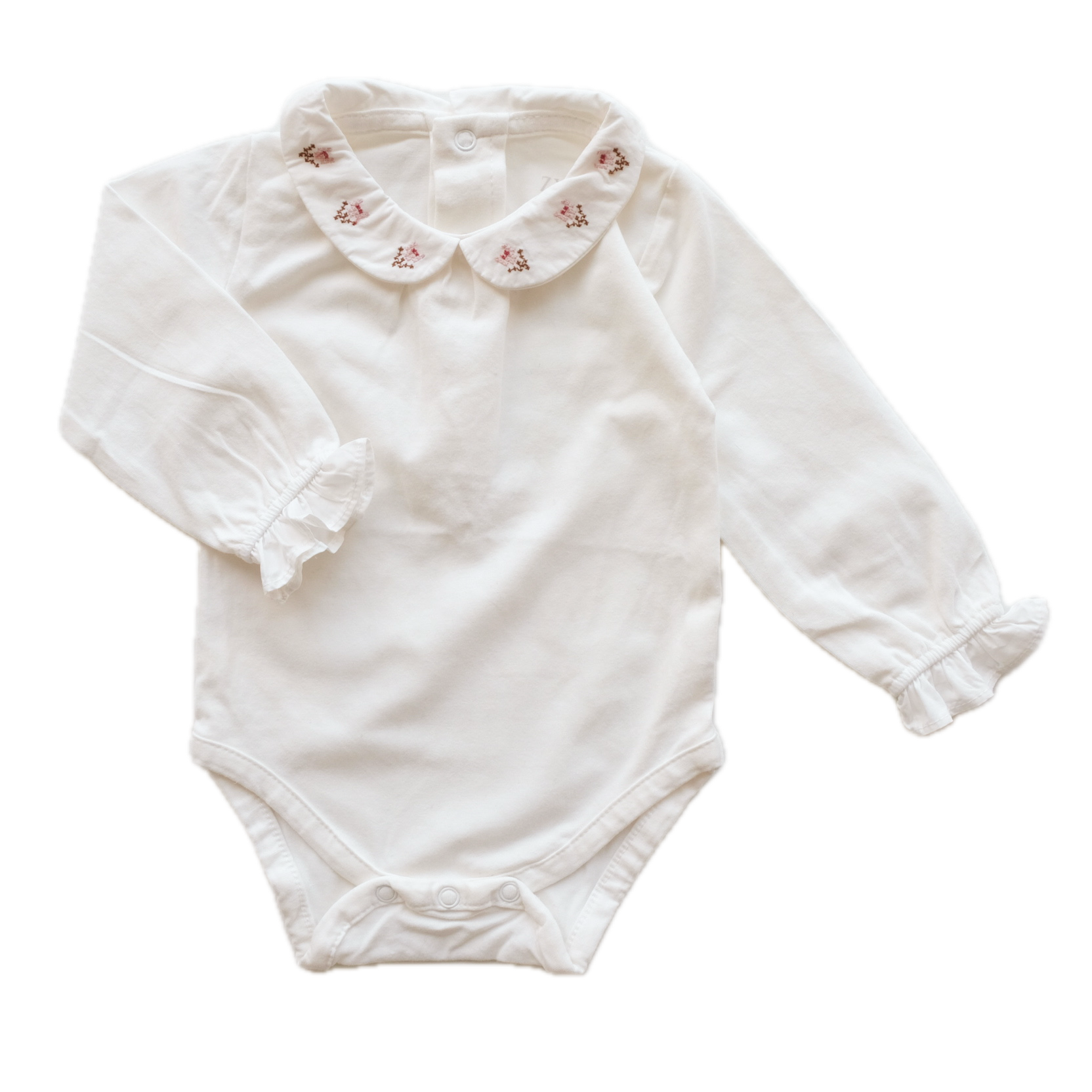 Body à manches longues élastiquées, en coton, coloris blanc. Adorable col en coton blanc avec de jolis détails fleuris au point de croix. Boutons pressions au dos et à l'entrejambe.
