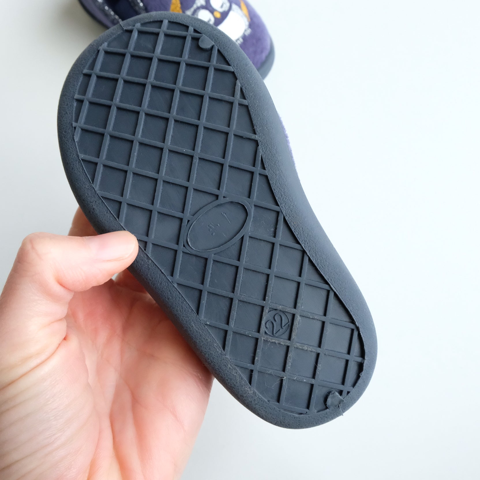 Paire de chaussons, coloris bleu marine, liseré paillettes. Imprimé hibou paillettes sur le devant. En velours tout doux.
