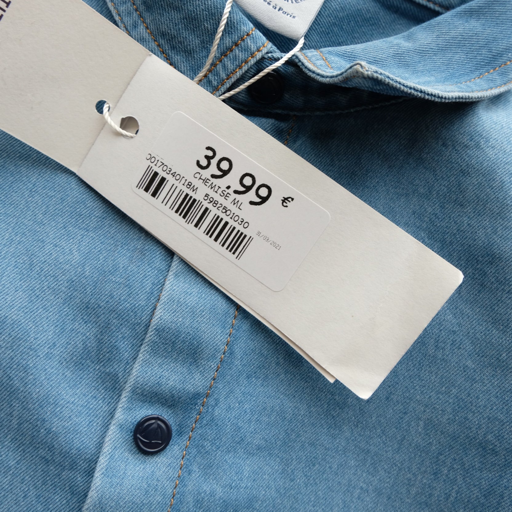 Chemise en denim fluide, coloris bleu clair. Boutons pressions au devant. Neuve avec étiquette.