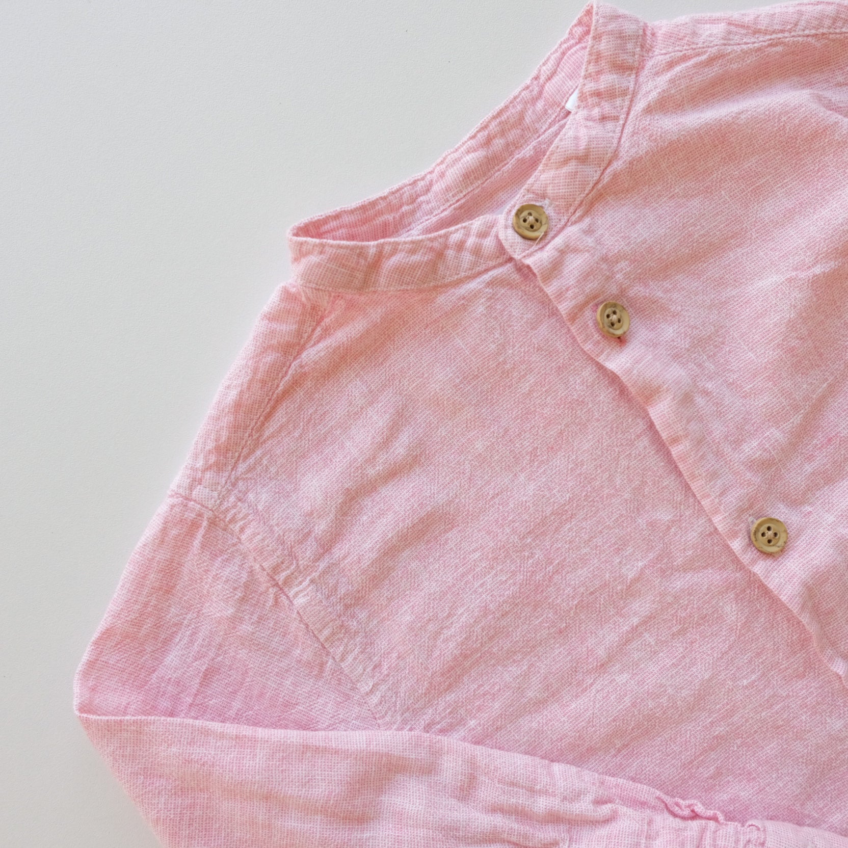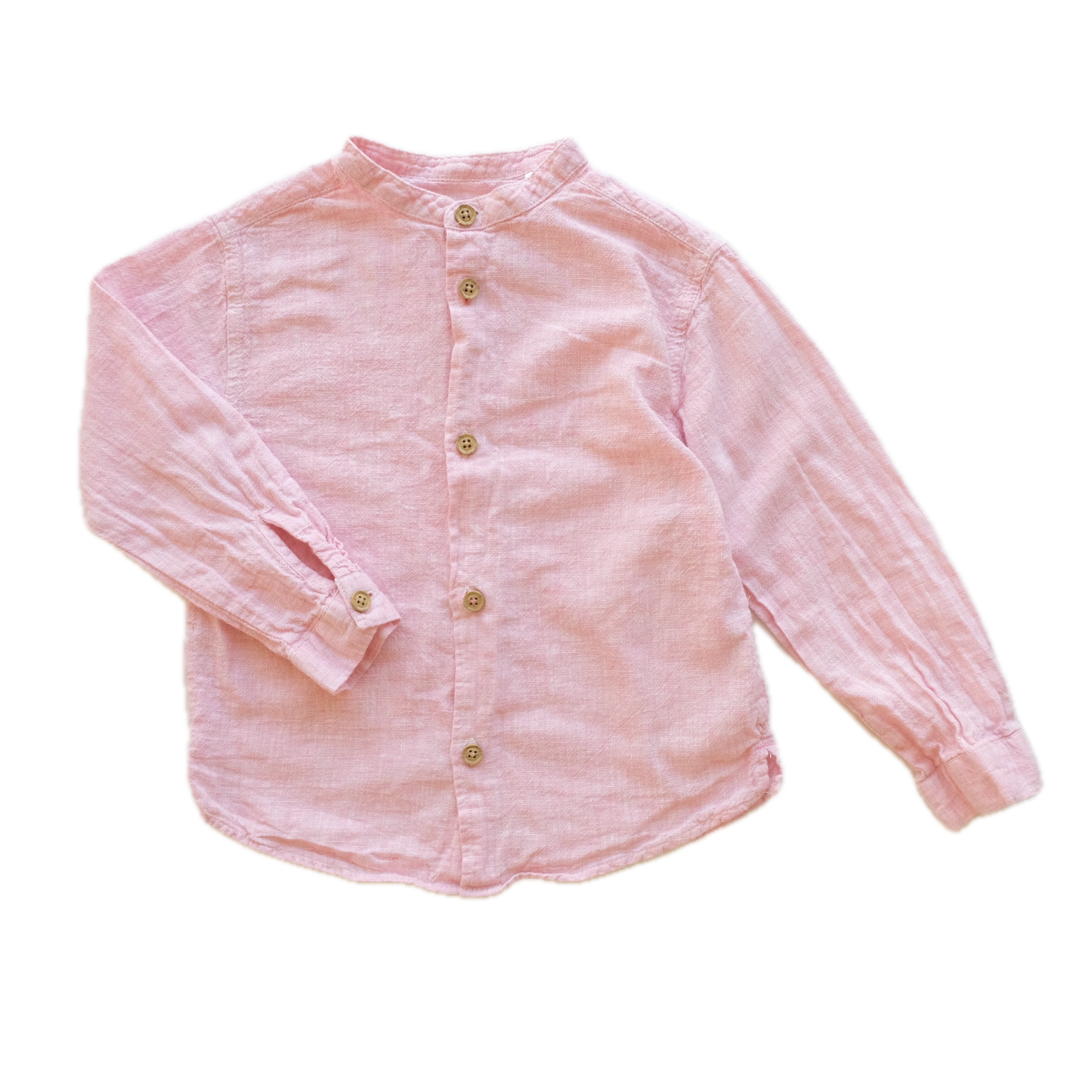 Chemise à manches longues en coton et lin, coloris rose clair uni. Boutonnière au devant. Col tunisien. Très jolie !