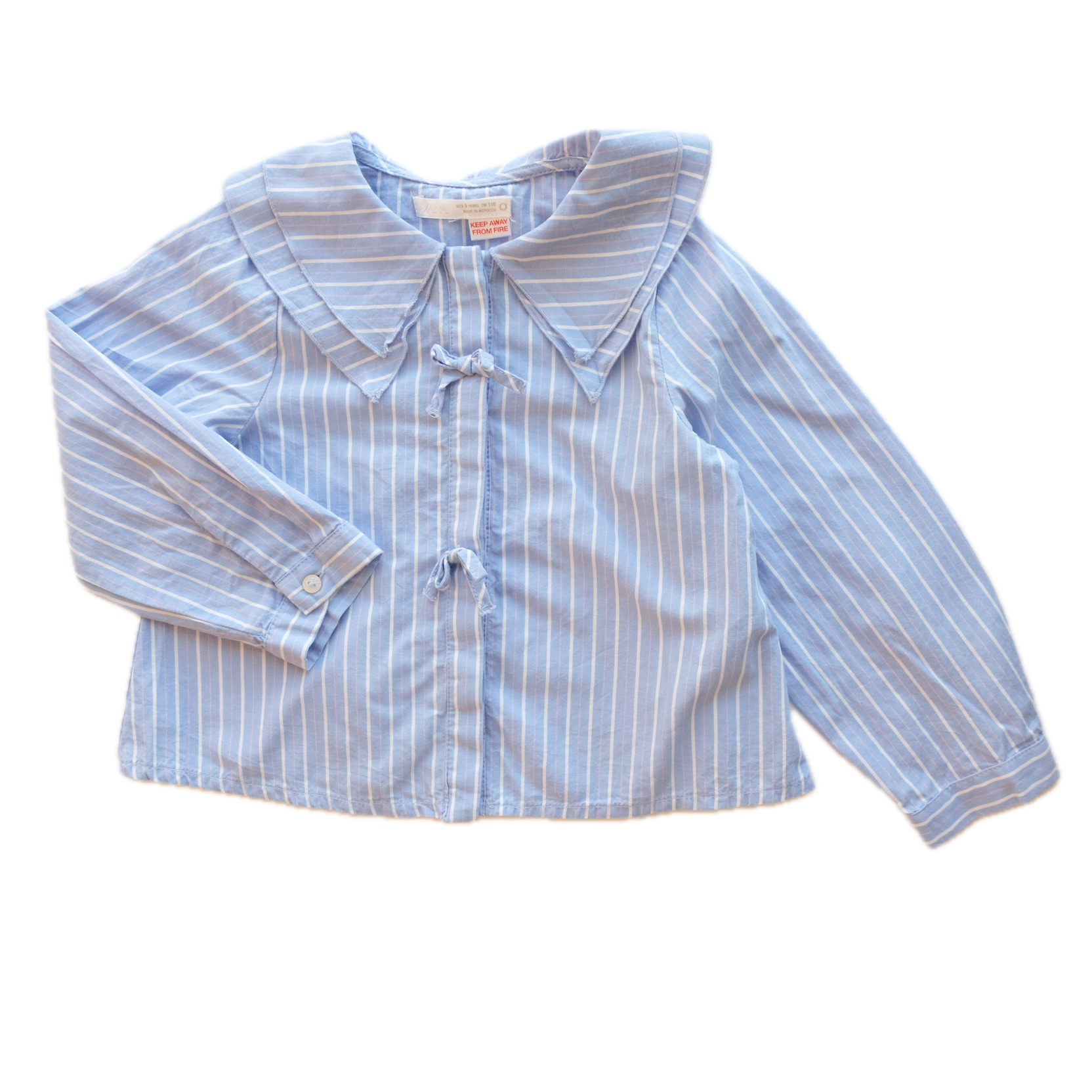 Très belle chemise, blouse à manches longues en coton, coloris bleur clair, fines rayures blanches et rose all over. Boutonnière all over surmontée de petits noeuds fantaisies. Col a avec double rangée de volants.