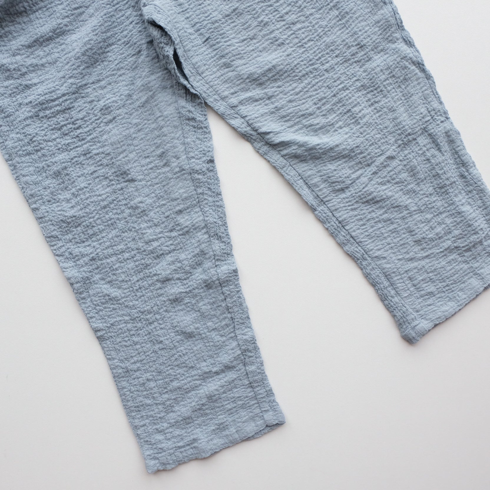Combinaison longue fluide confortable en tissu gaufré bleu pastel. Bretelles rubans en coton à nouer, imprimé bleu et rose. Rappel de l'imprimé sur le volant au devant et au dos. Très jolie combinaison !
