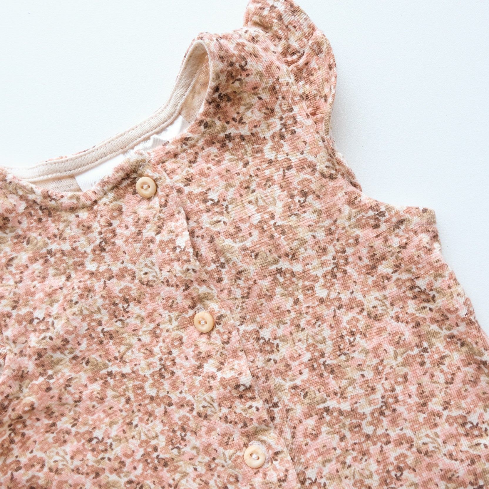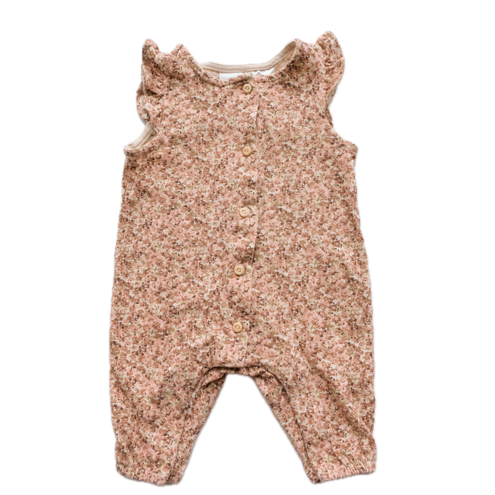 Combinaison longue en coton, imprimé fleuri dans les rose et marron all over. Boutonnière au devant et boutons pressions à l'entrejambe. Petits volants au épaules. Très jolie !