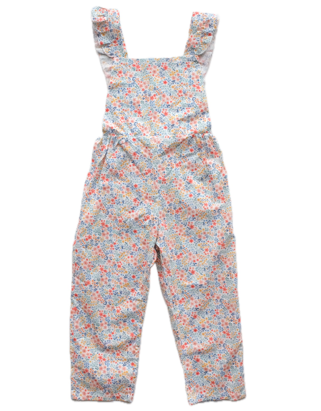 Combinaison longue en coton, coloris blanc, imprimé fleuri multicolore, jolies bretelles volantées. Très belle ! Neuve.