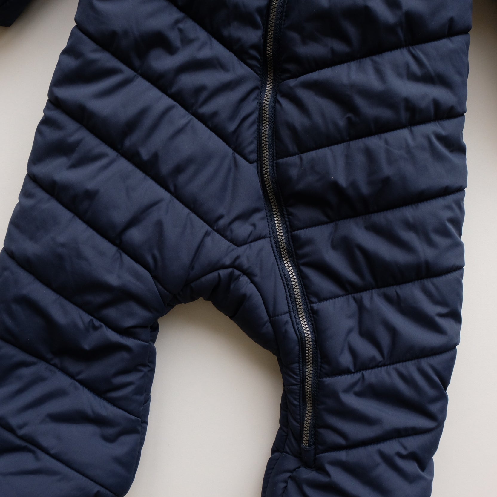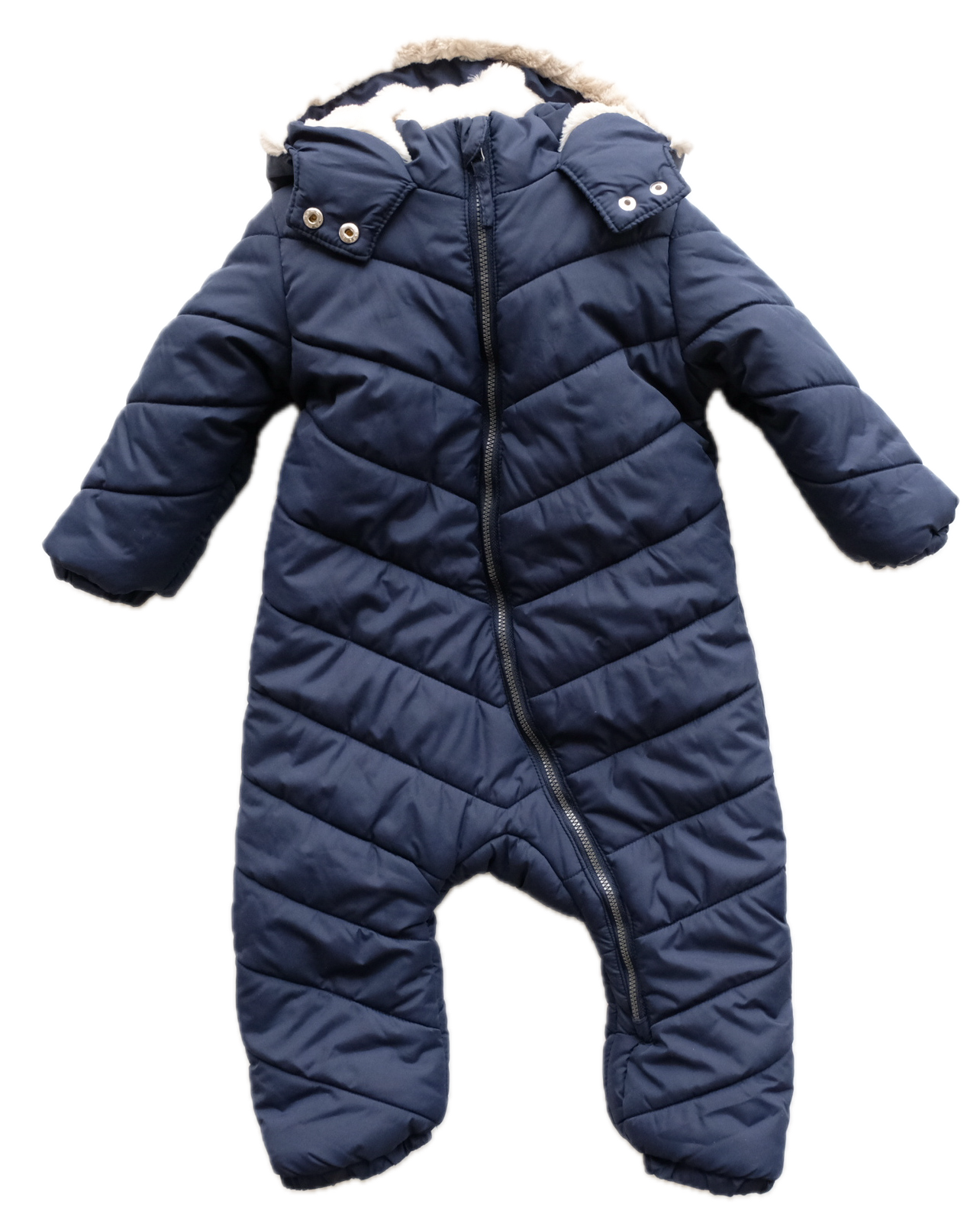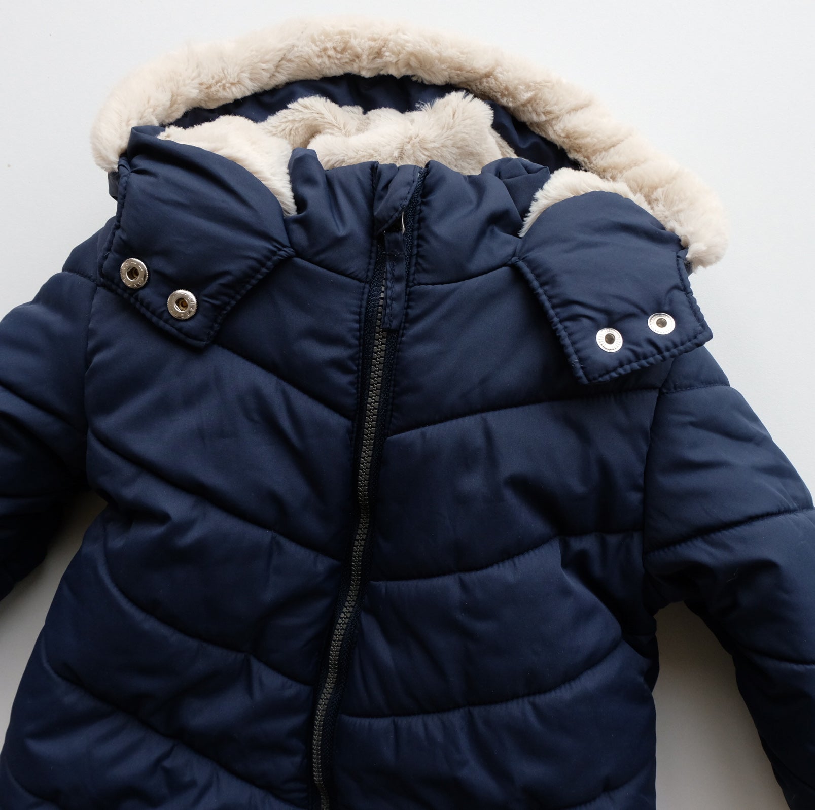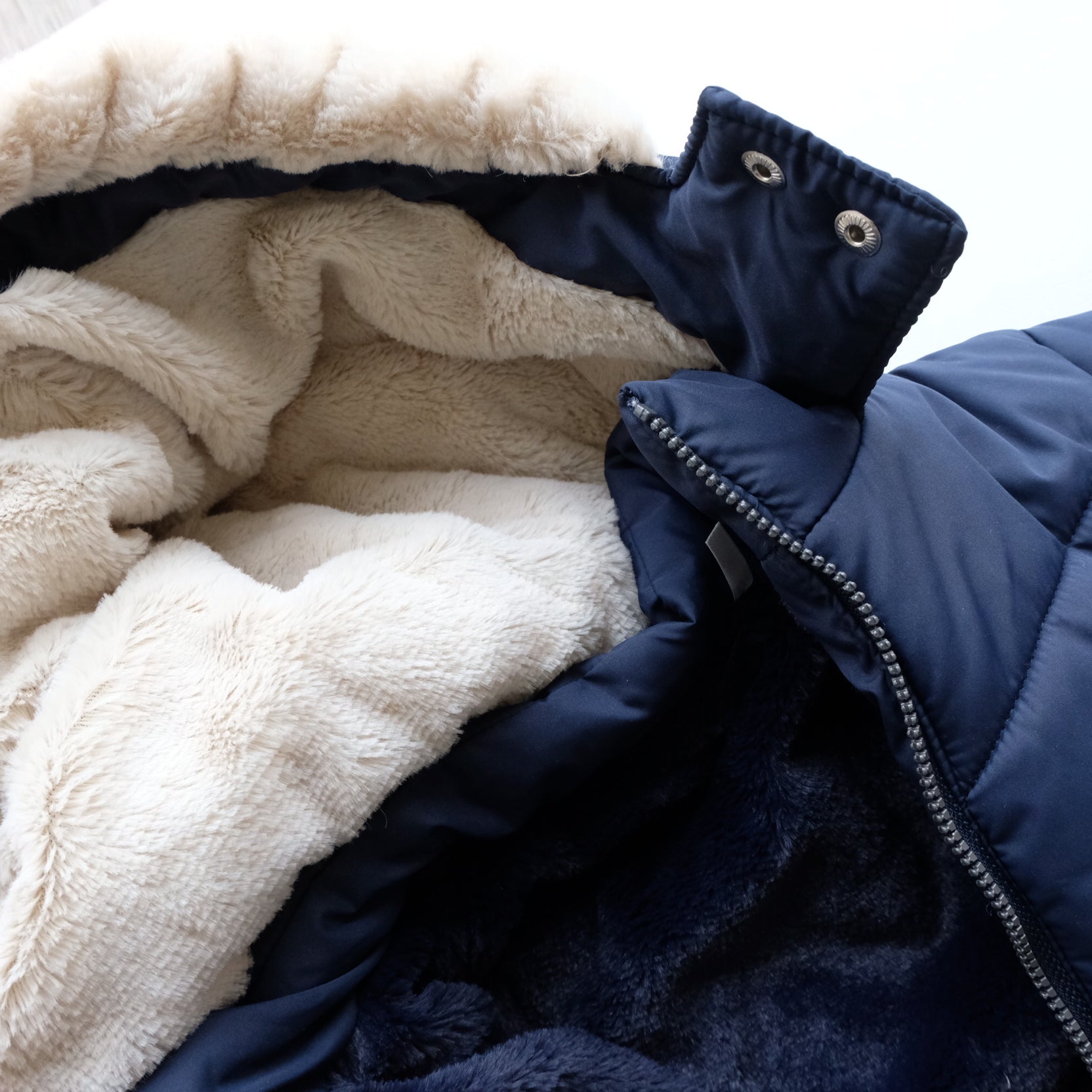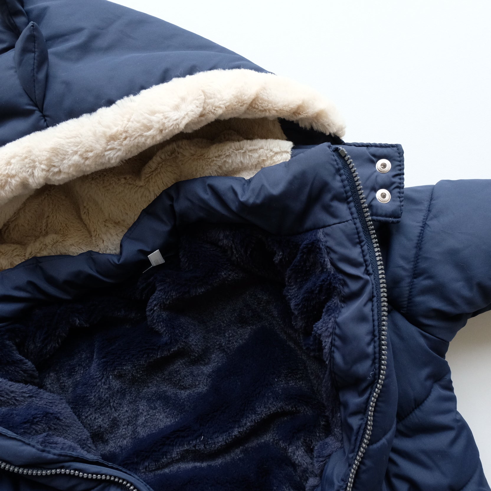 Combinaison pilote, coloris bleu marine. Bien chaude, Doublure intérieure en fausse fourrure bleu marine. Capuche intégrée, fermeture par zip au devant. La capuche comporte également une doublure beige en fausse fourrure. Bébé sera bien protégé du froid avec cette combinaison.