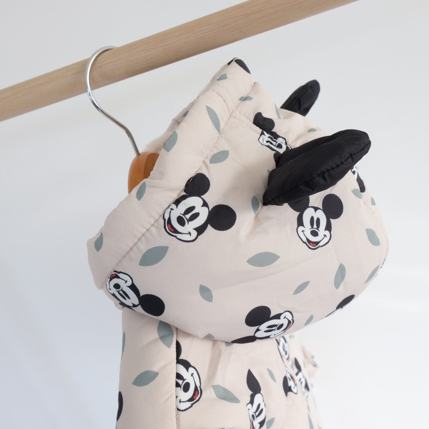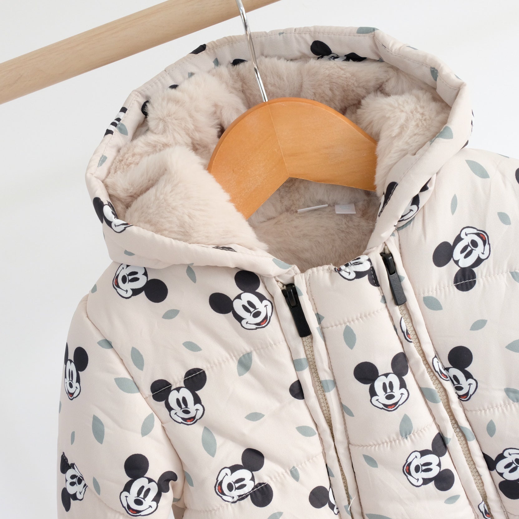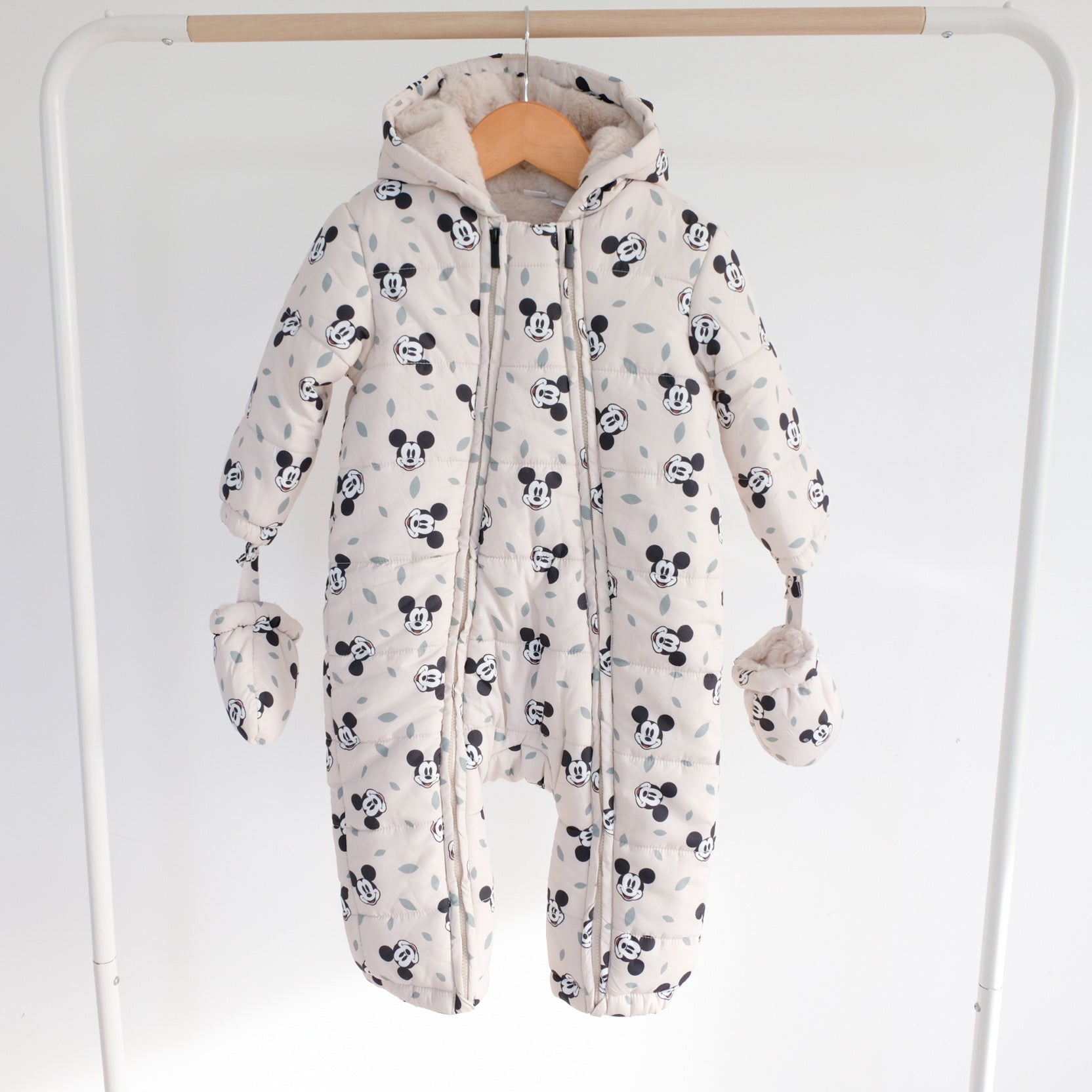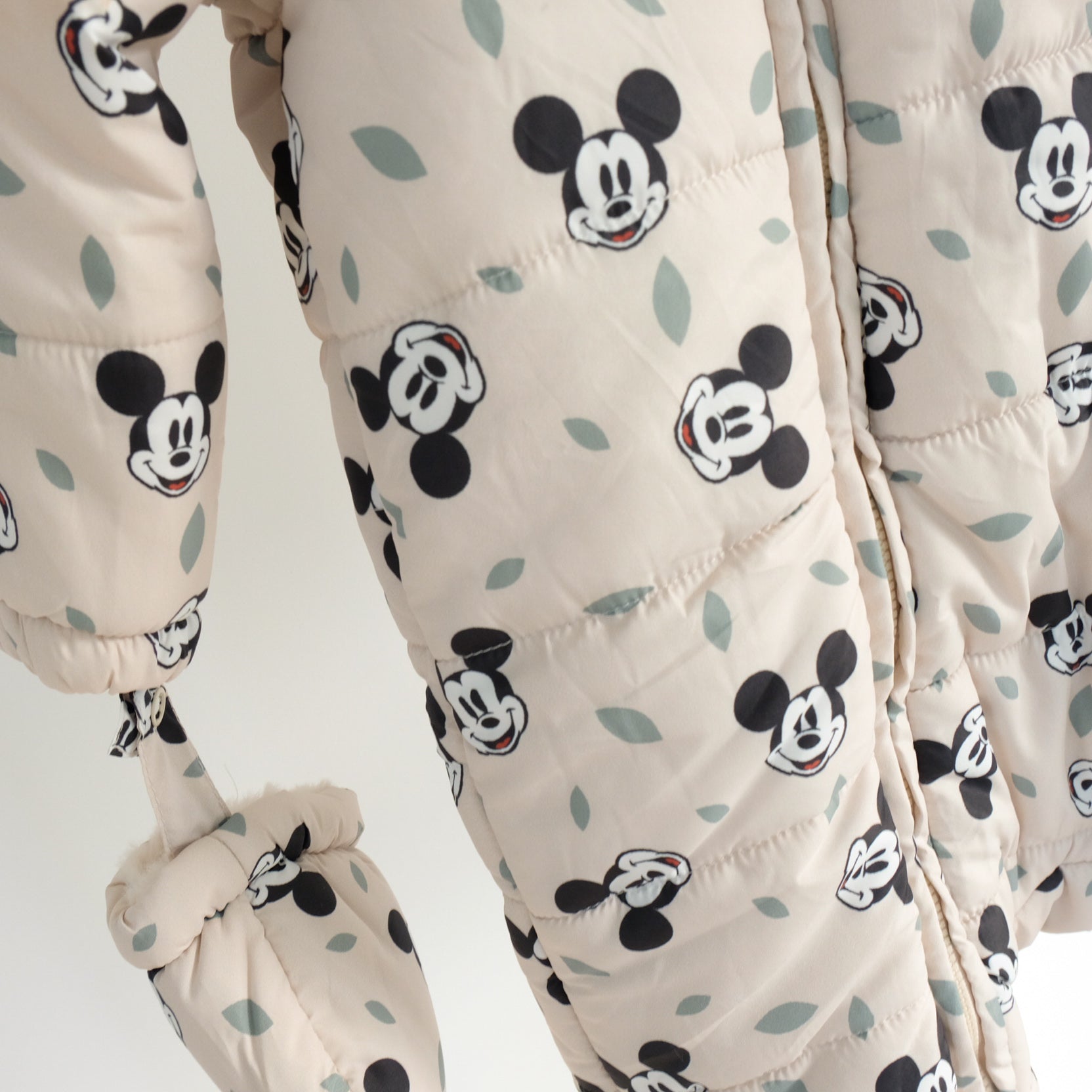 Combinaison pilote longue, capuche intégrée. Collection Disney avec un imprimé Mickey all over. Fermeture par double zip au devant. Coloris beige et vert d'eau. Doublure intérieure en fausse fourrure toute douce bien confortable et bien chaude. Moufles amovibles. Déperlant. Mixte.