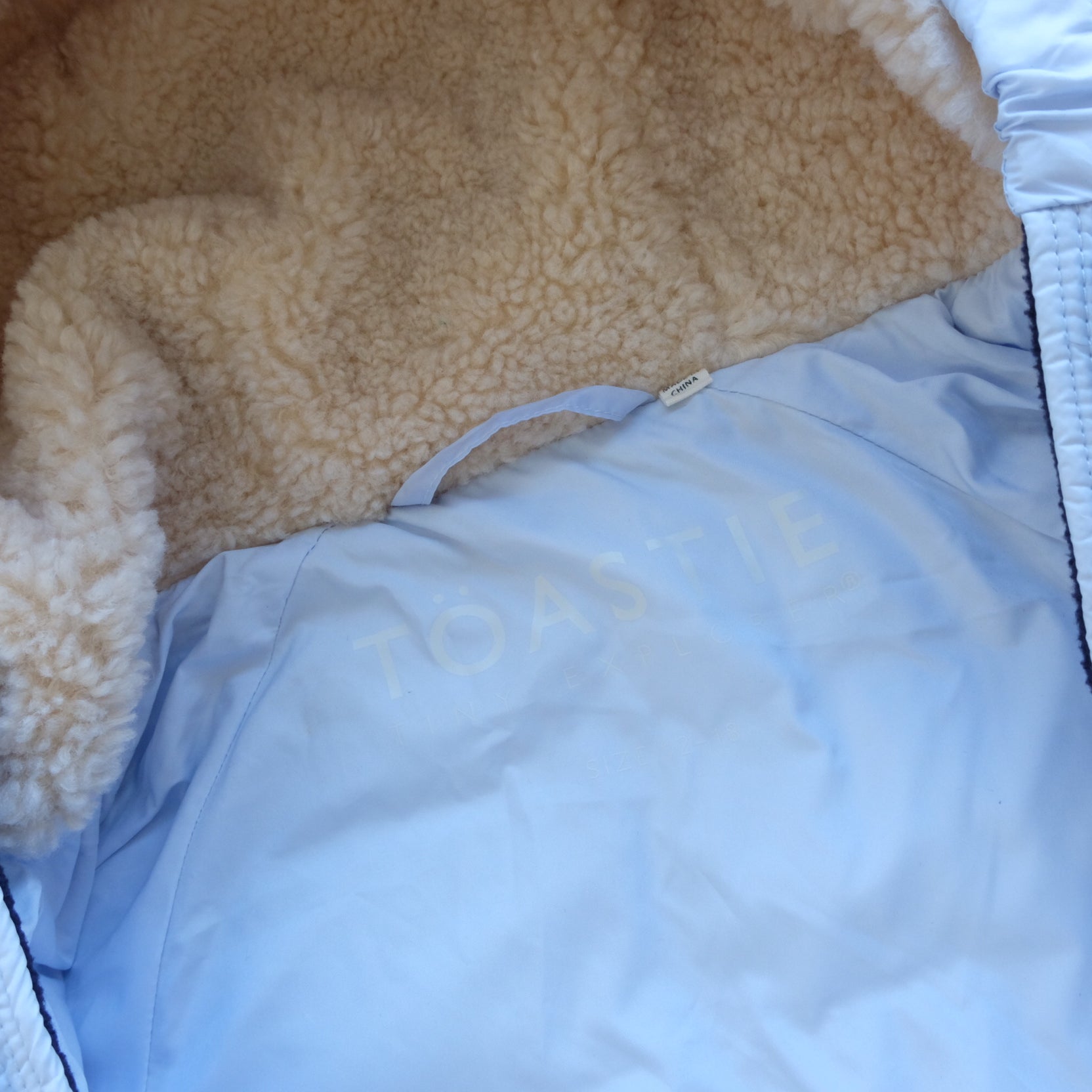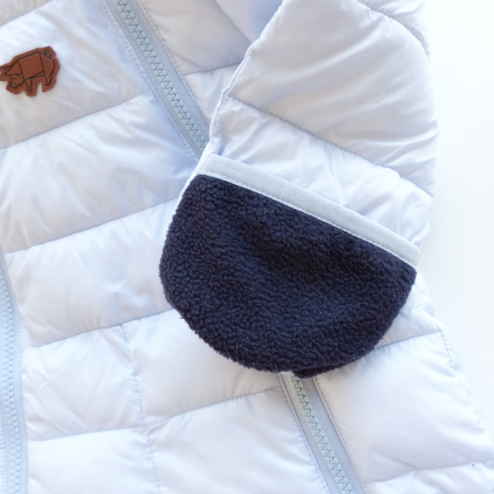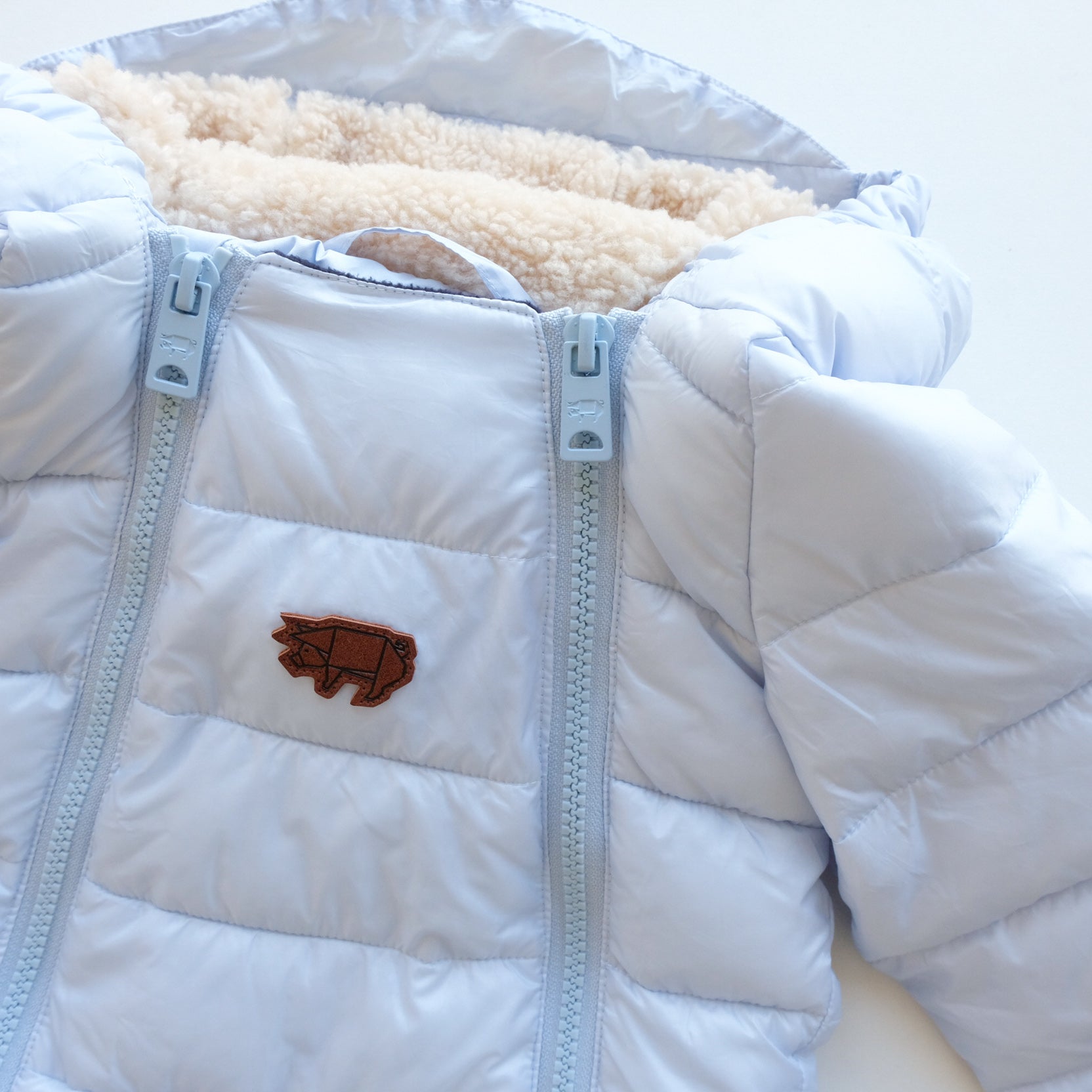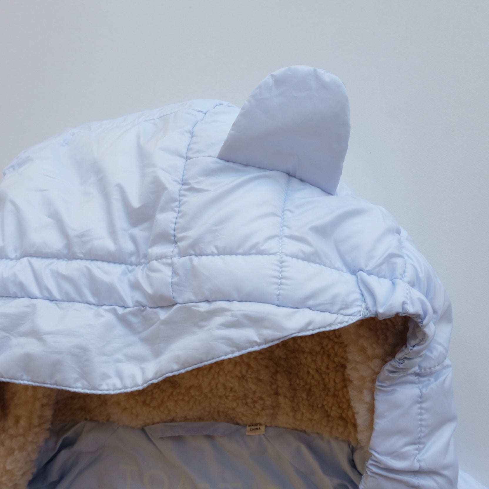Combinaison pilote en duvet, coloris bleu clair. Garnissage en duvet durable. Protection pour les pieds et les mains si besoin. Capuche intégrée avec doublure en moumoute sherpa beige, petites oreilles animaux sur la capuche. Double zip pratique au devant. Parfaite pour accompagner bébé par temps froid.
