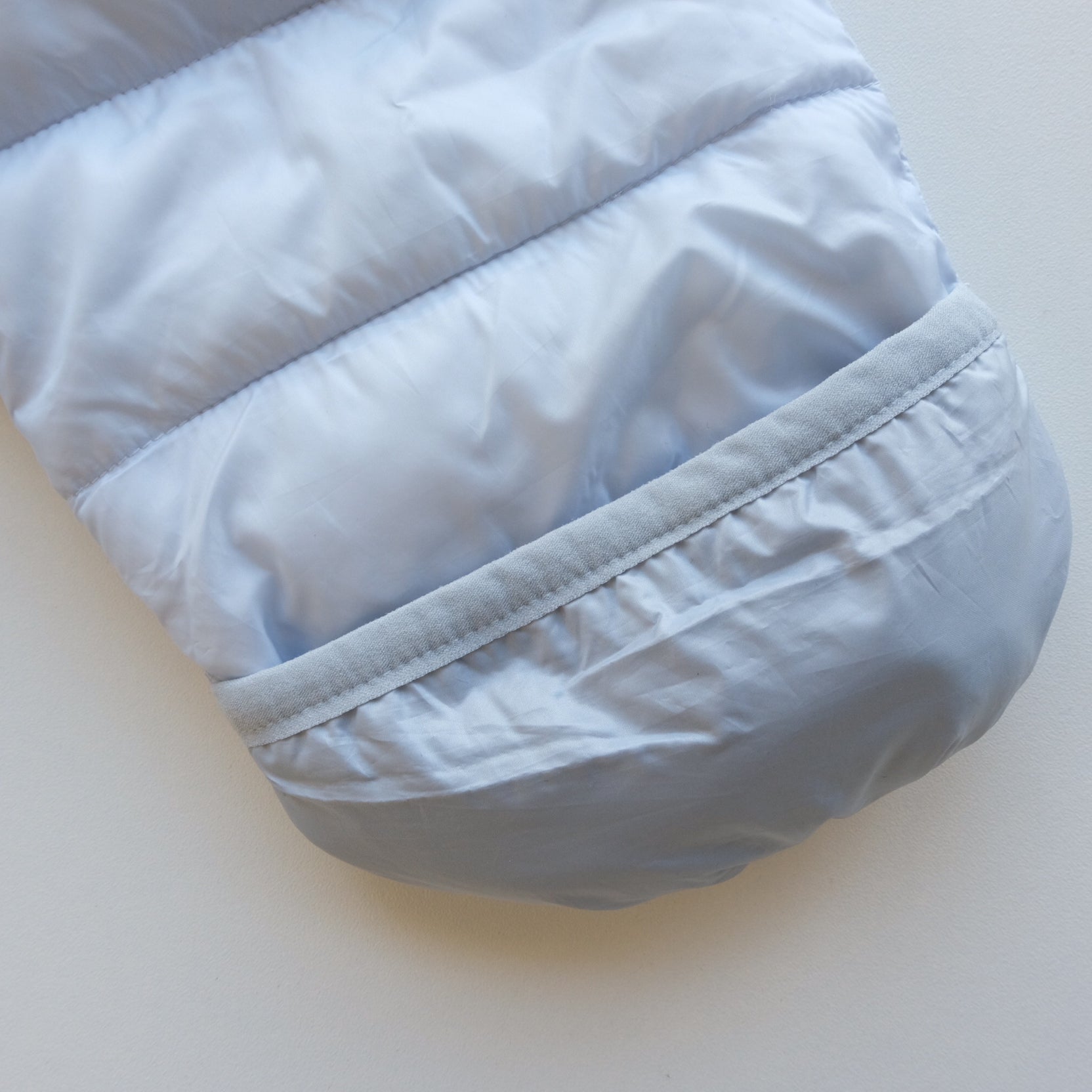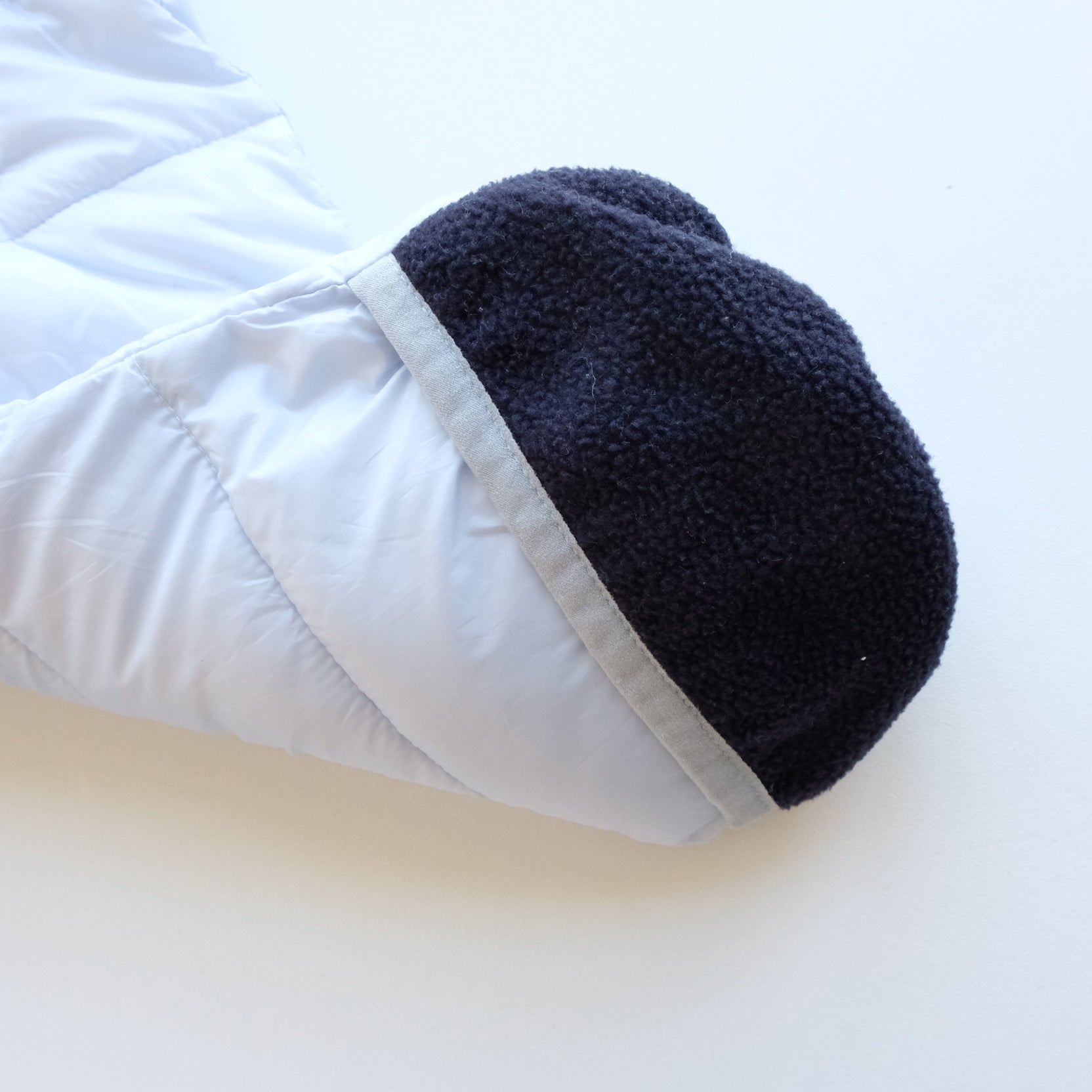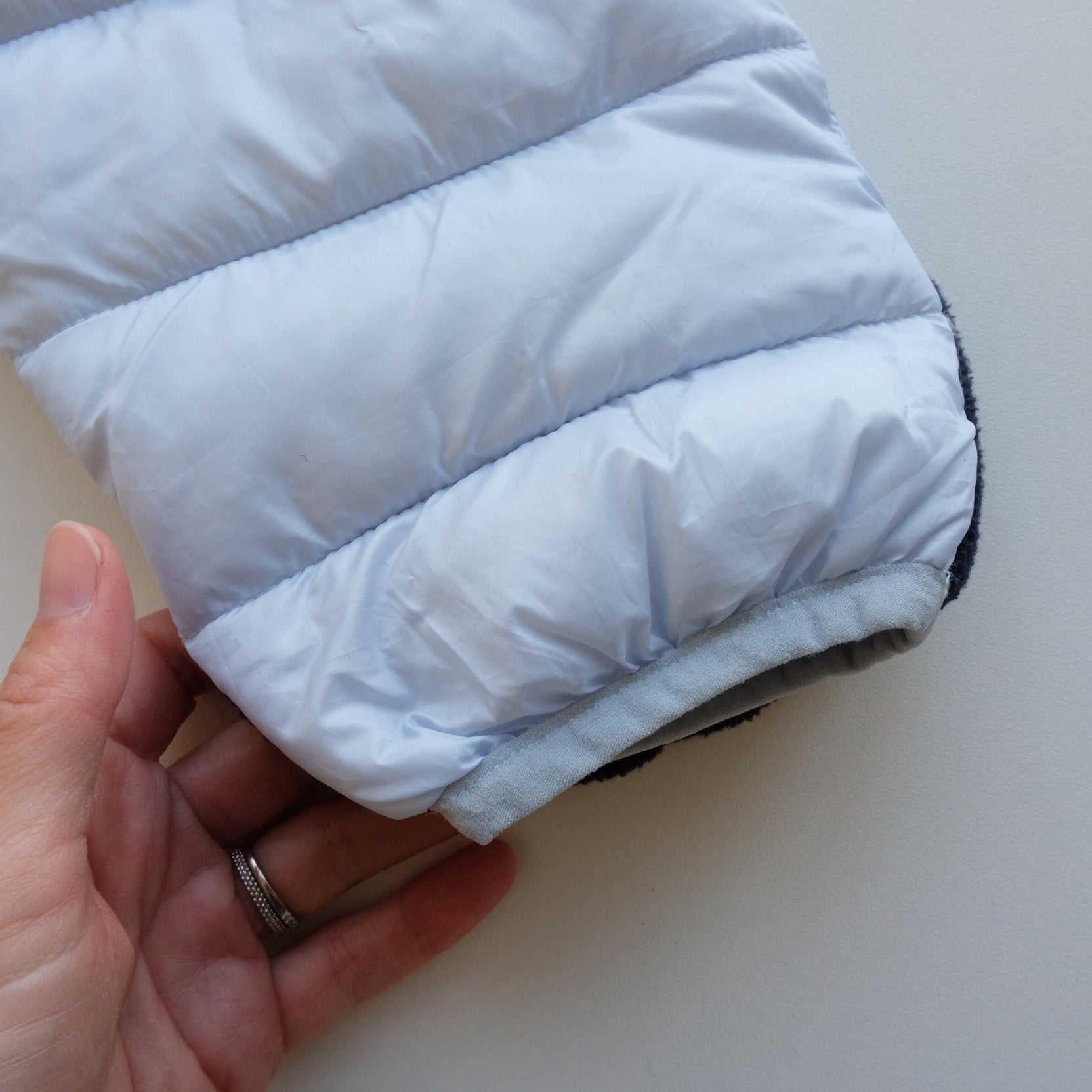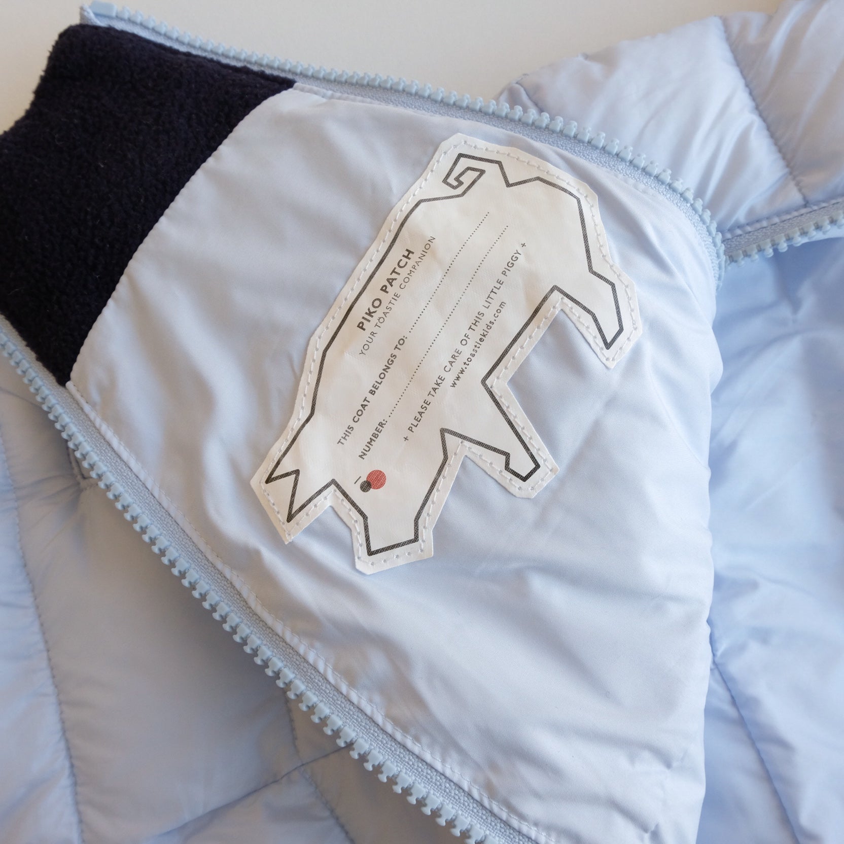 Combinaison pilote en duvet, coloris bleu clair. Garnissage en duvet durable. Protection pour les pieds et les mains si besoin. Capuche intégrée avec doublure en moumoute sherpa beige, petites oreilles animaux sur la capuche. Double zip pratique au devant. Parfaite pour accompagner bébé par temps froid.