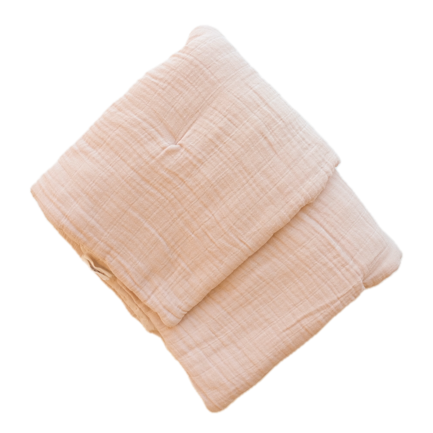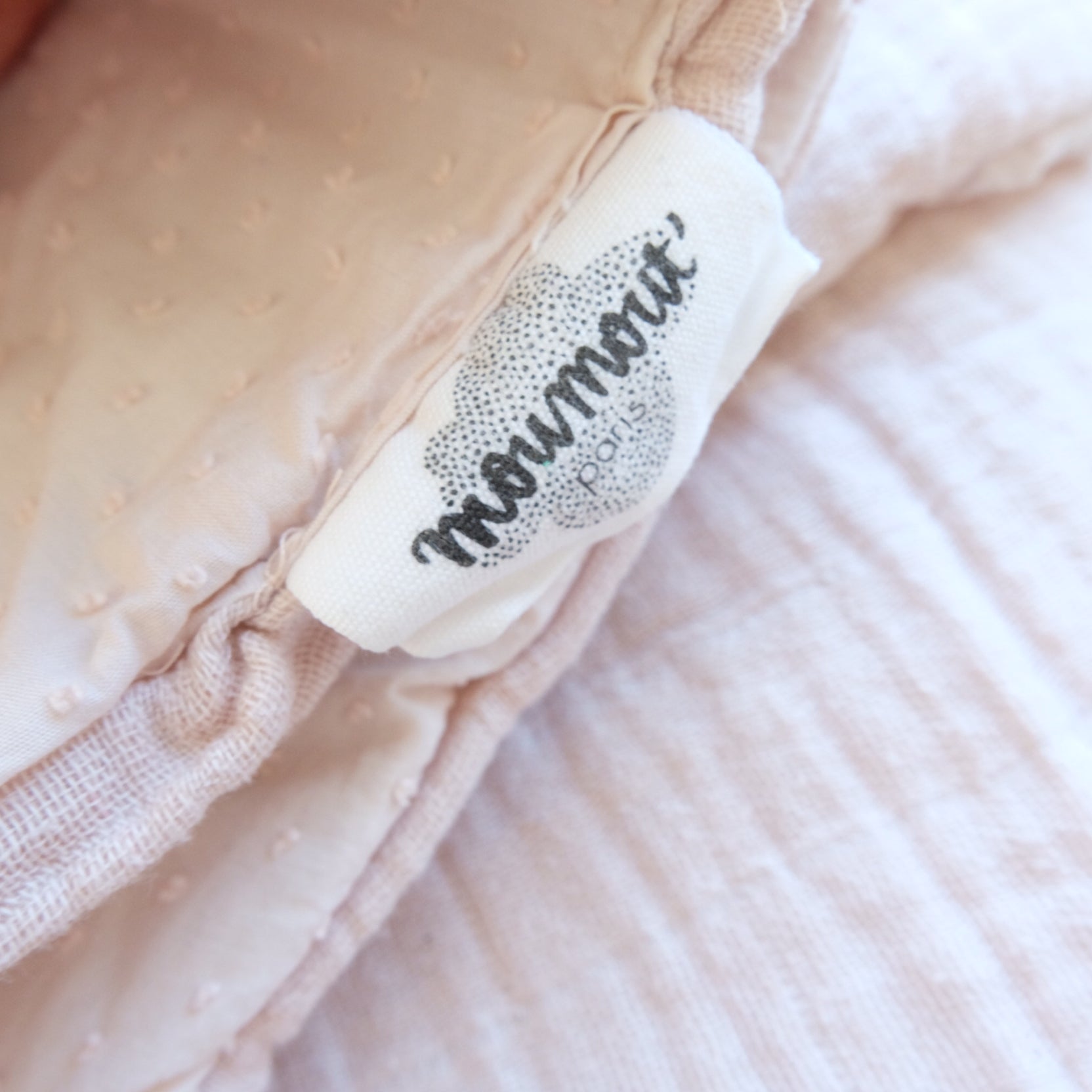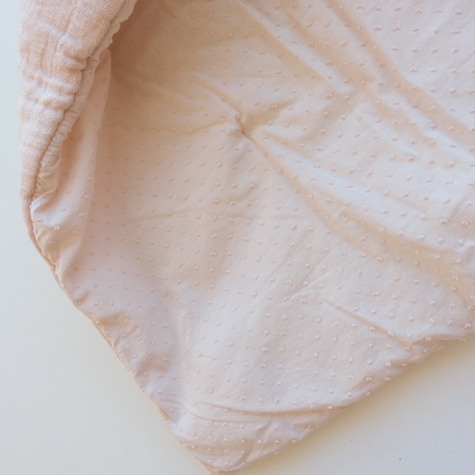 Adorable couverture pour bébé coloris rose pâle. Une face en coton plumetis et une face en gaze de coton. Couverture rembourrée toute douillette.