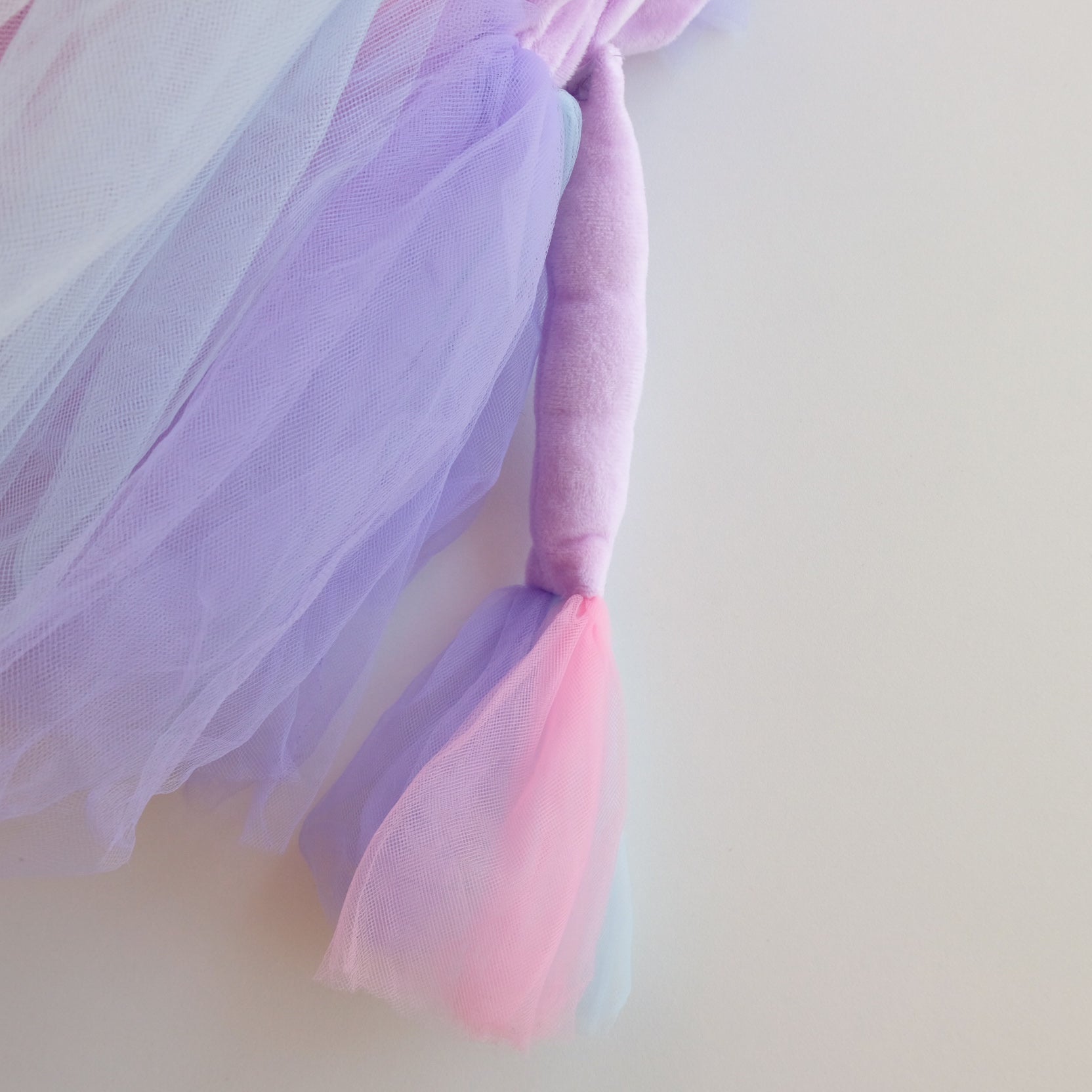 Déguisement de licorne, jupe avec multiples tulles colorés dans les tons lilas, rose et turquoise. Rappel de tulles aux épaules. Capuche intégrée avec corne de licorne. Très bon état.