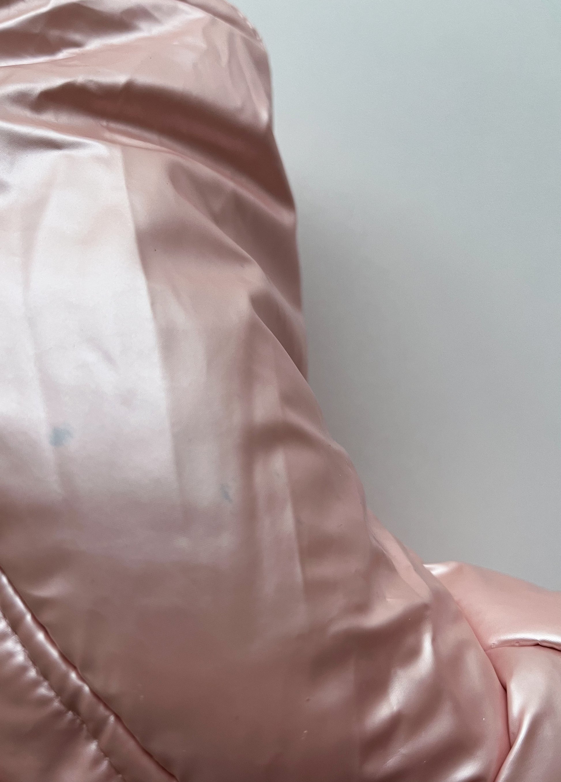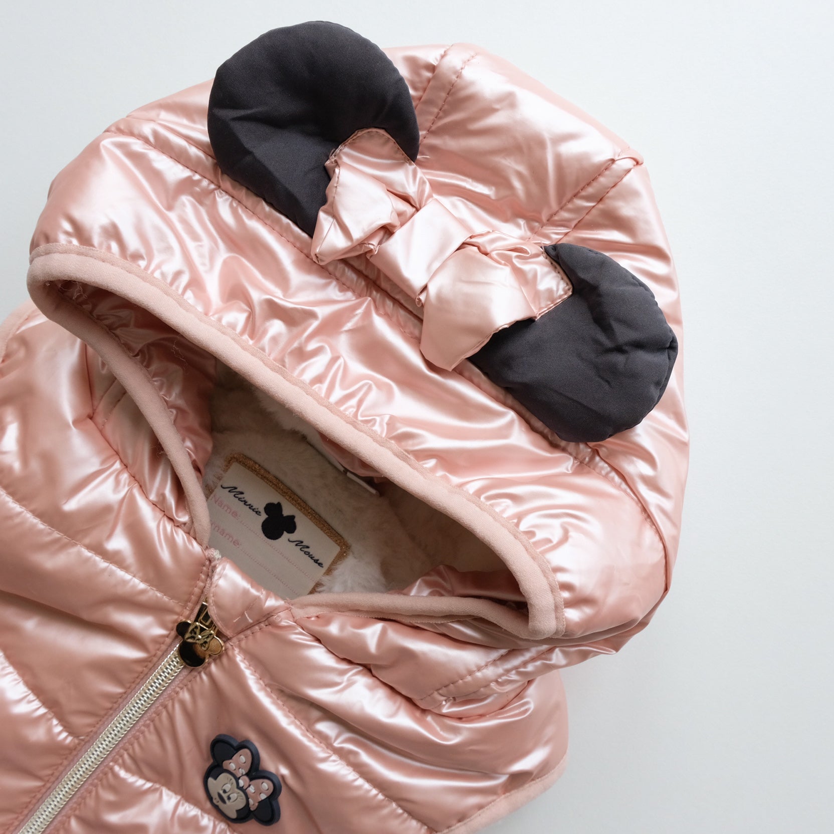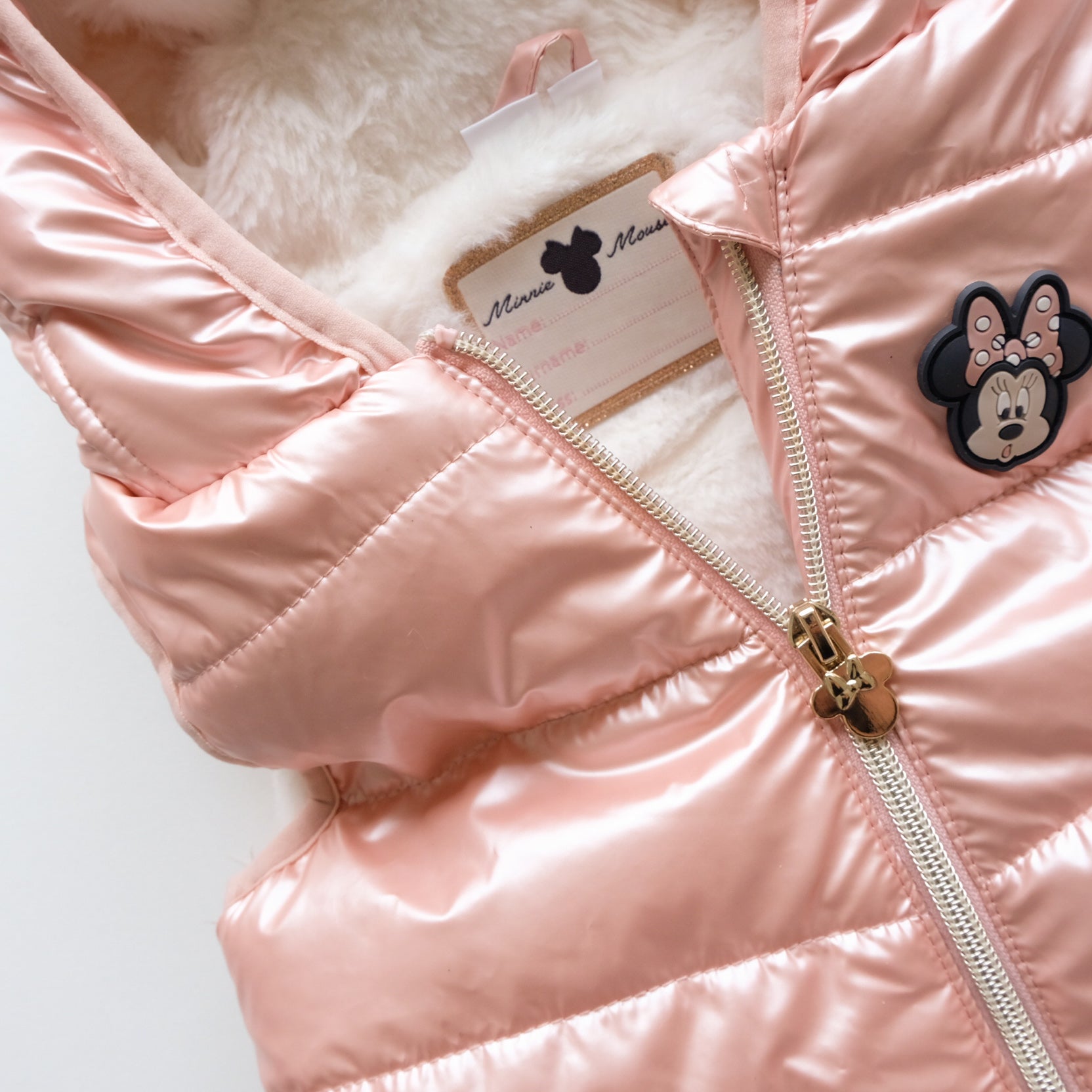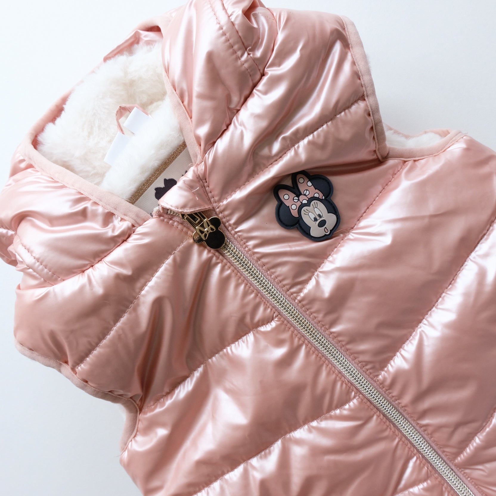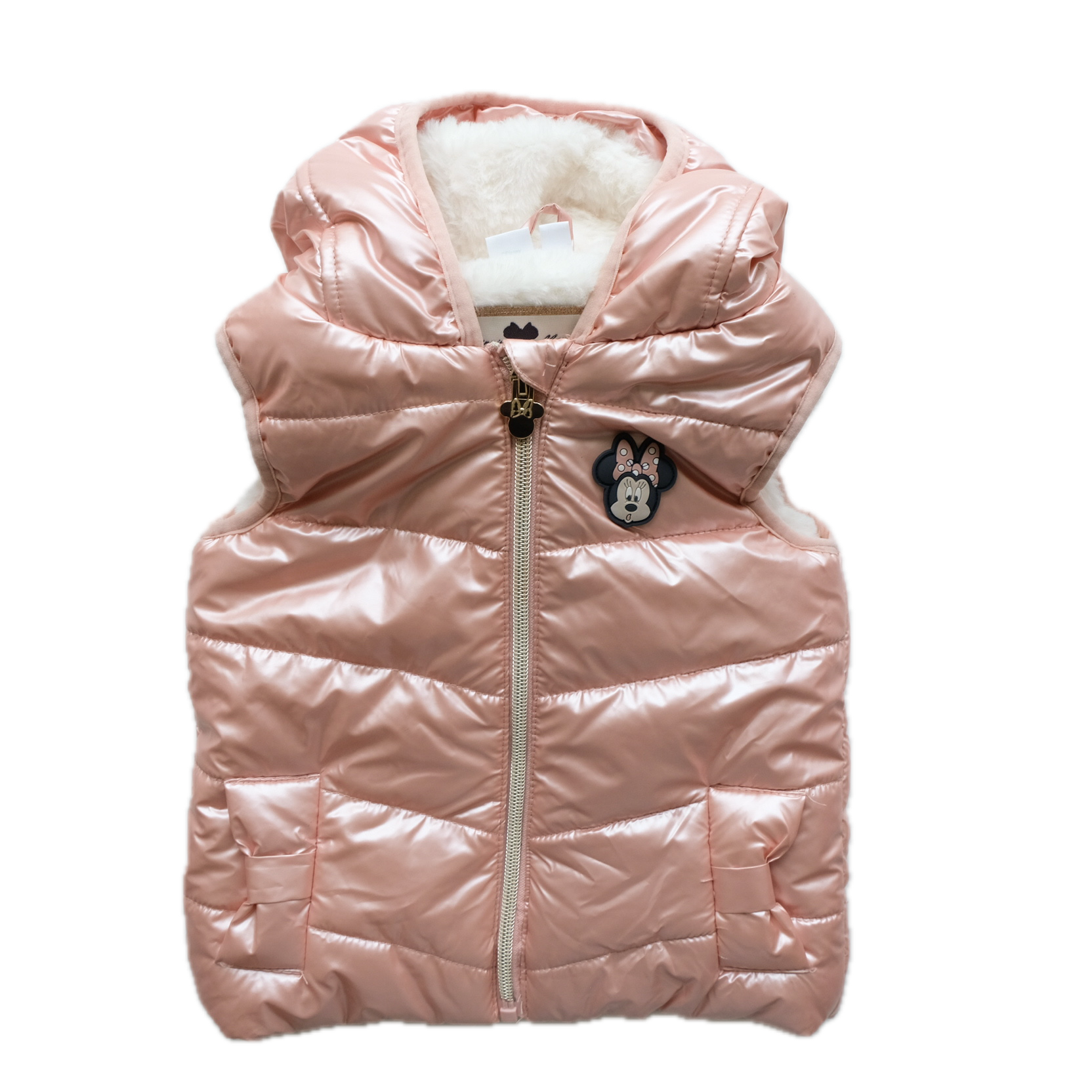 Doudoune sans manches coloris rose métallisé, zippée au devant, capuche intégrée avec noeud fantaisie Minnie cousu. Doublure intérieure en fausse fourrure blanche toute douce. Excellent état (à noter : toute petite tâche bleue sur la capuche très peu visible).