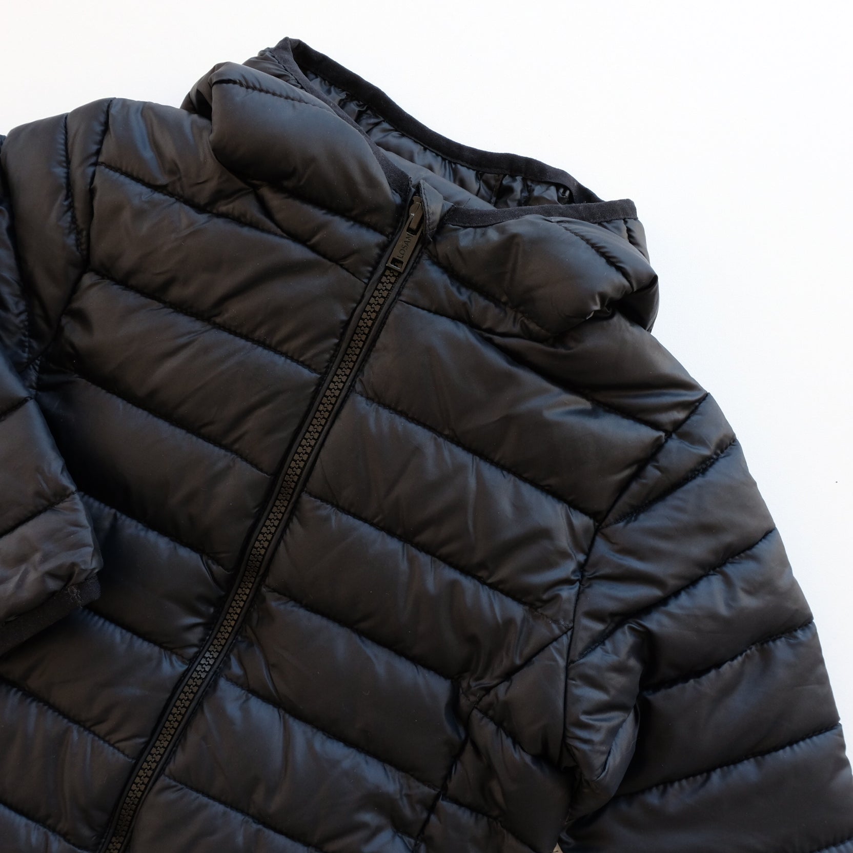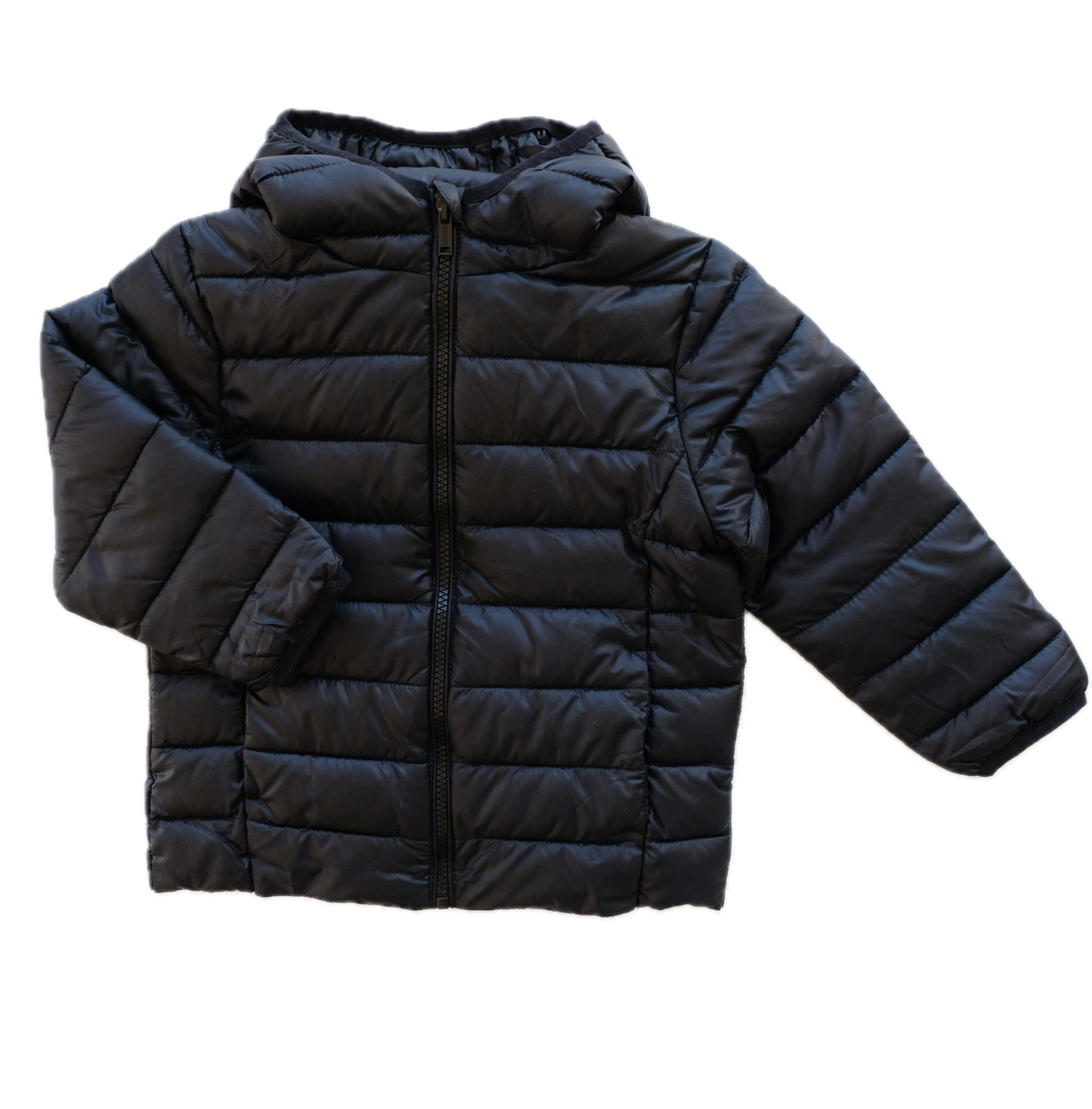 Doudoune, veste chaude, coloris noir uni. Capuche intégrée, zip au devant.