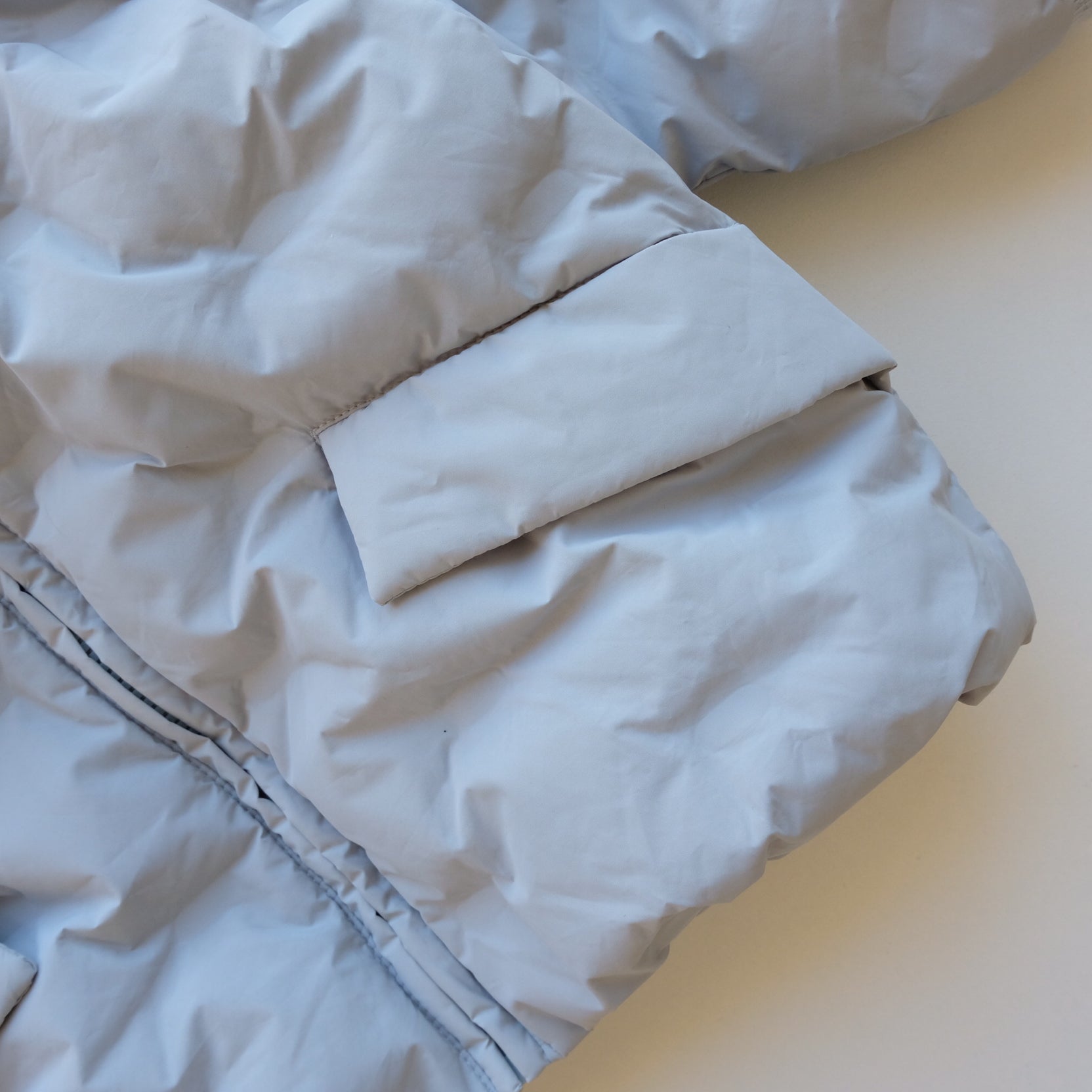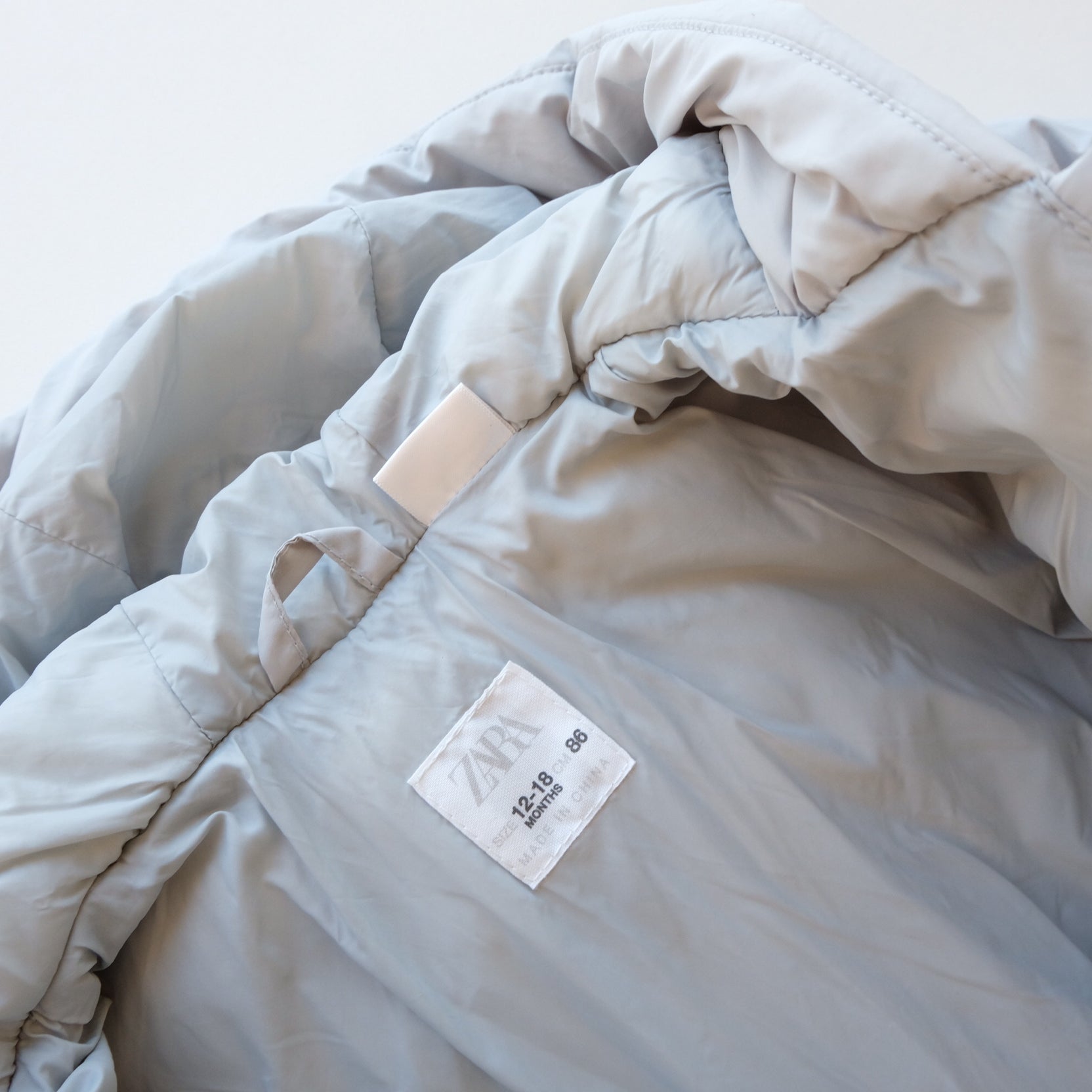 Manteau, doudoune fluffy, coloris bleu/gris clair. Capuche intégrée. Finitions bords côtes aux manches, zippée au devant. Très chouette !