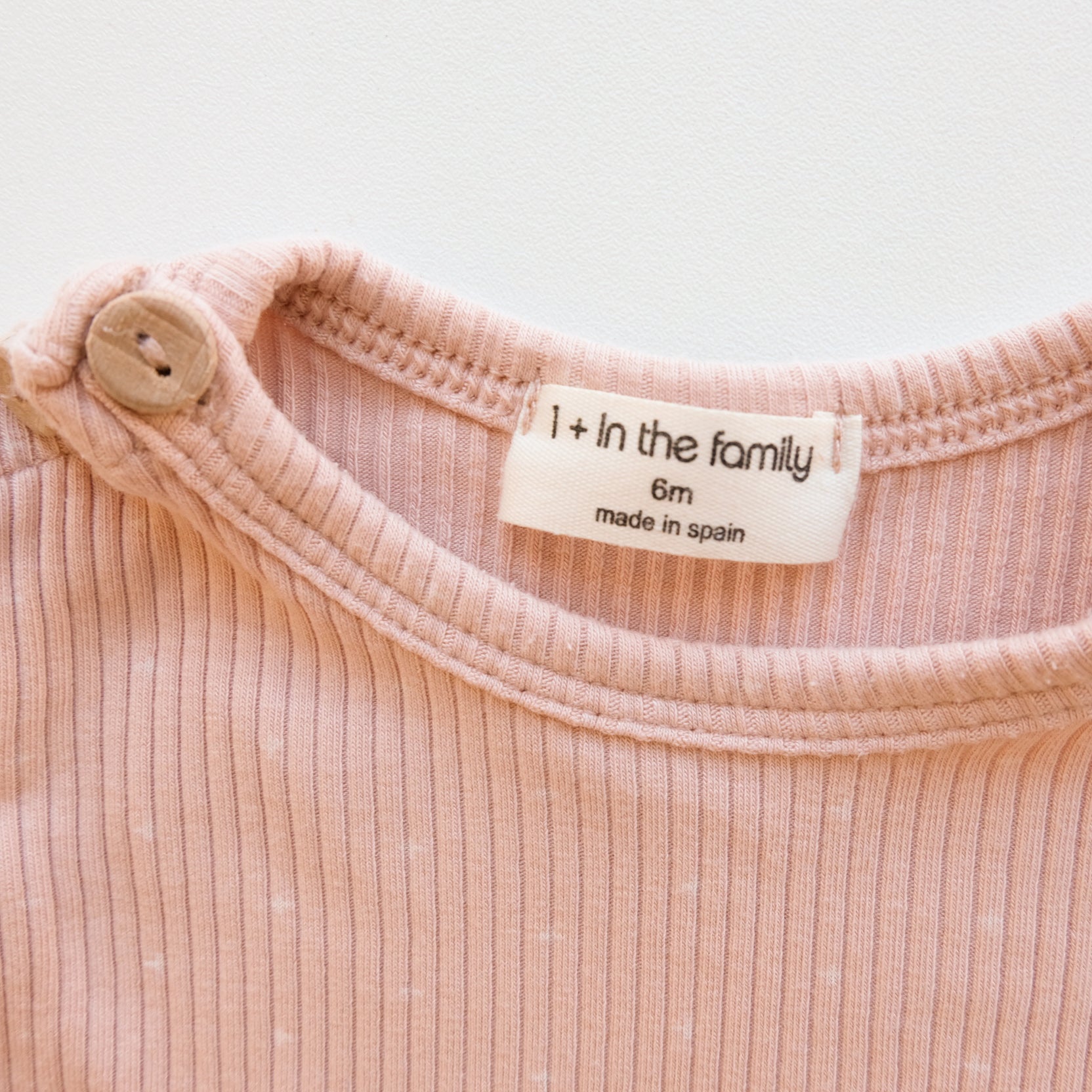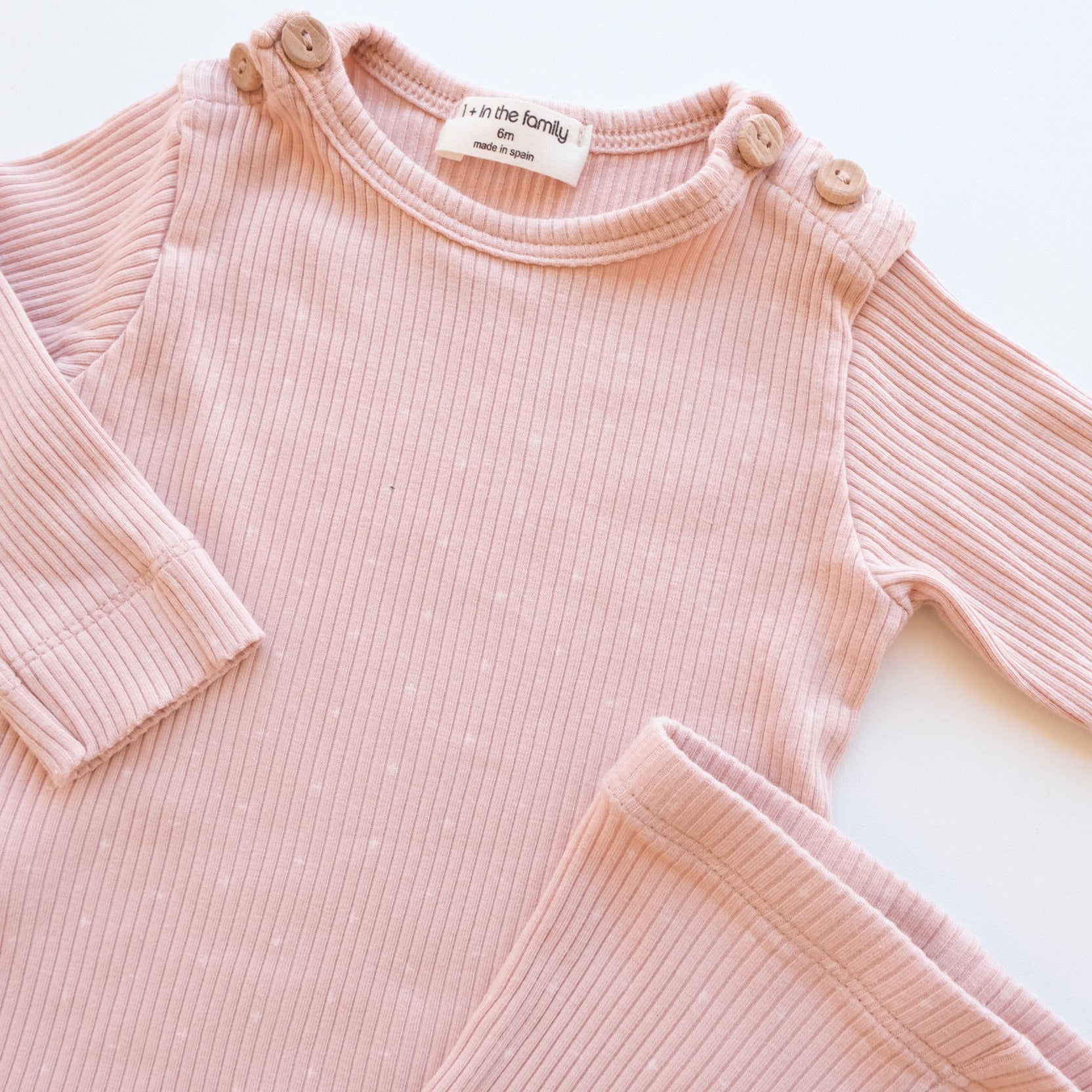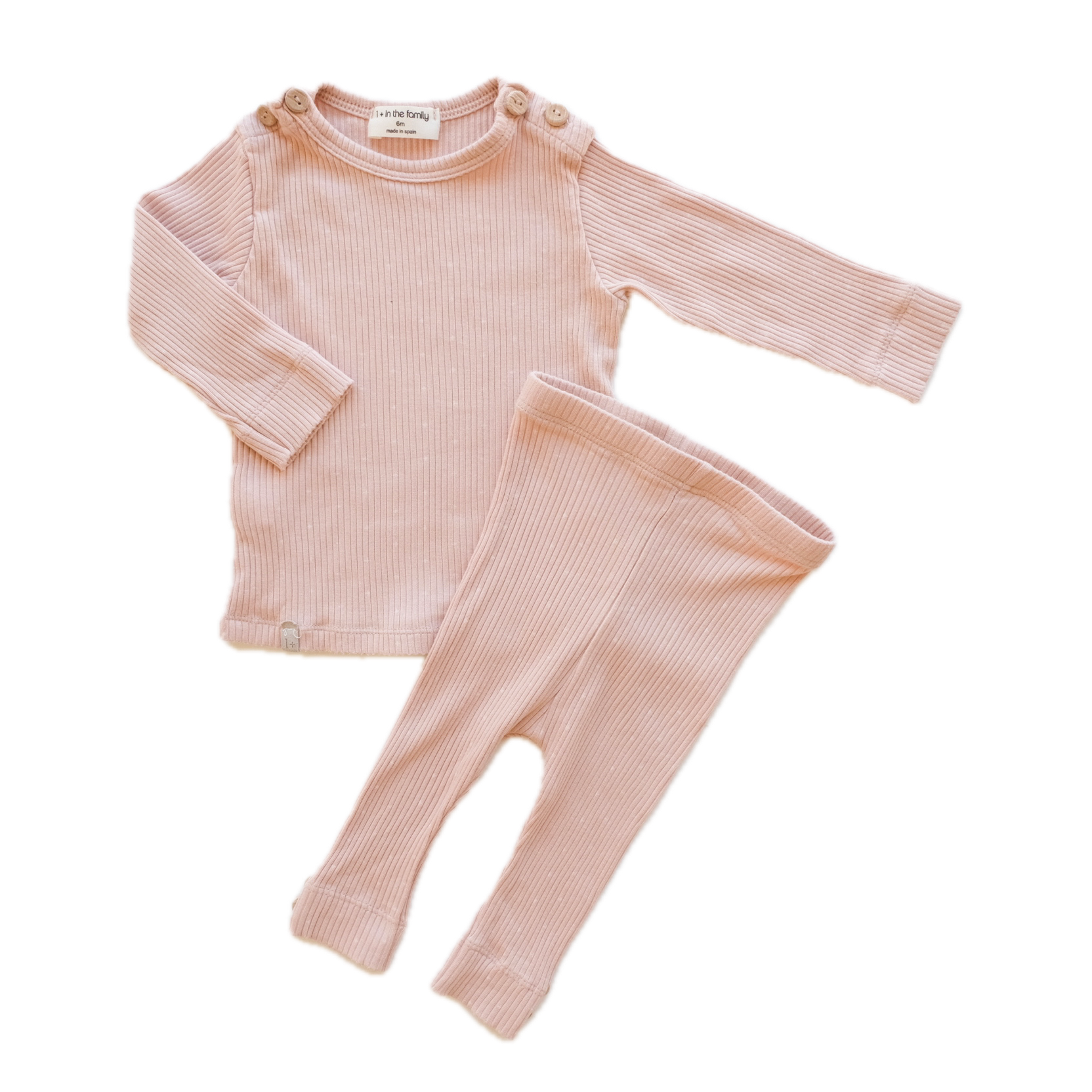 Ensemble 2 pièces en coton côtelé, coloris rose, comprenant : un t-shirt à manches longues, boutonnières aux épaules et son legging assorti.