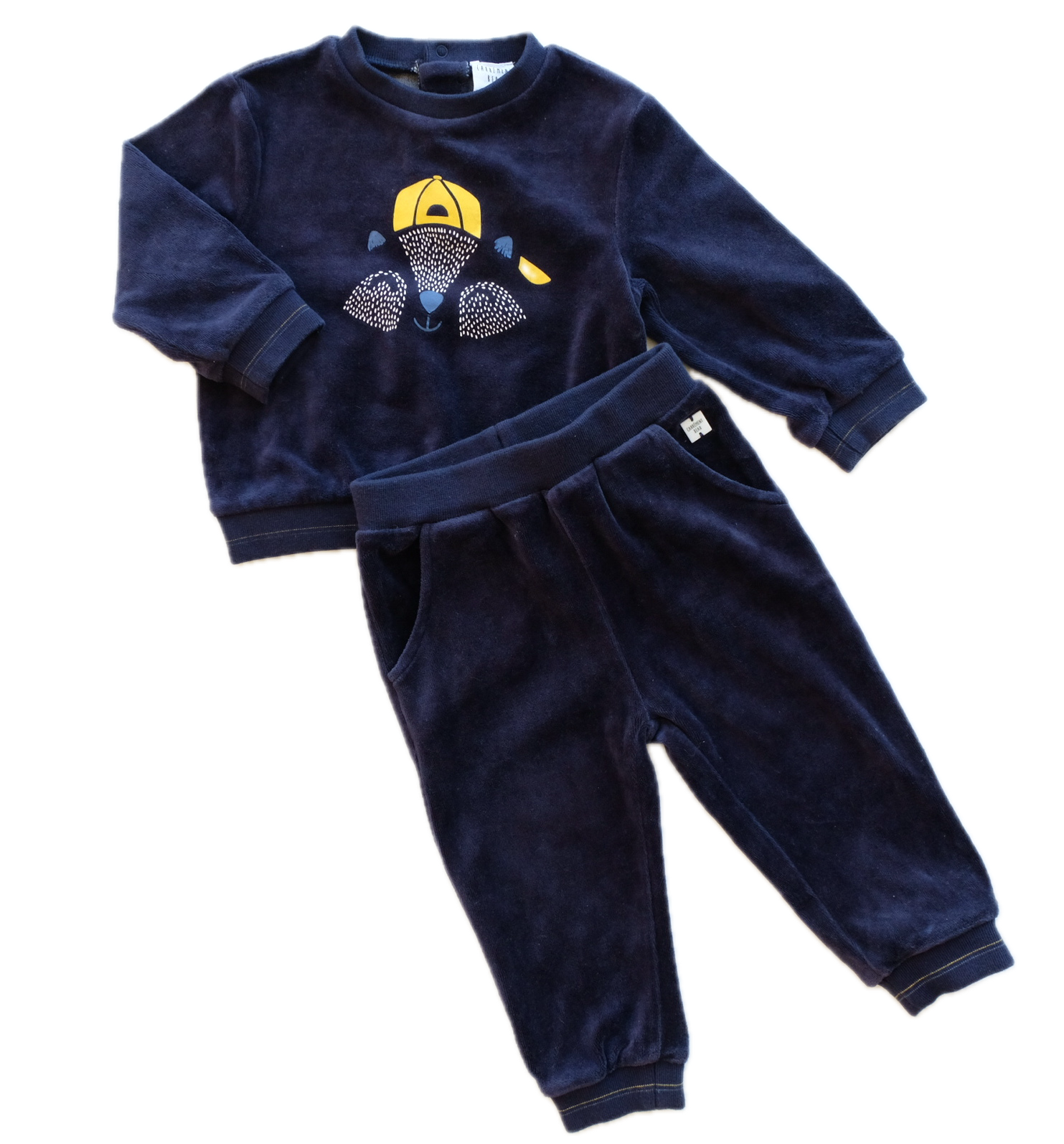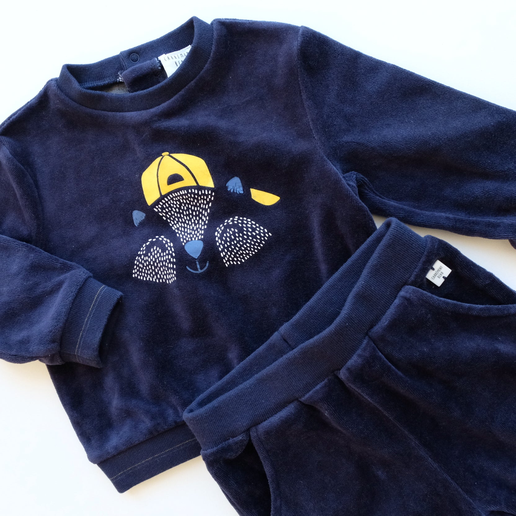 Ensemble 2 pièces en velours coloris bleu marine, comprenant : un sweat à manches longues, imprimé castor au devant et son jogger assorti. Très chouette et confortable !