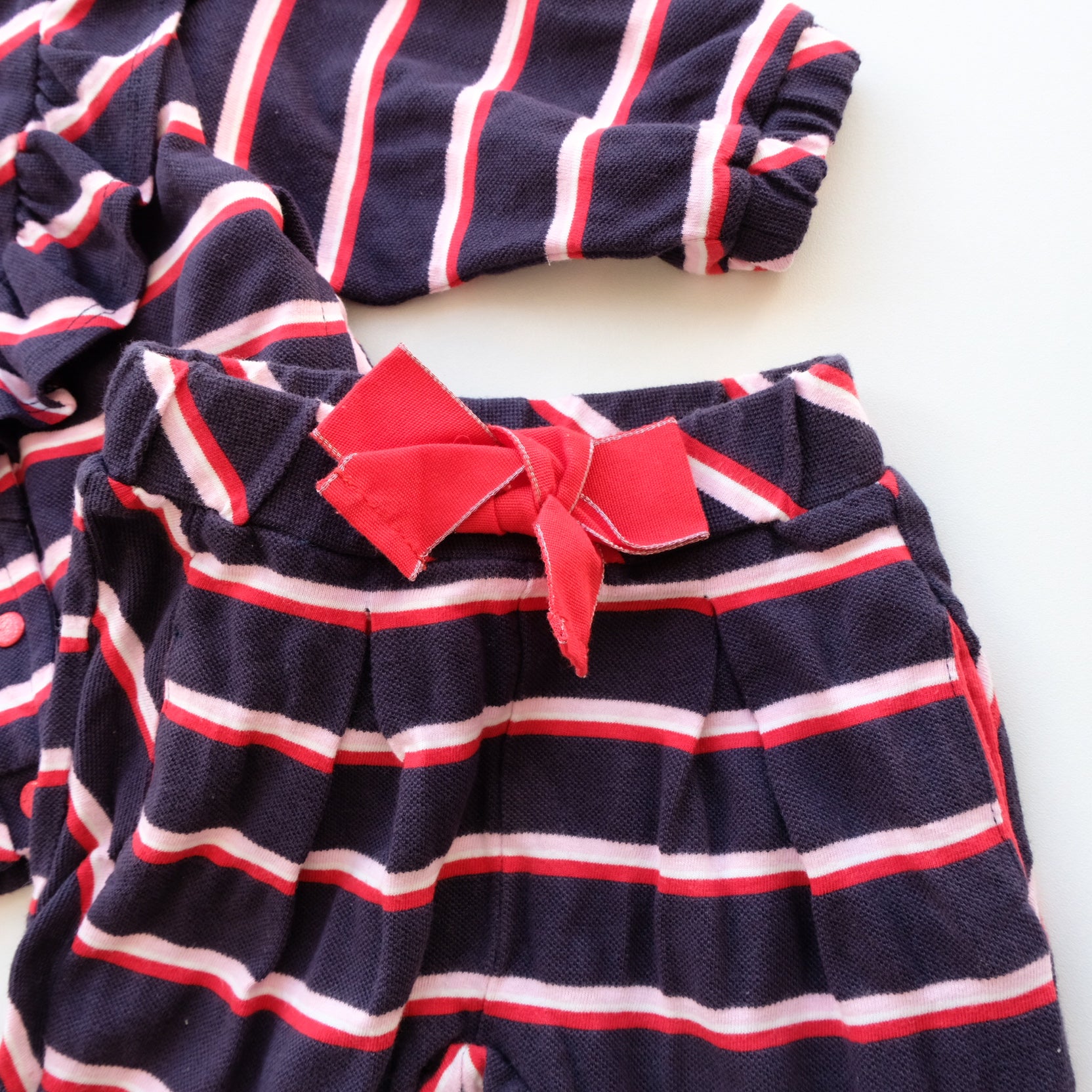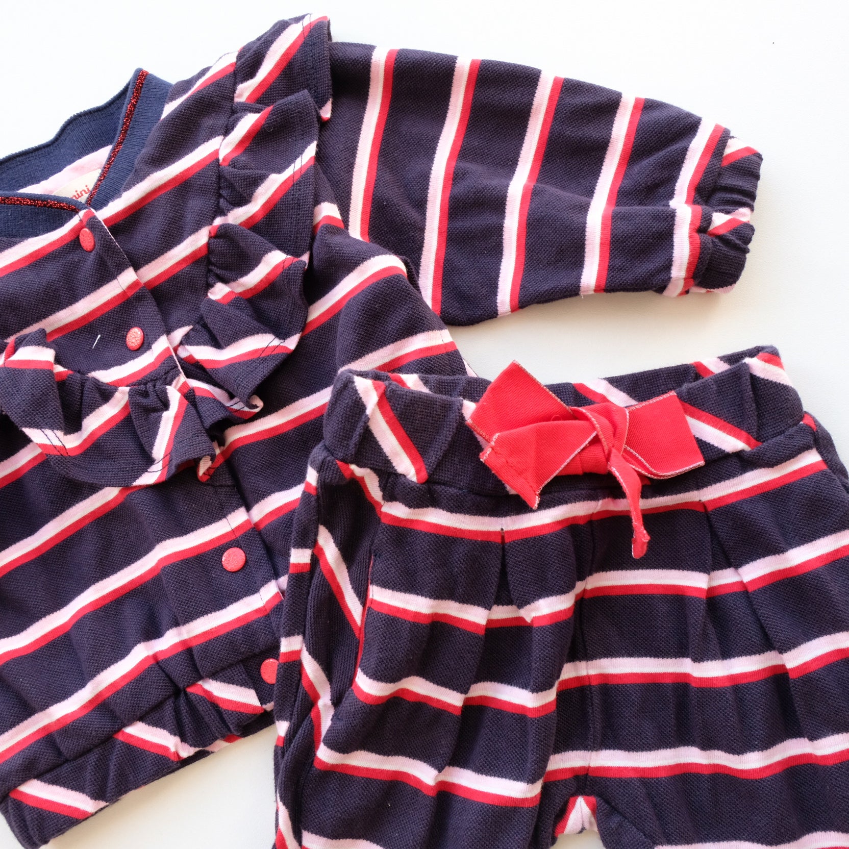 Adorable ensemble 2 pièces en coton matière polo. Coloris bleu marine, rayures rose rouge et blanc all over. Cet ensemble comprenant : un gilet à manches longues avec un beau volant au devant et une boutonnière à pressions rouge paillettes. Détail liseré paillettes rouges au niveau du col. Et un pantalon confortable assorti avec joli noeud rouge fantaisie à la taille. Très chouette !