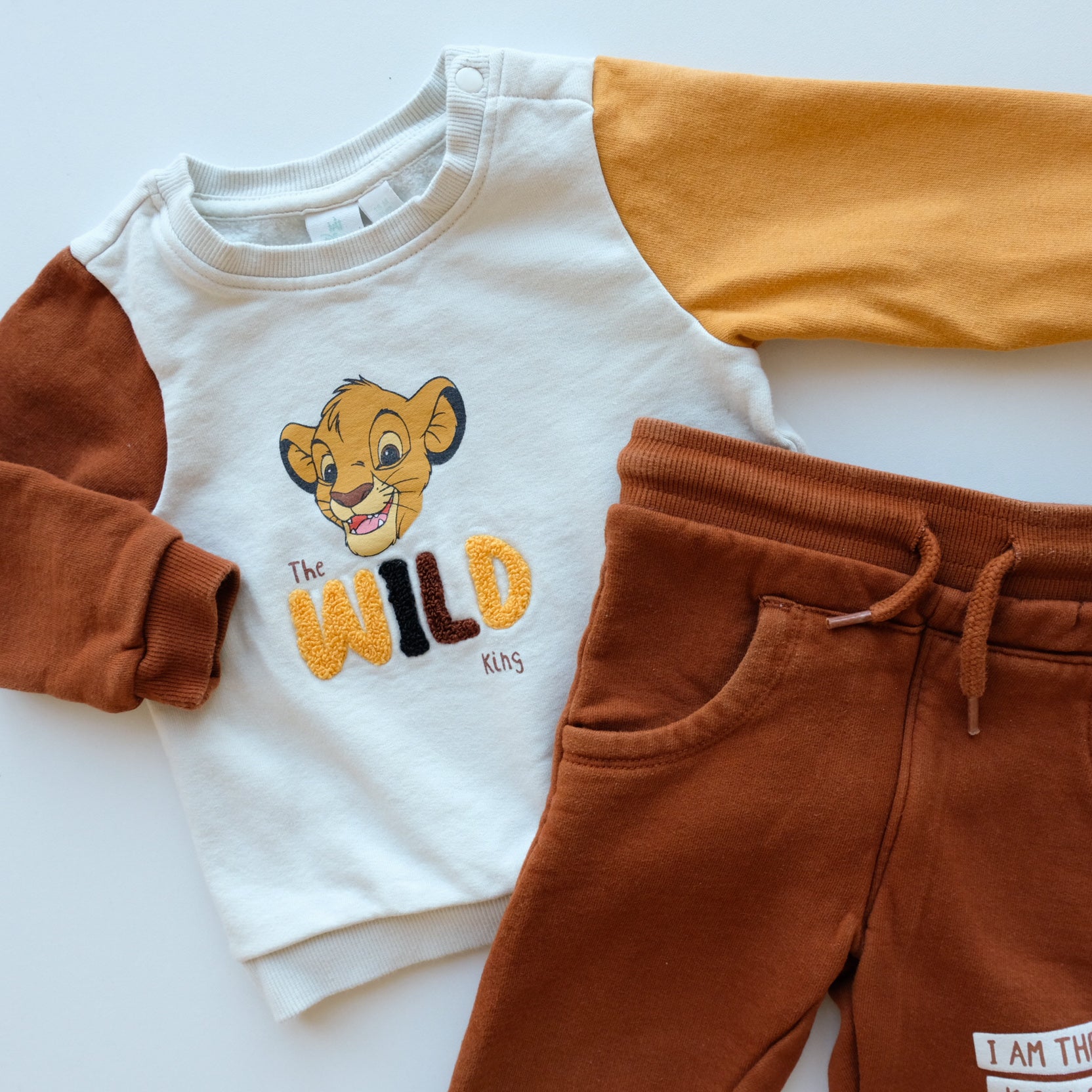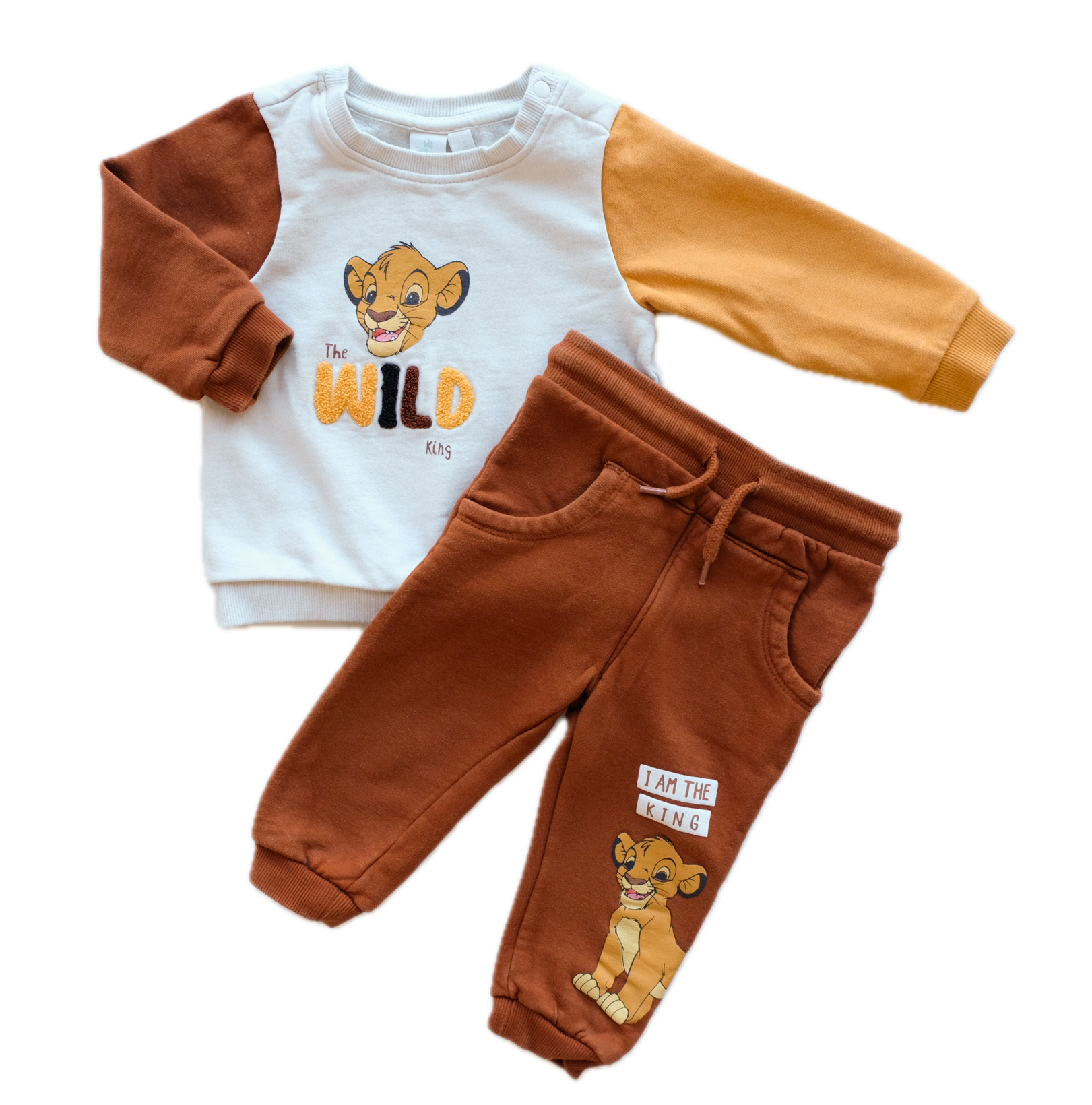 Ensemble 2 pièces en coton, comprenant : un sweat à manches longues color block et son jogger assorti. Collection Disney Baby : Le Roi Lion. Imprimé Simba au devant.