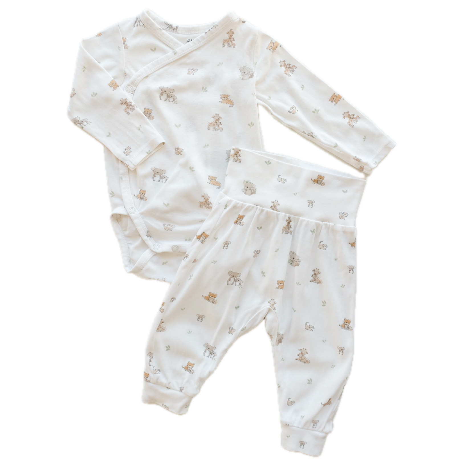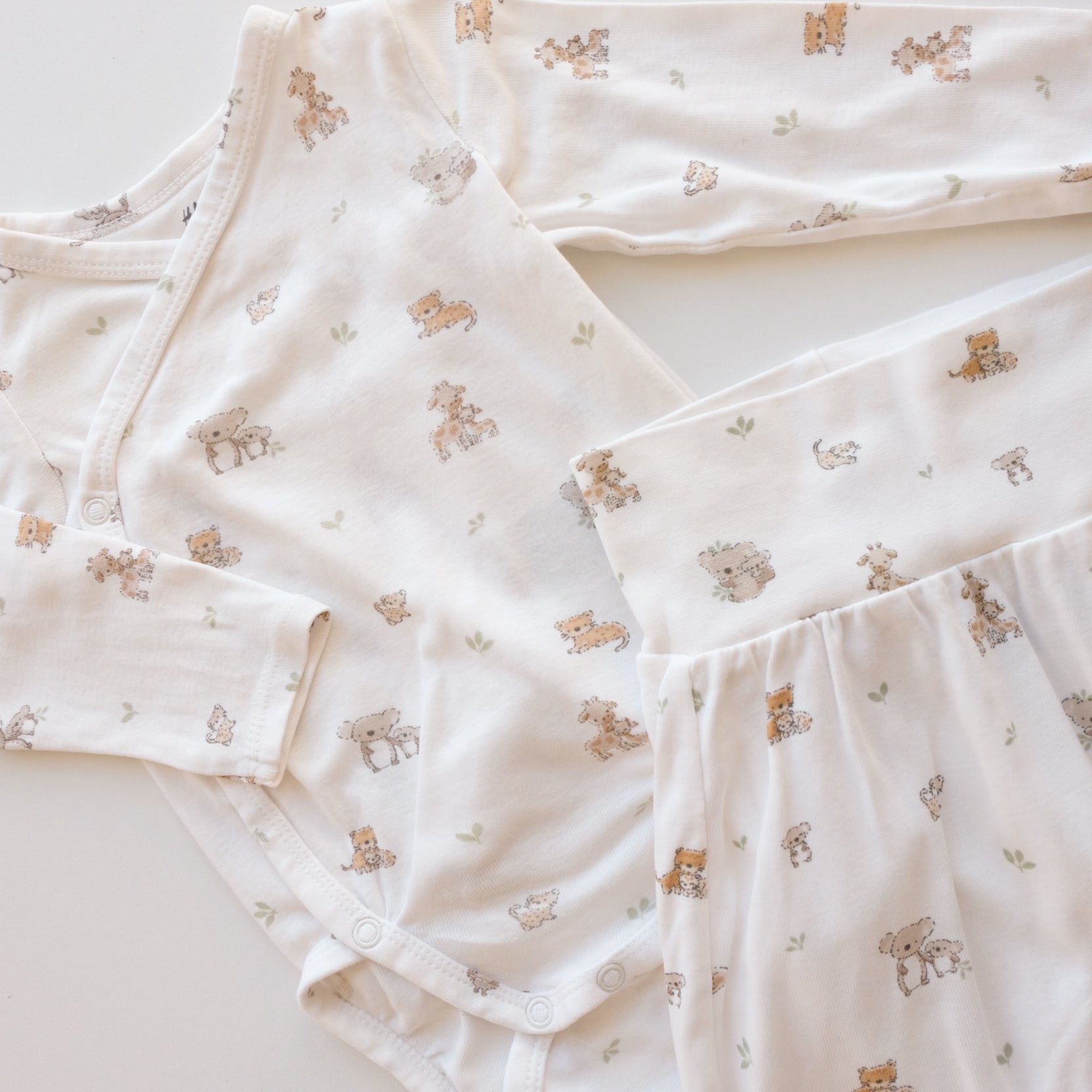 Ensemble 2 pièces comprenant un body croisé à manches longues et son legging assorti. En coton biologique. Coloris blanc imprimé animaux mignons all over. Mixte.