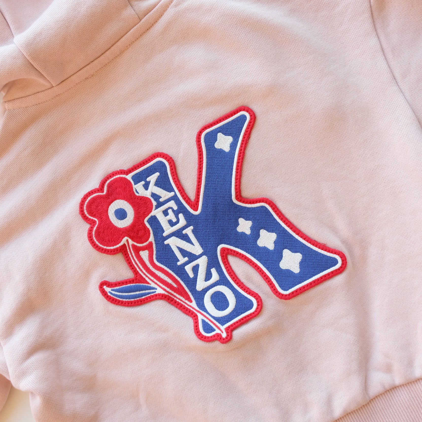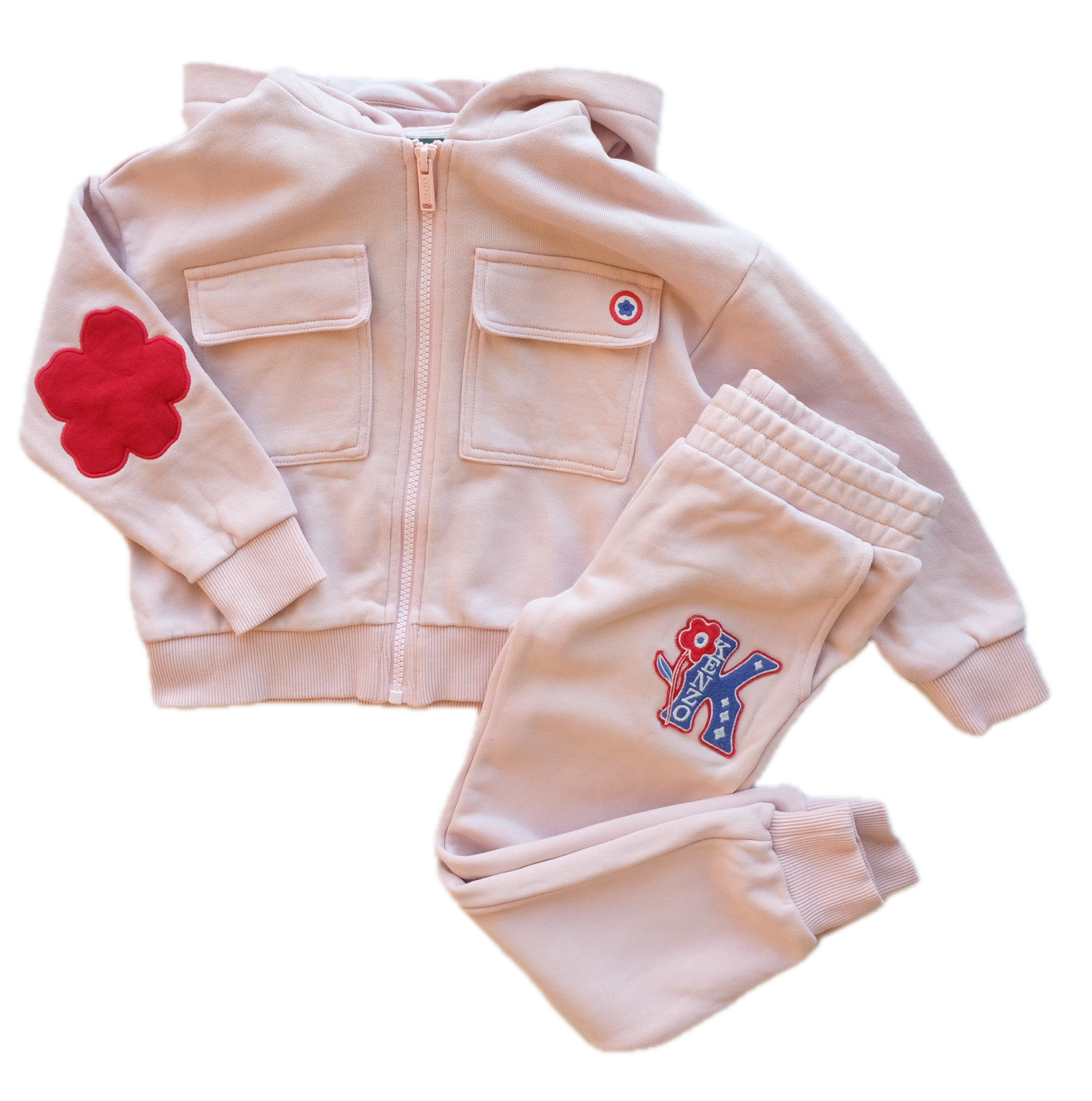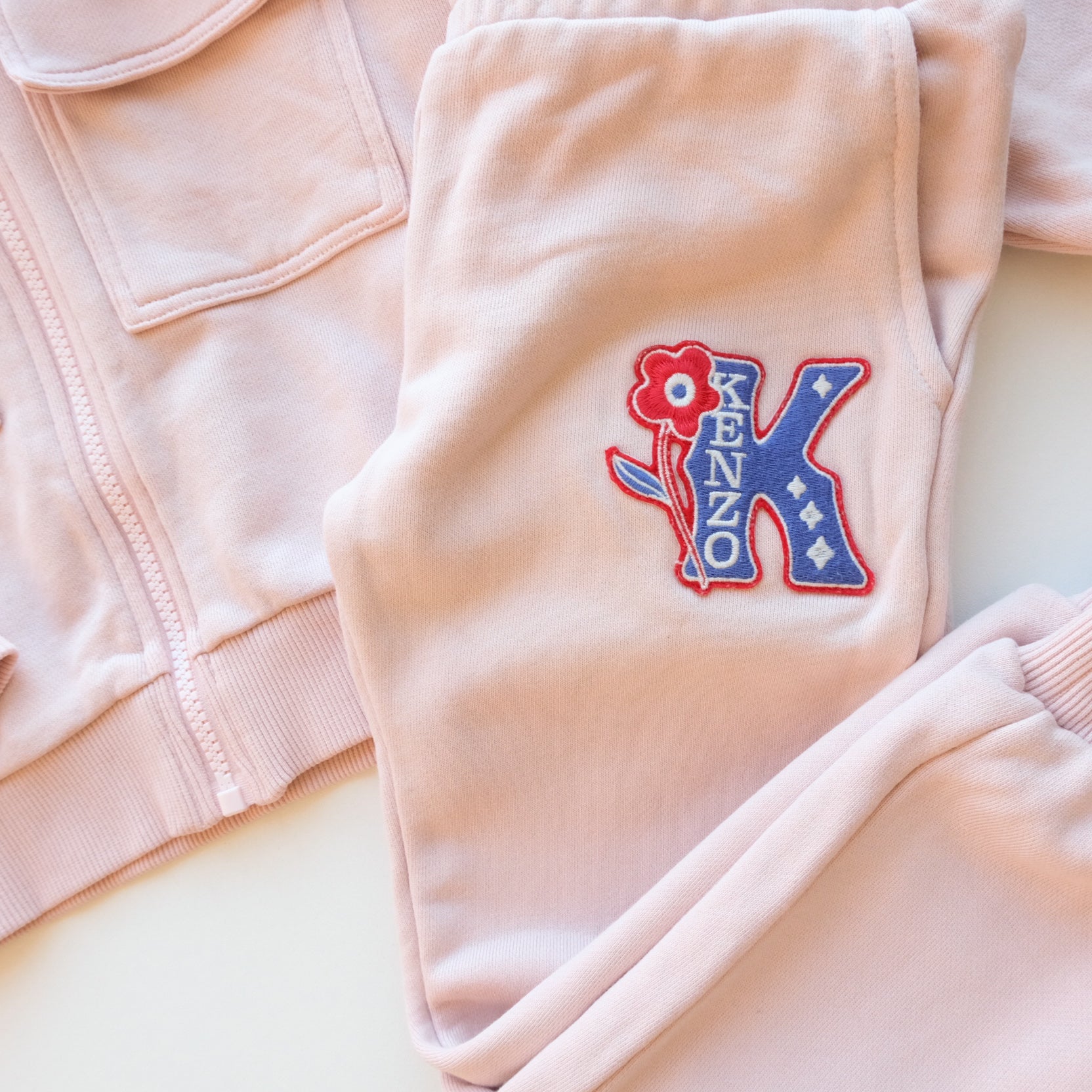 Ensemble 2 pièces en coton, coloris rose pâle comprenant : une veste zippée avec 2 poches au devant. Empiècement "K" cousu au dos. Pantalon, jogger assorti, rappel du "K" en haut de la jambe. Très beau !
