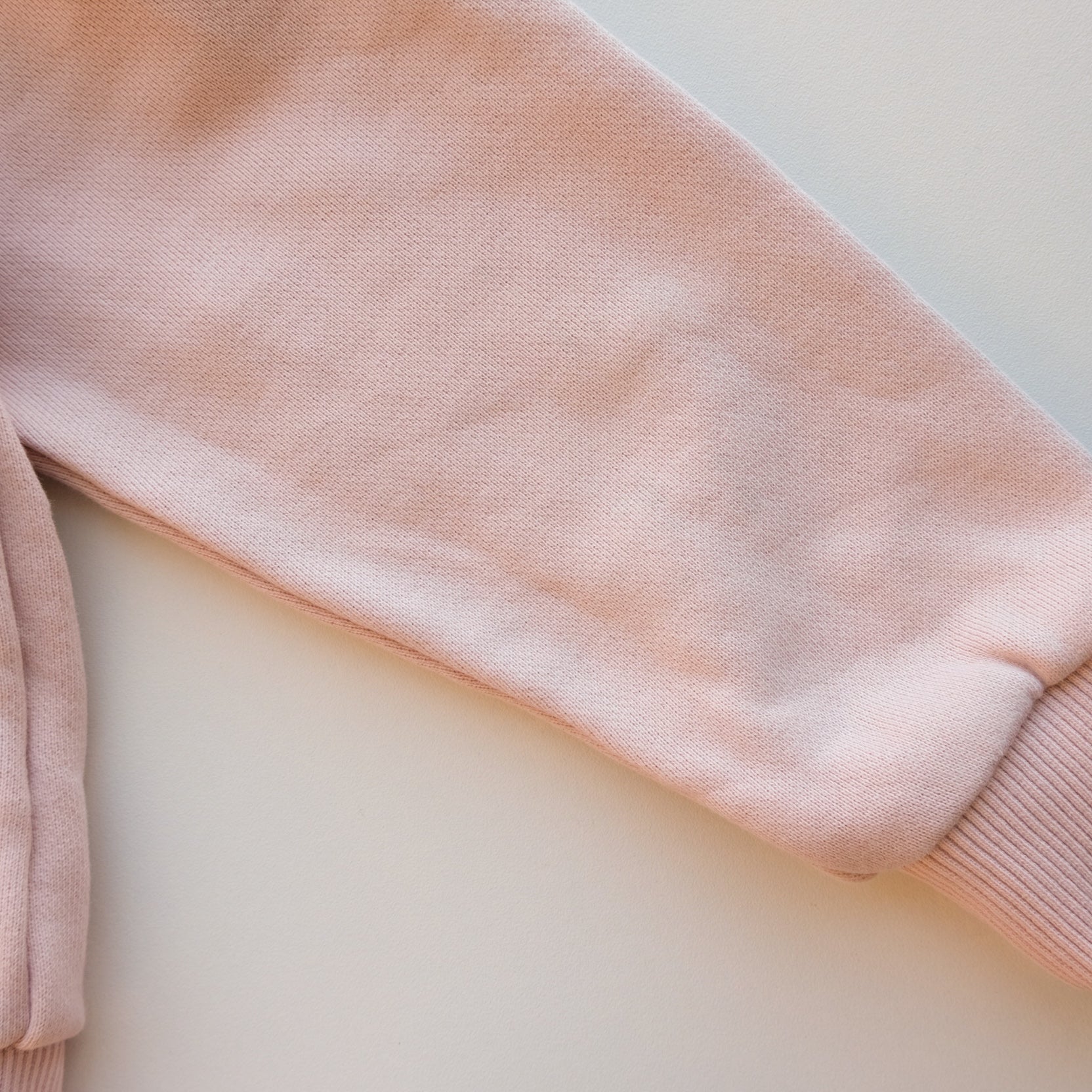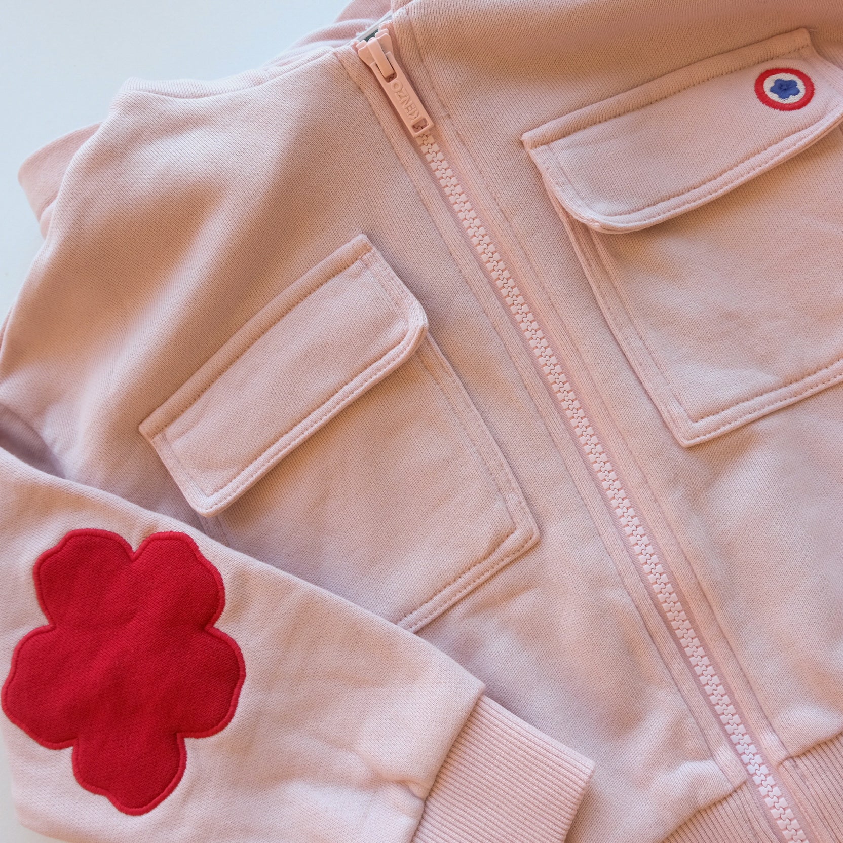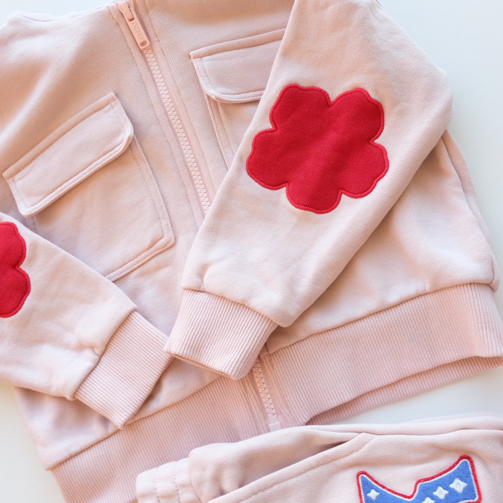 Ensemble 2 pièces en coton, coloris rose pâle comprenant : une veste zippée avec 2 poches au devant. Empiècement "K" cousu au dos. Pantalon, jogger assorti, rappel du "K" en haut de la jambe. Très beau !