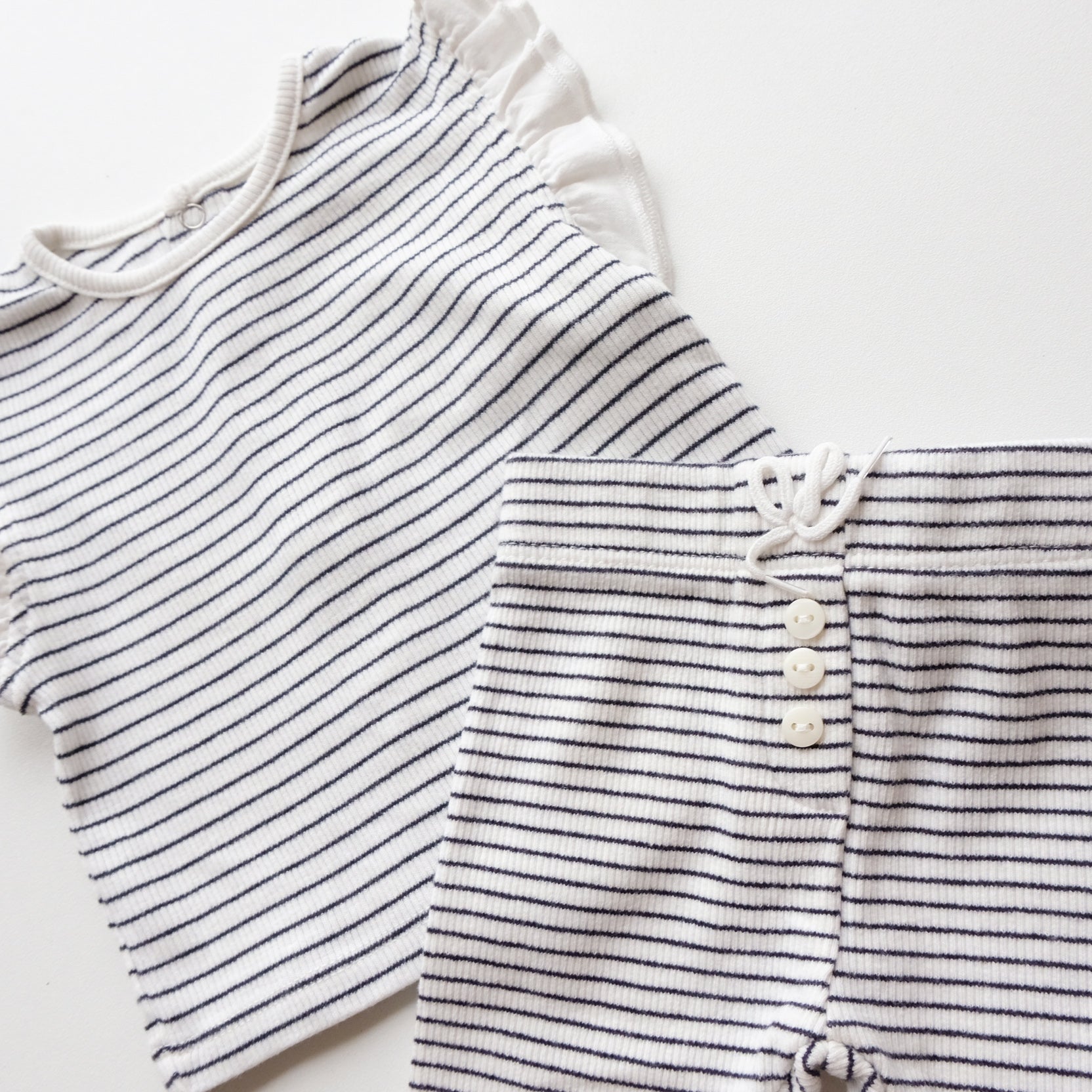 Ensemble 2 pièces en coton côtelé biologique. Coloris blanc imprimé fines rayures bleu marine all over. Ensemble comprenant : un petit t-shirt, volanté au niveau des épaules et un legging assorti, finitions froufrous. Trop mignon !