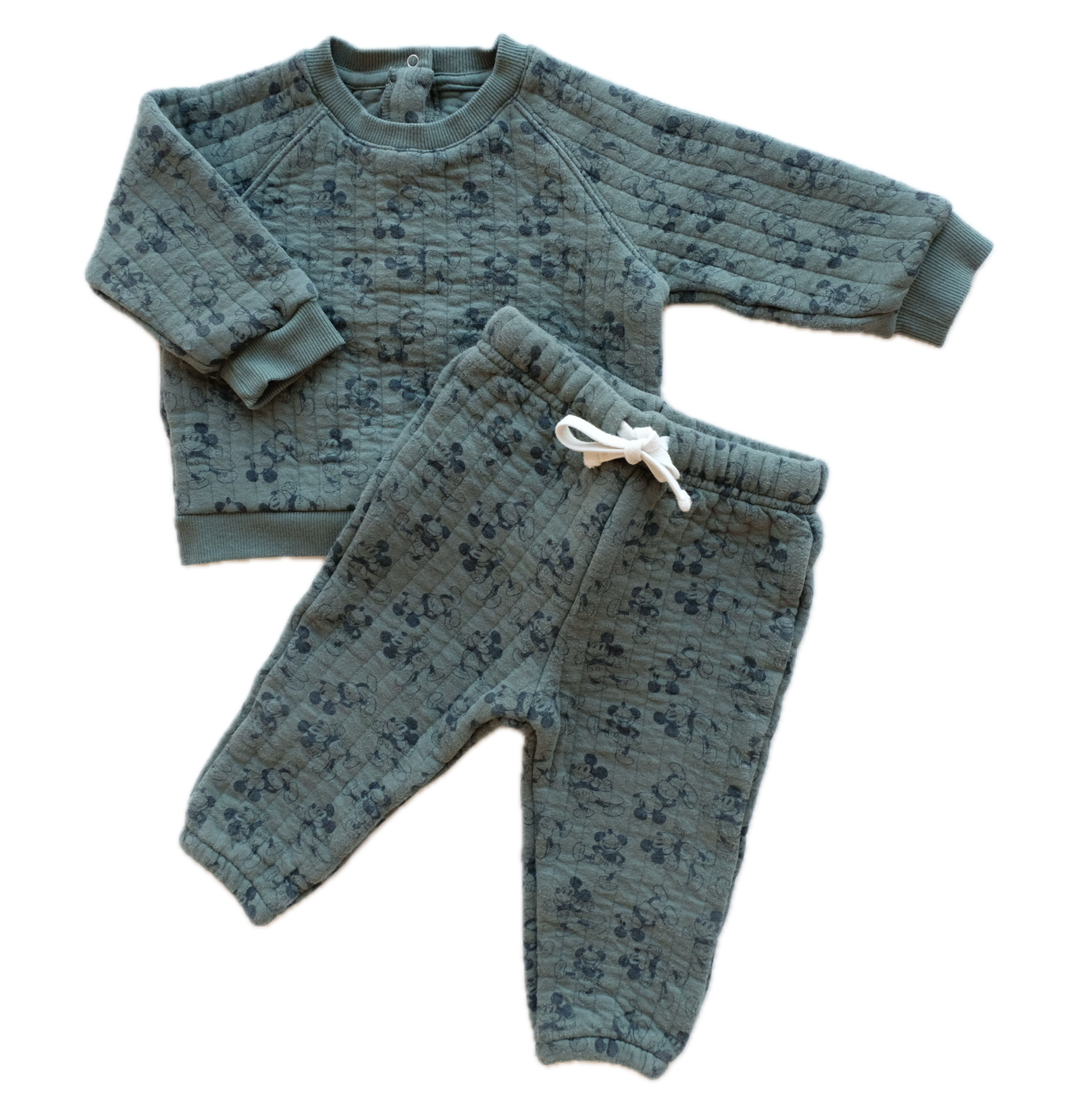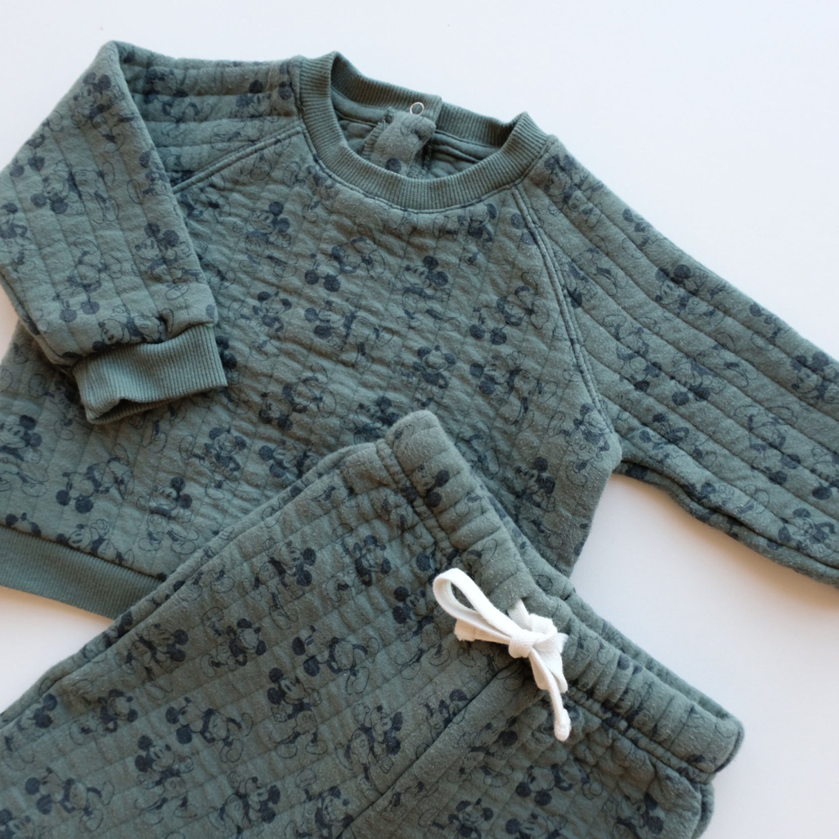 Ensemble 2 pièces en coton matelassé biologique, comprenant : un sweat à manches longues et son jogger assorti. Coloris vert foncé. Collection Disney : imprimé mickey all over.