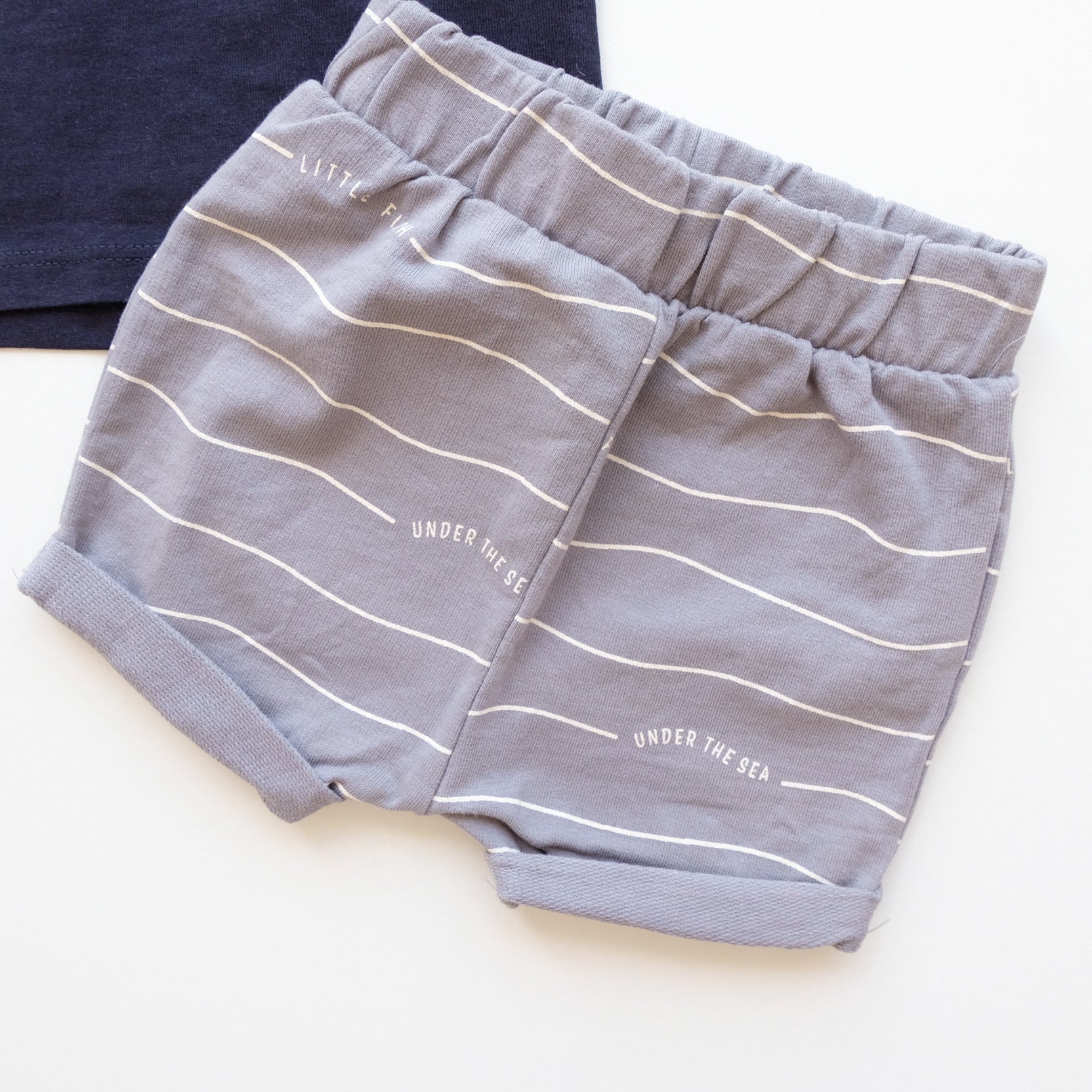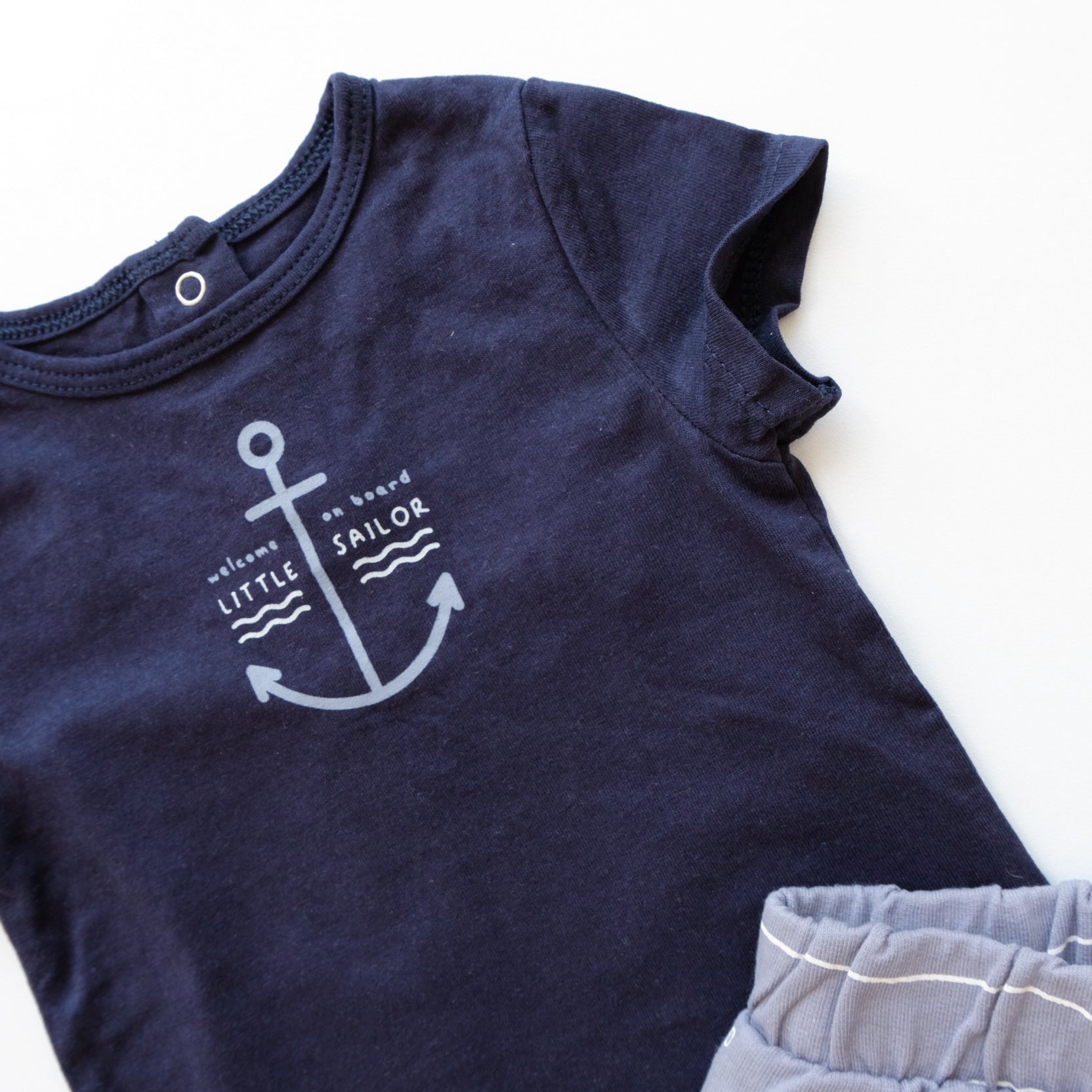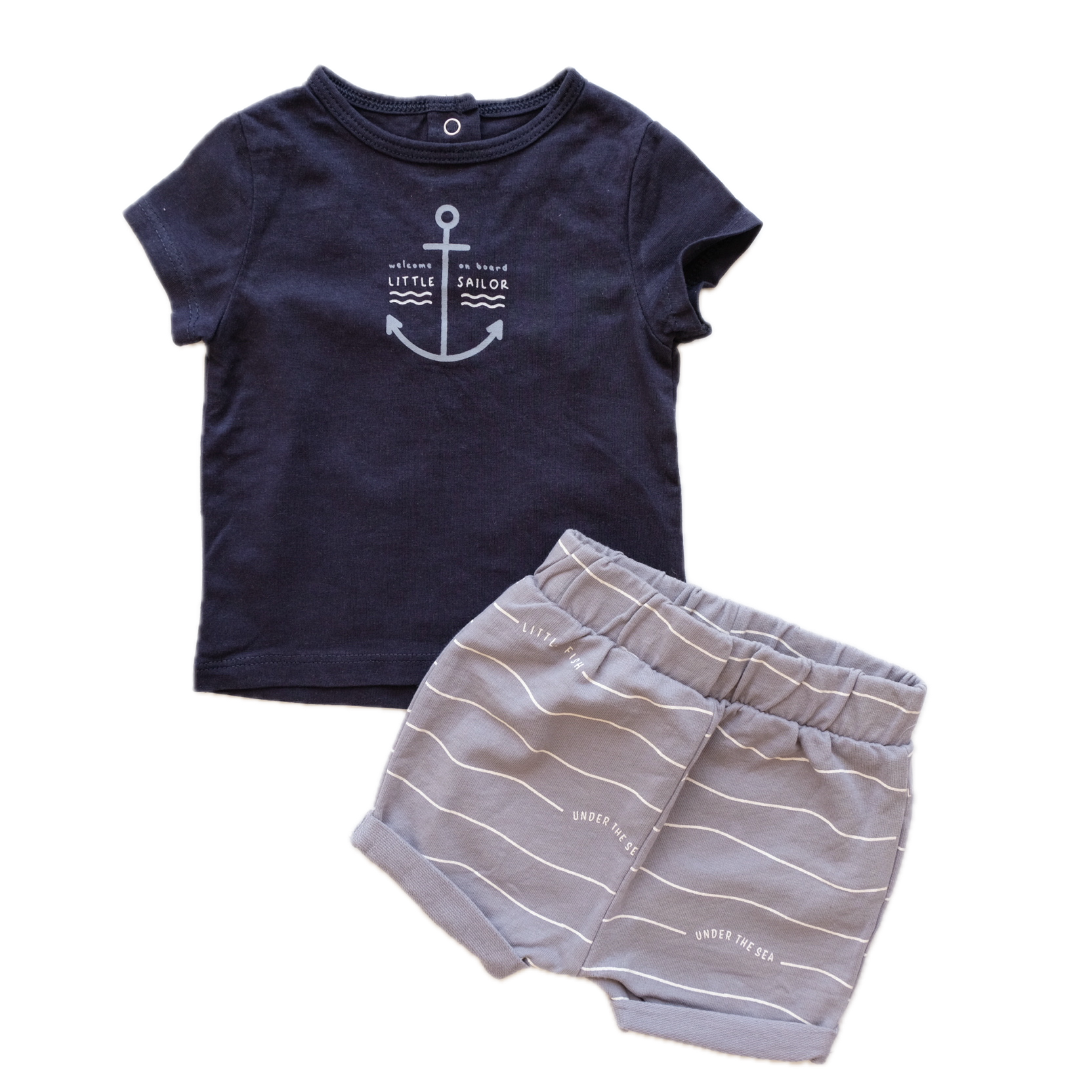 Ensemble 2 pièces en coton, comprenant : un t-shirt à manches courtes coloris bleu marine, imprimé ancre marine au devant "little sailor" et son petit short gris confortable assorti.