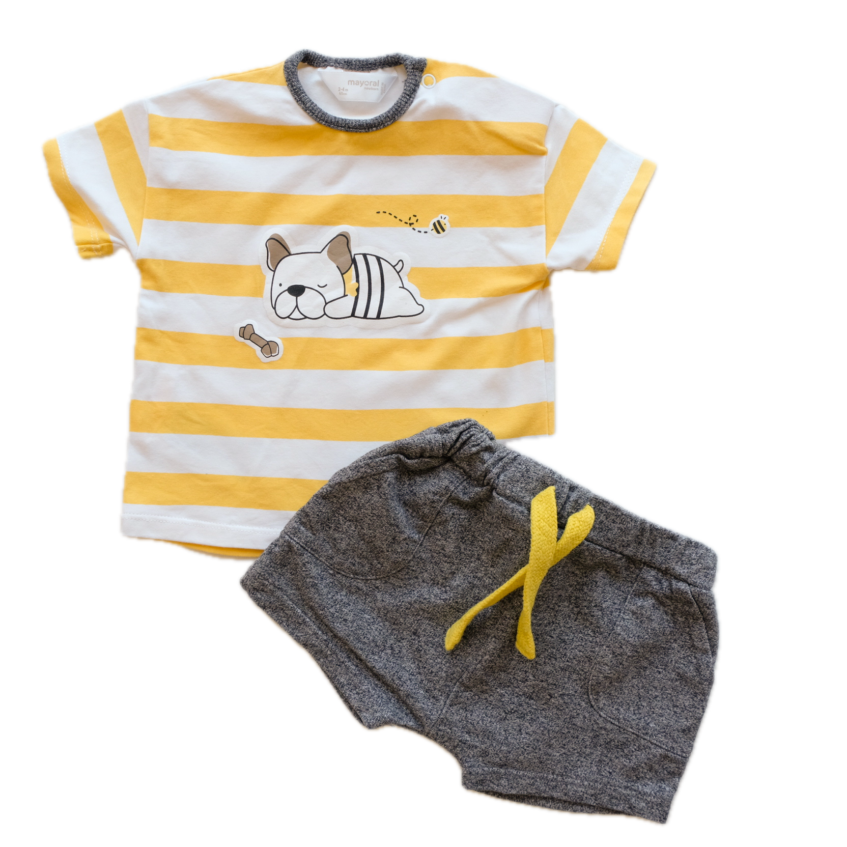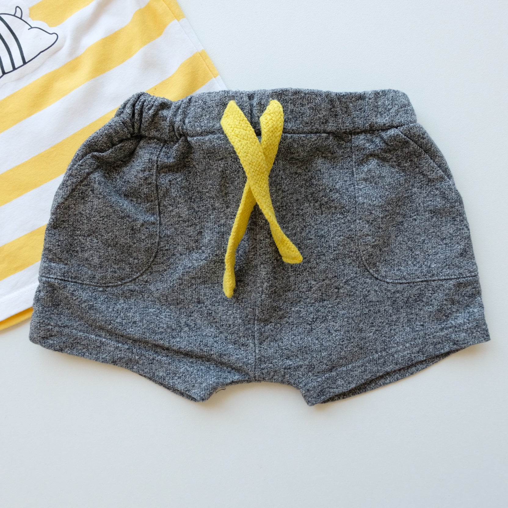 Ensemble 2 pièces comprenant : un t-shirt à manches courtes en coton, rayures coloris jaune et blanc, boutons pressions à l'épaule. et son petit short gris assorti. Super mignon.