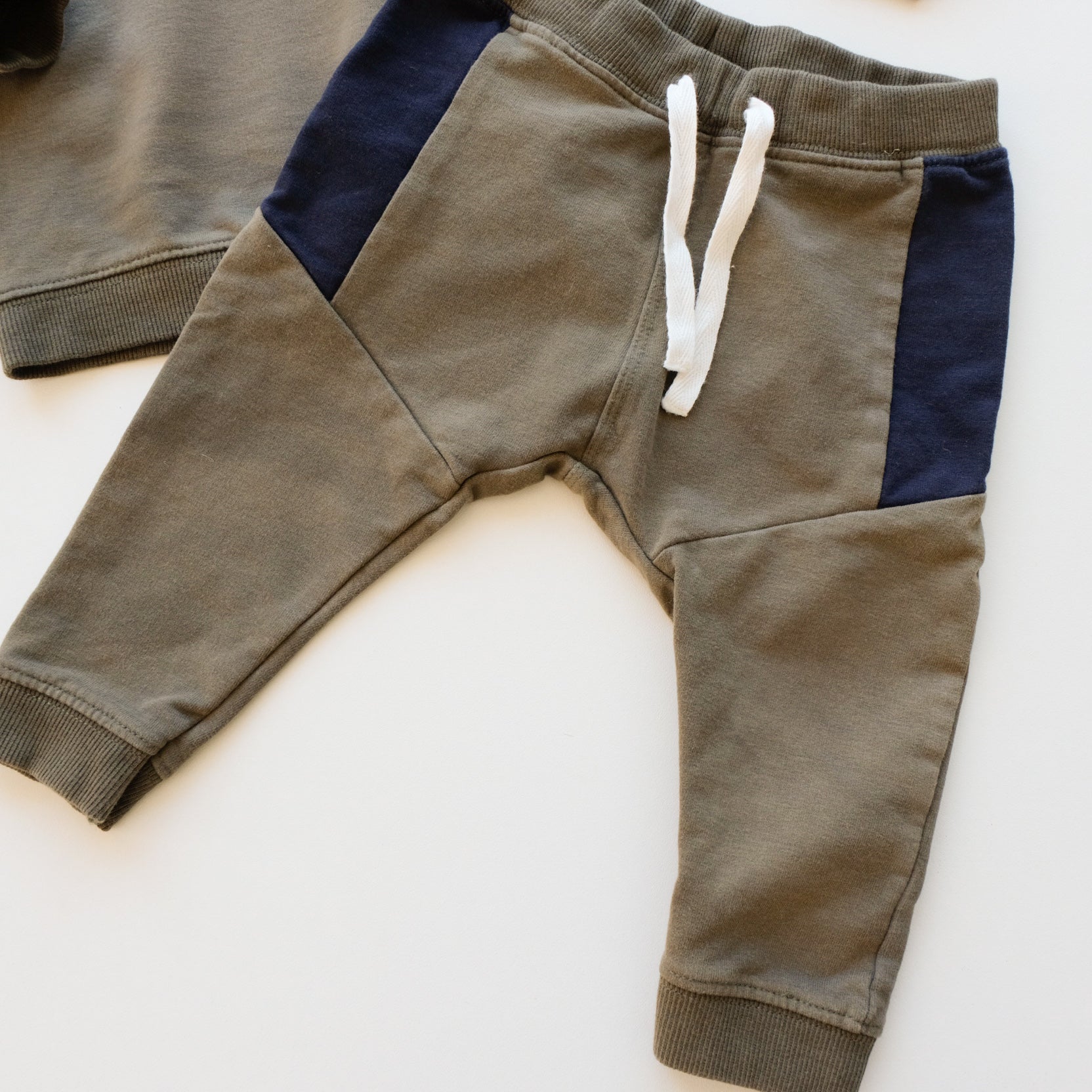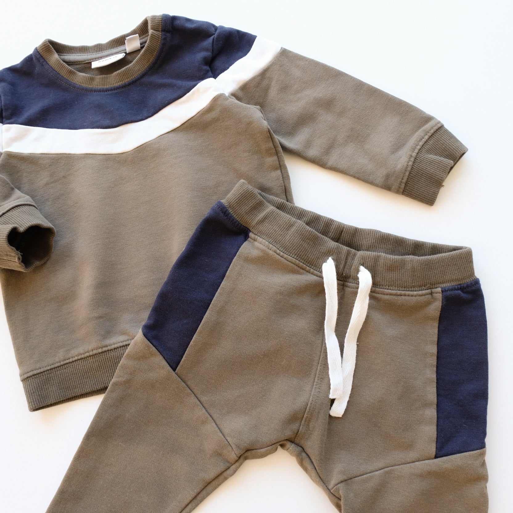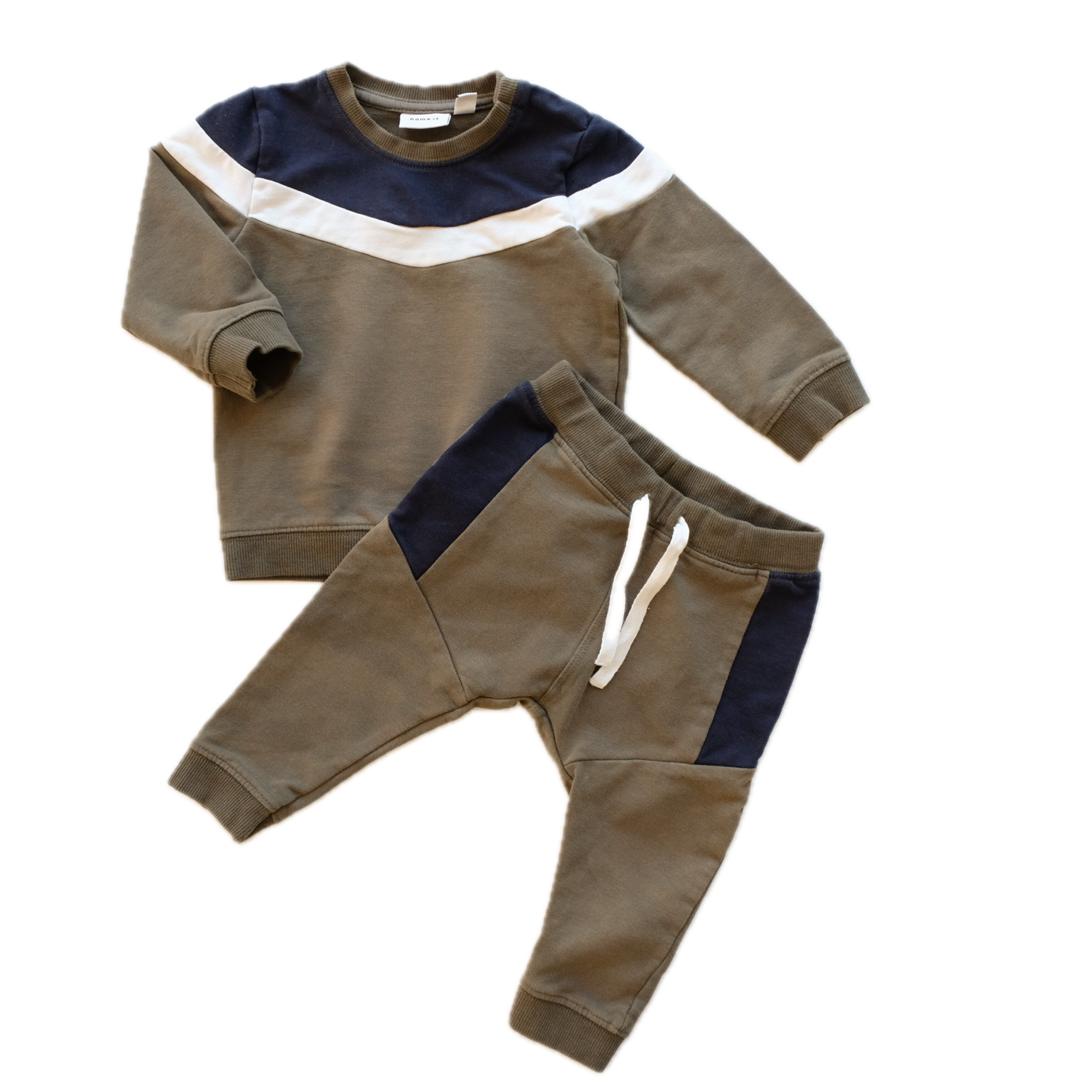 Ensemble 2 pièces en coton, coloris kaki, blanc et bleu marine, comprenant : un sweat à manches longues et son jogger assorti. Tout mignon !