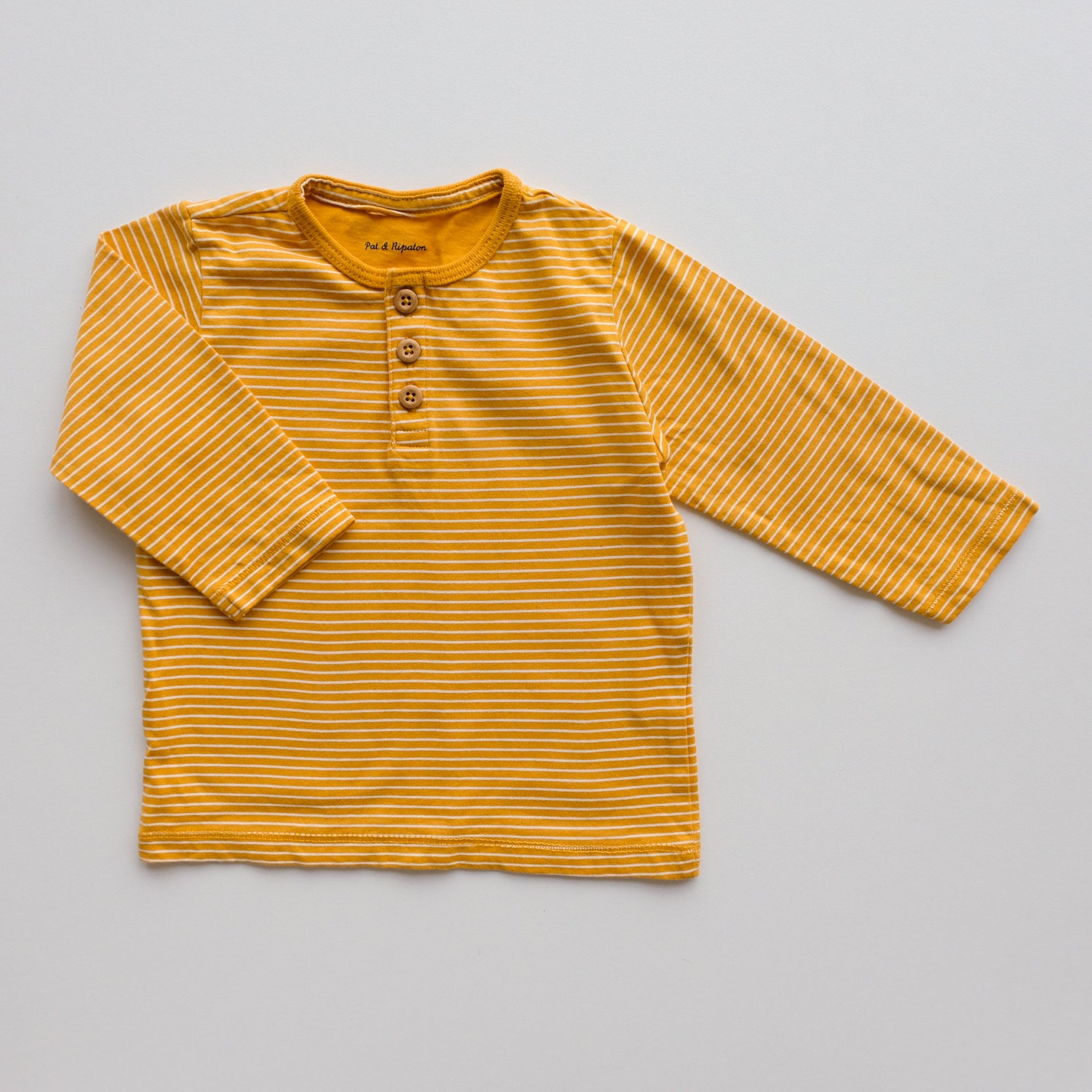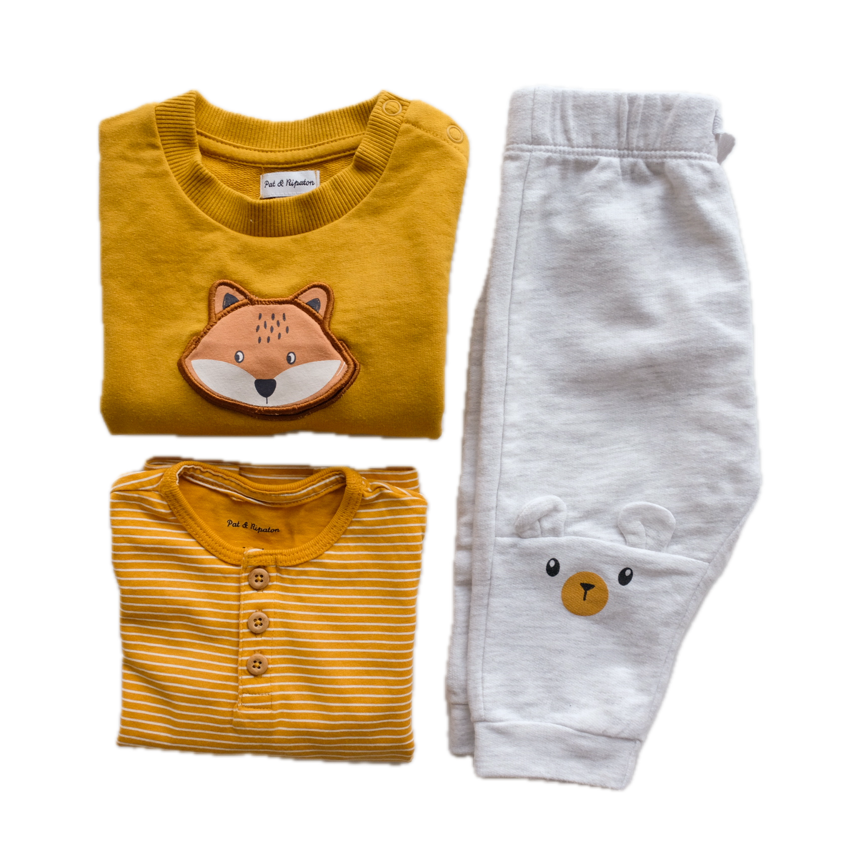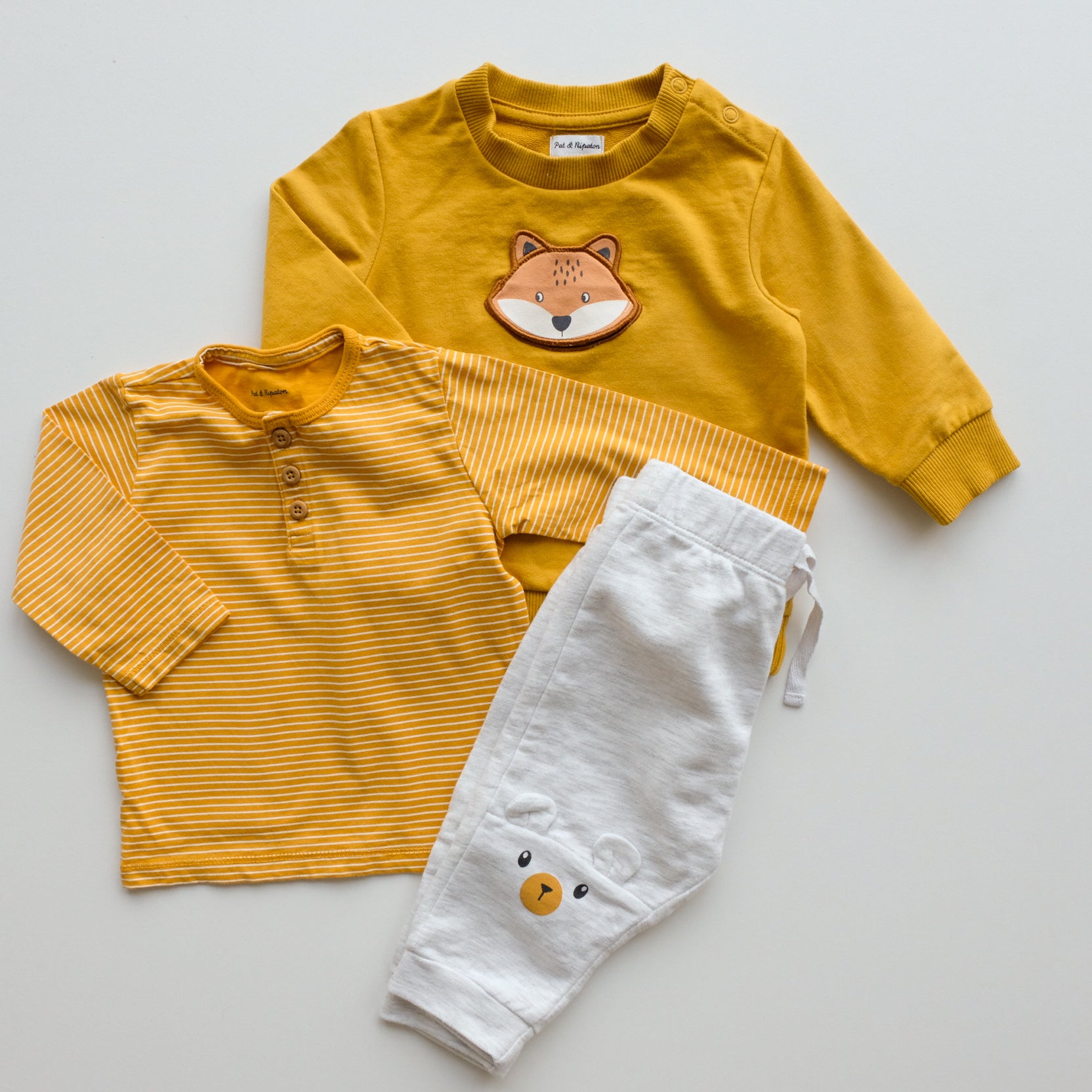 Ensemble, lot comprenant 3 pièces : un sweat à manches longues en coton, coloris jaune moutarde, un t-shirt à manches longues en coton, coloris moutarde et rayures blanc all over. Et un jogger en coton coloris gris/blanc.
