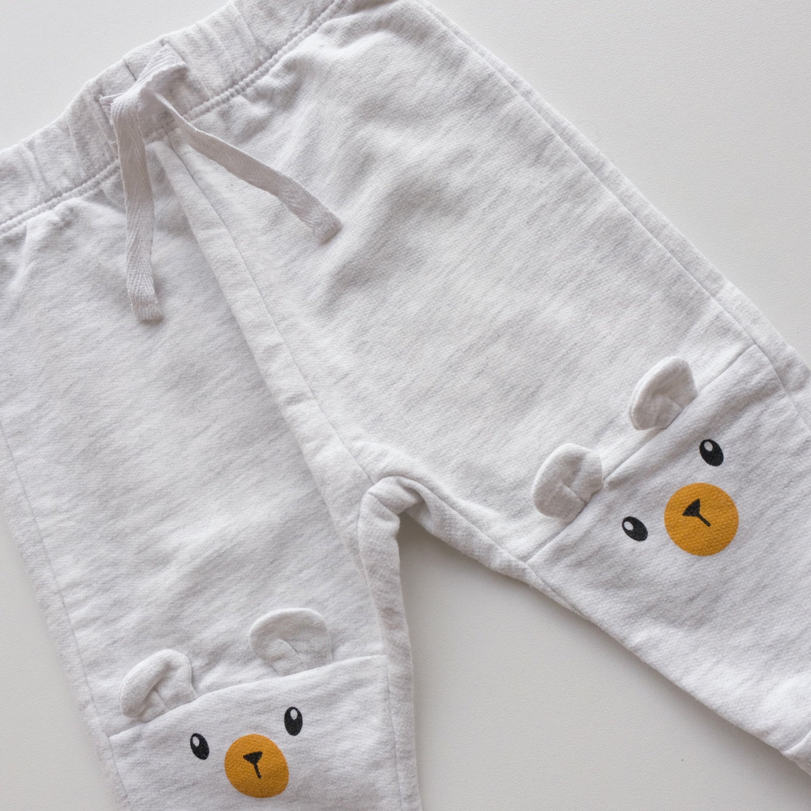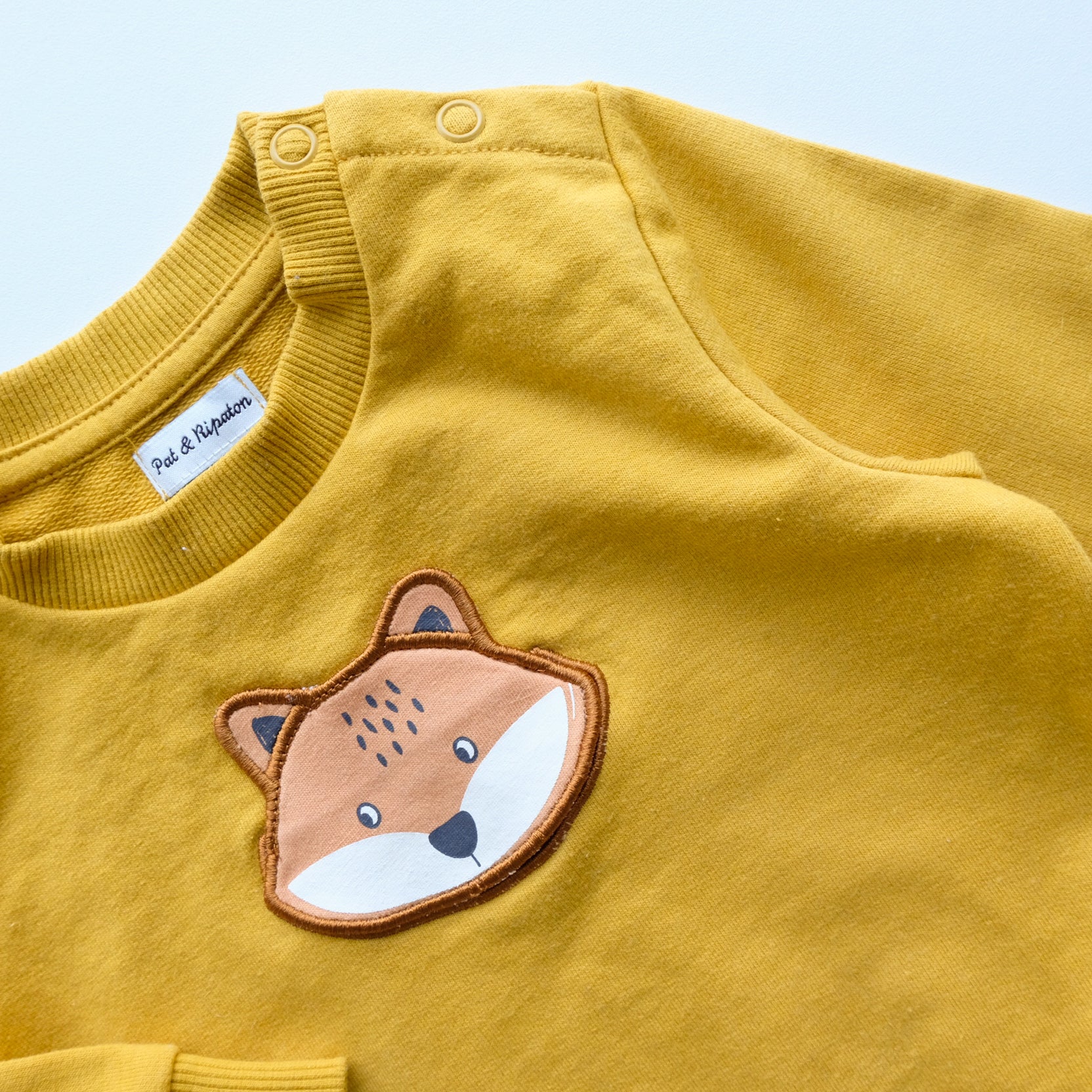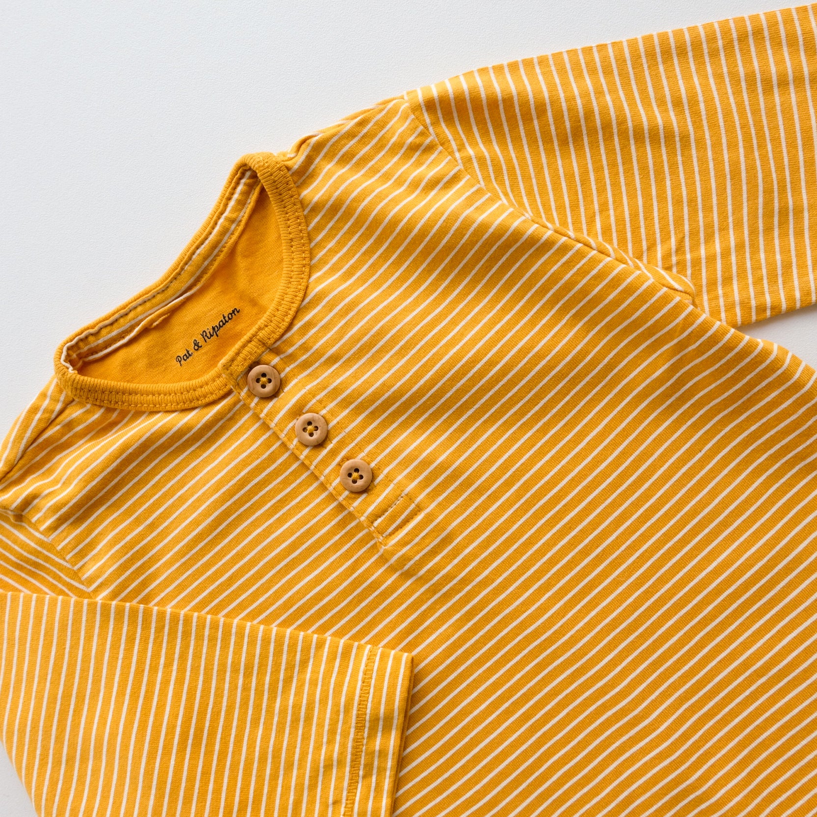 Ensemble, lot comprenant 3 pièces : un sweat à manches longues en coton, coloris jaune moutarde, un t-shirt à manches longues en coton, coloris moutarde et rayures blanc all over. Et un jogger en coton coloris gris/blanc.