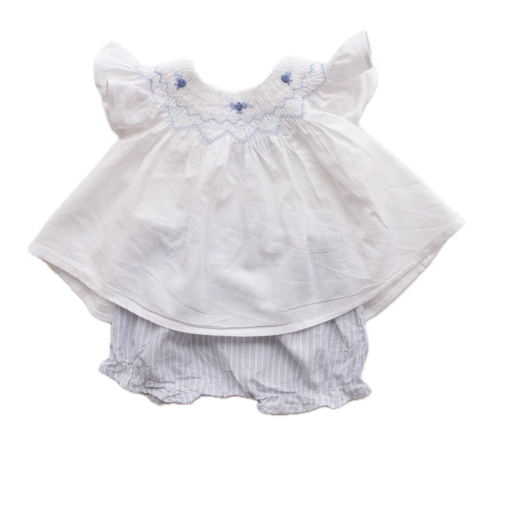 Adorable ensemble 2 pièces comprenant : une blouse en coton blanc, volantée aux épaules. Smockée au niveau du col, détails petites fleurs bleues, boutonnière le long du dos. Et son bloomer rayé bleu et blanc assorti. Trop chic et chou.