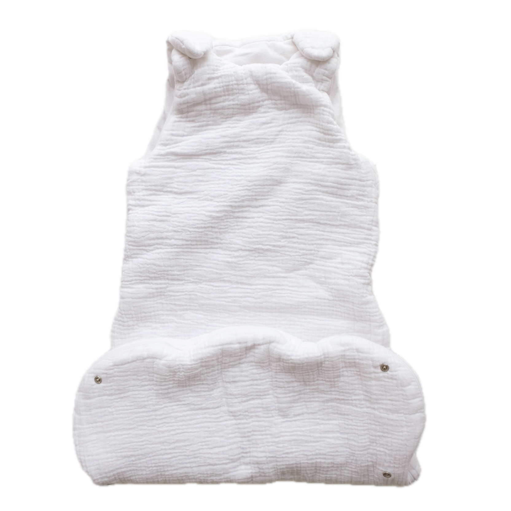 Gigoteuse, turbulette chaude en gaze de coton, doublure en coton, rembourrage polyester. Coloris blanc uni. Mixte. Bretelles pressionnées et zip sur le côté. TOG : 3. Parfaite pour l'automne/hiver.