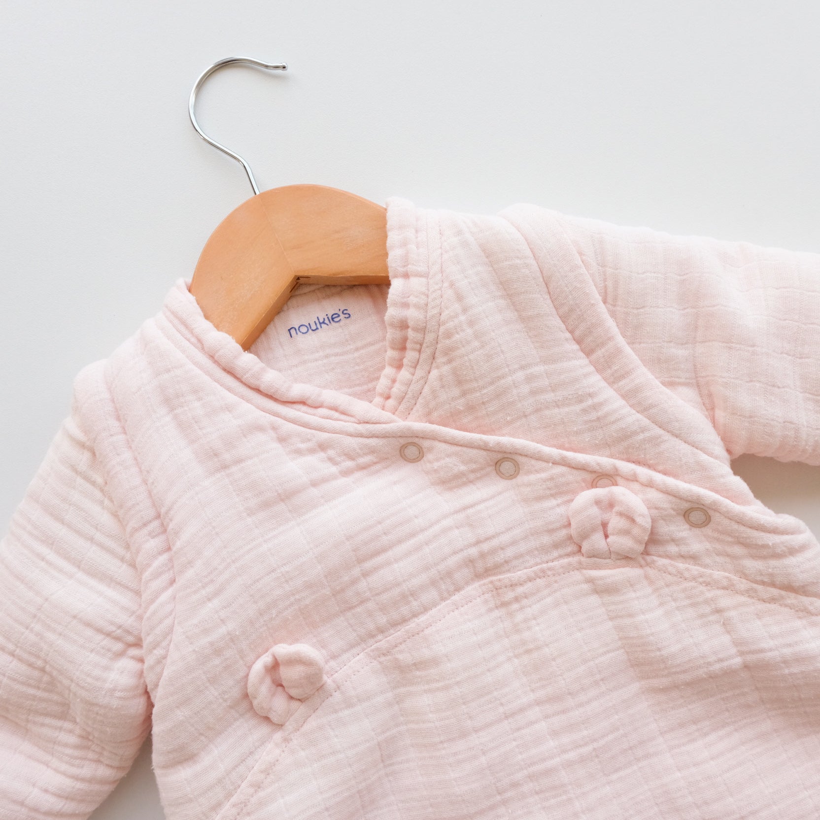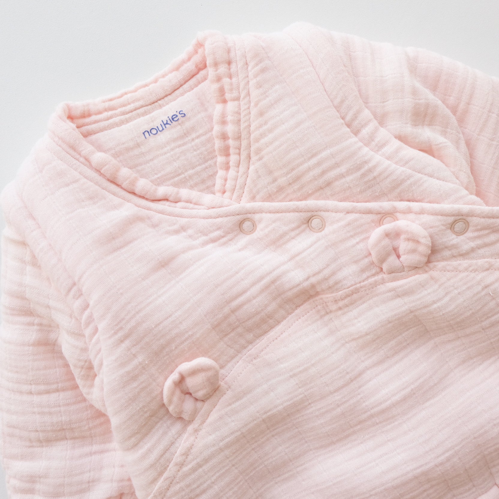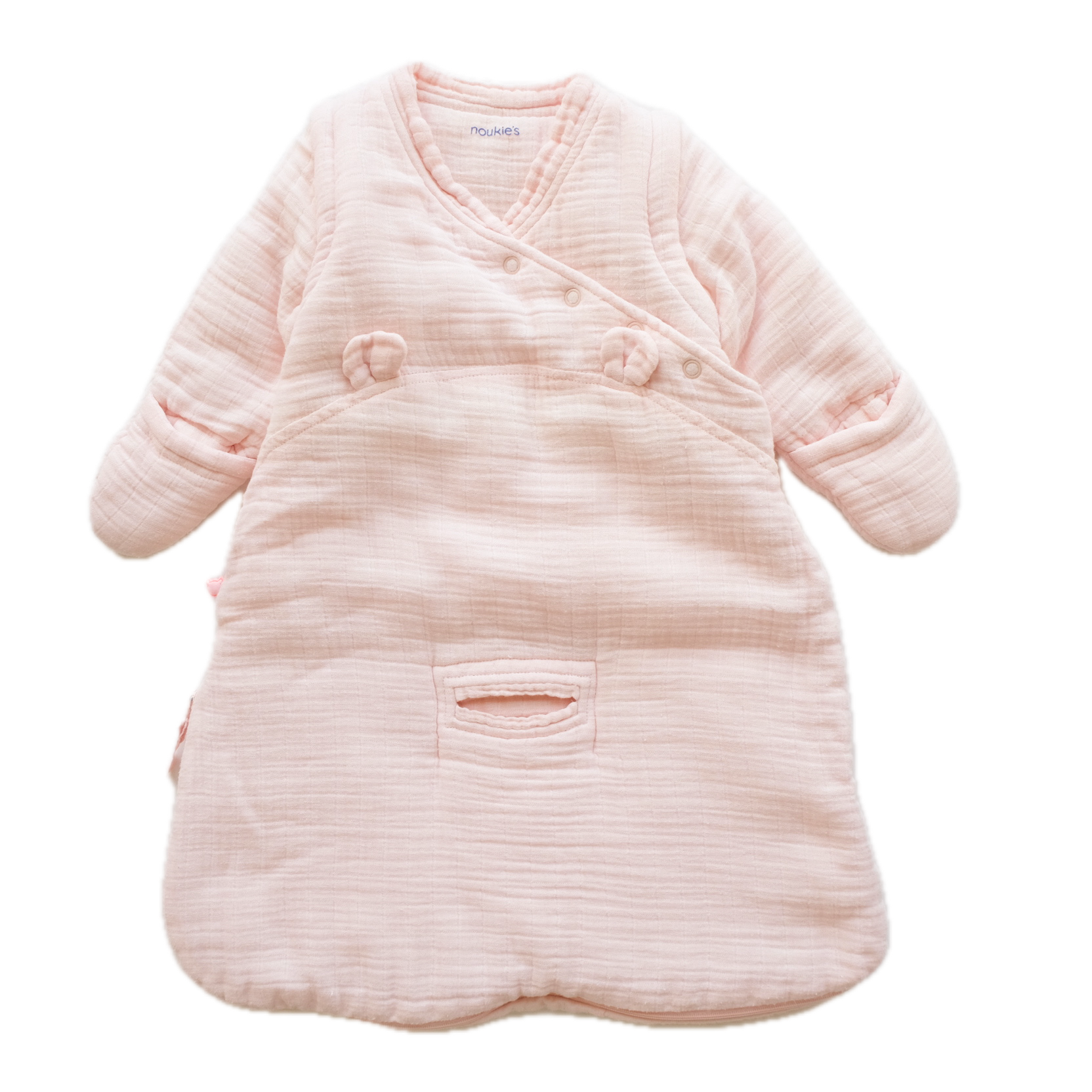 Turbulette, gigoteuse mi-saison en mousseline de coton coloris rose clair uni. Manches amovibles. Empiècement prévus pour couvrir les mains de bébé si besoin. Boutons pressions au devant et zip sur le côté. Mousseline de coton biologique et rembourrage polyester. Gigoteuse nomade avec passant prévu pour la sangle de sécurité du cosy ou poussette.