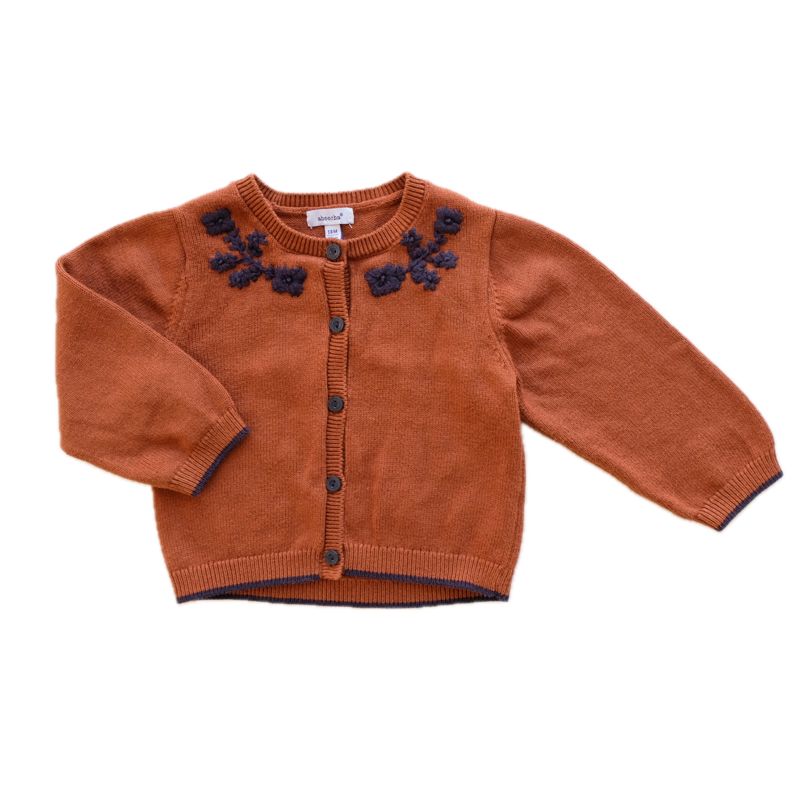Gilet, maille à manches longues en coton, coloris marron et bleu marine. Fleurs brodées très jolies. C'est une taille 18 mois, mais il taille ajusté donc conviendra parfaitement pour un 12 mois. Boutonnière au devant. Très mignon !